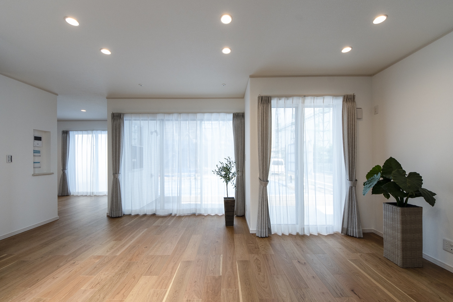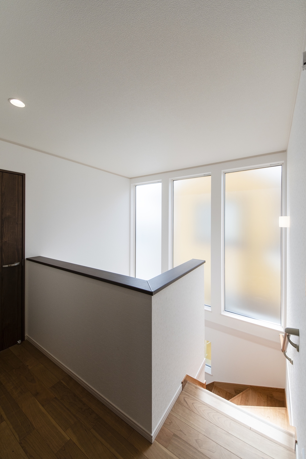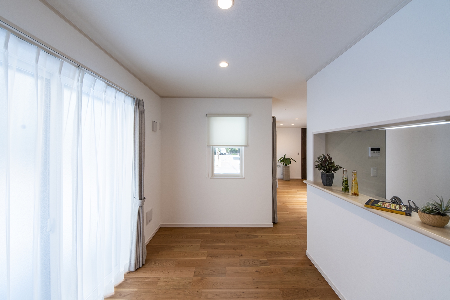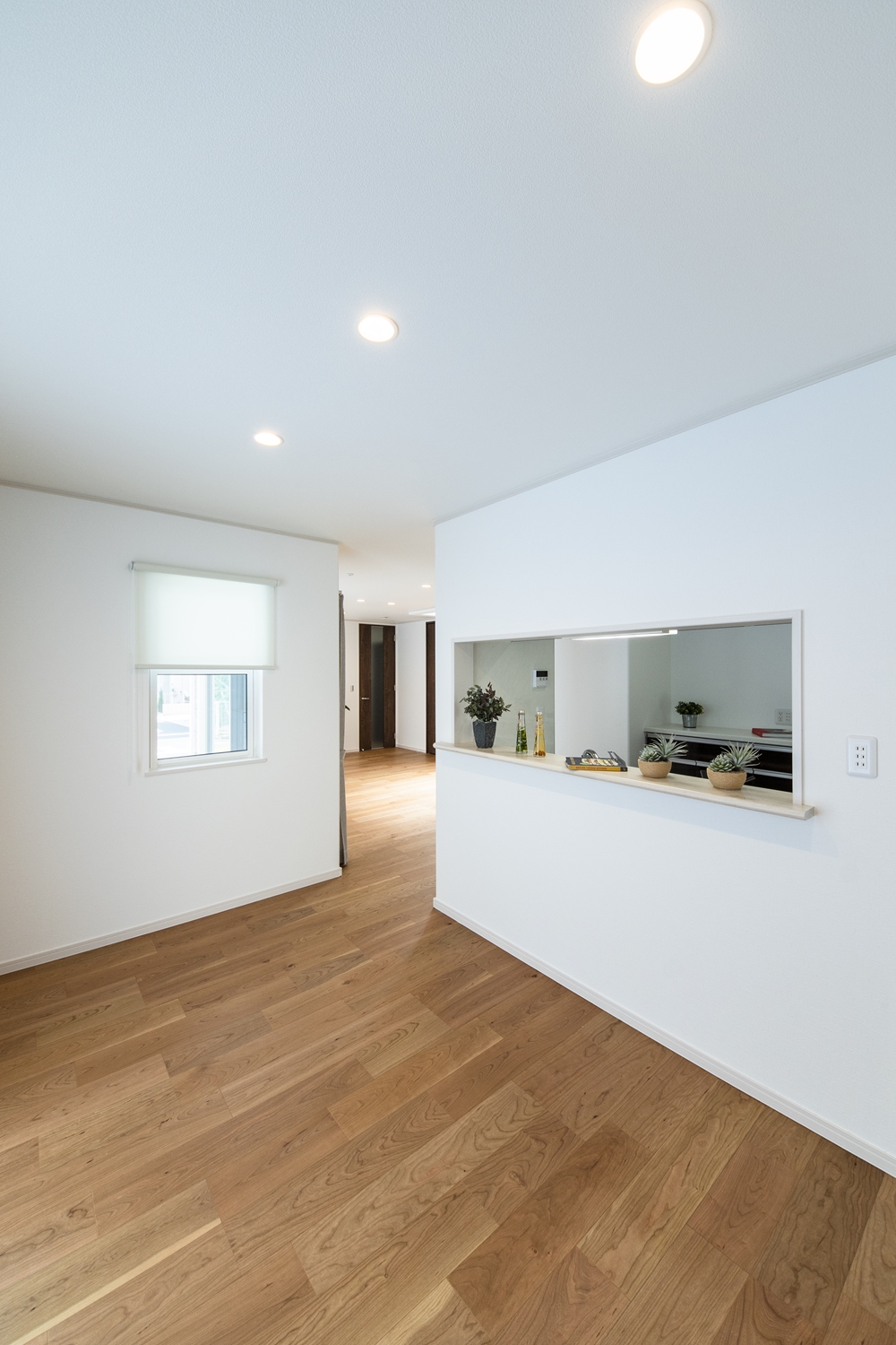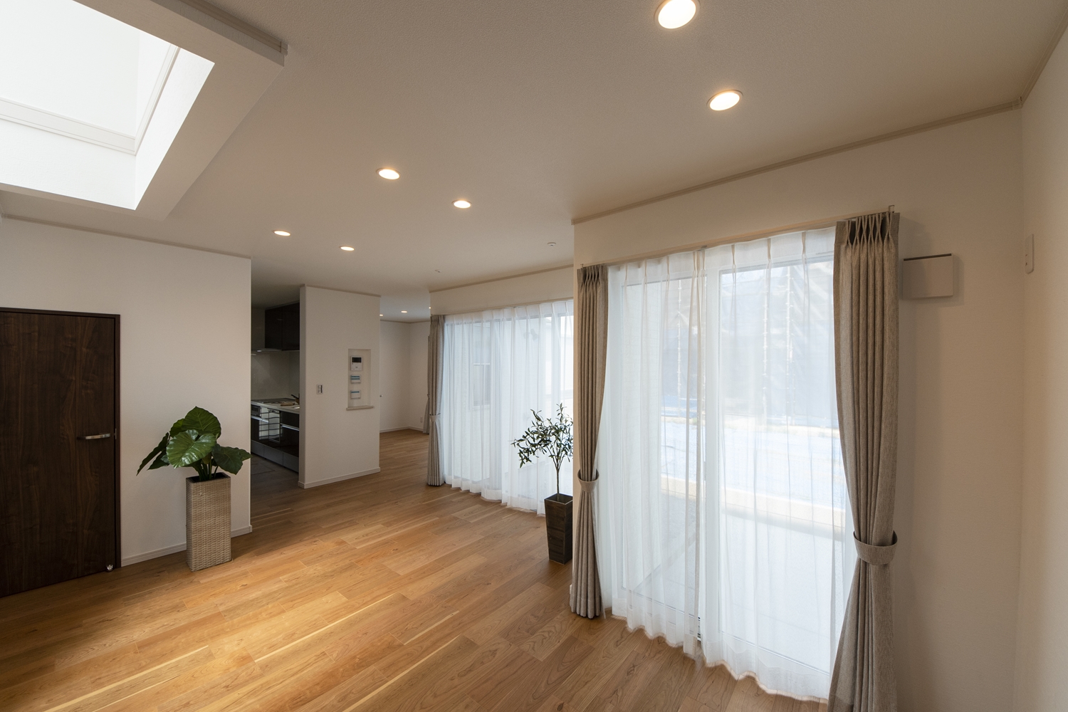 大きめの窓を配置することで、自然の光を採り入れ明るさを確保し、照明はダウンライトをメインに。