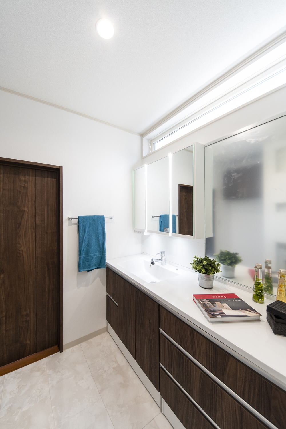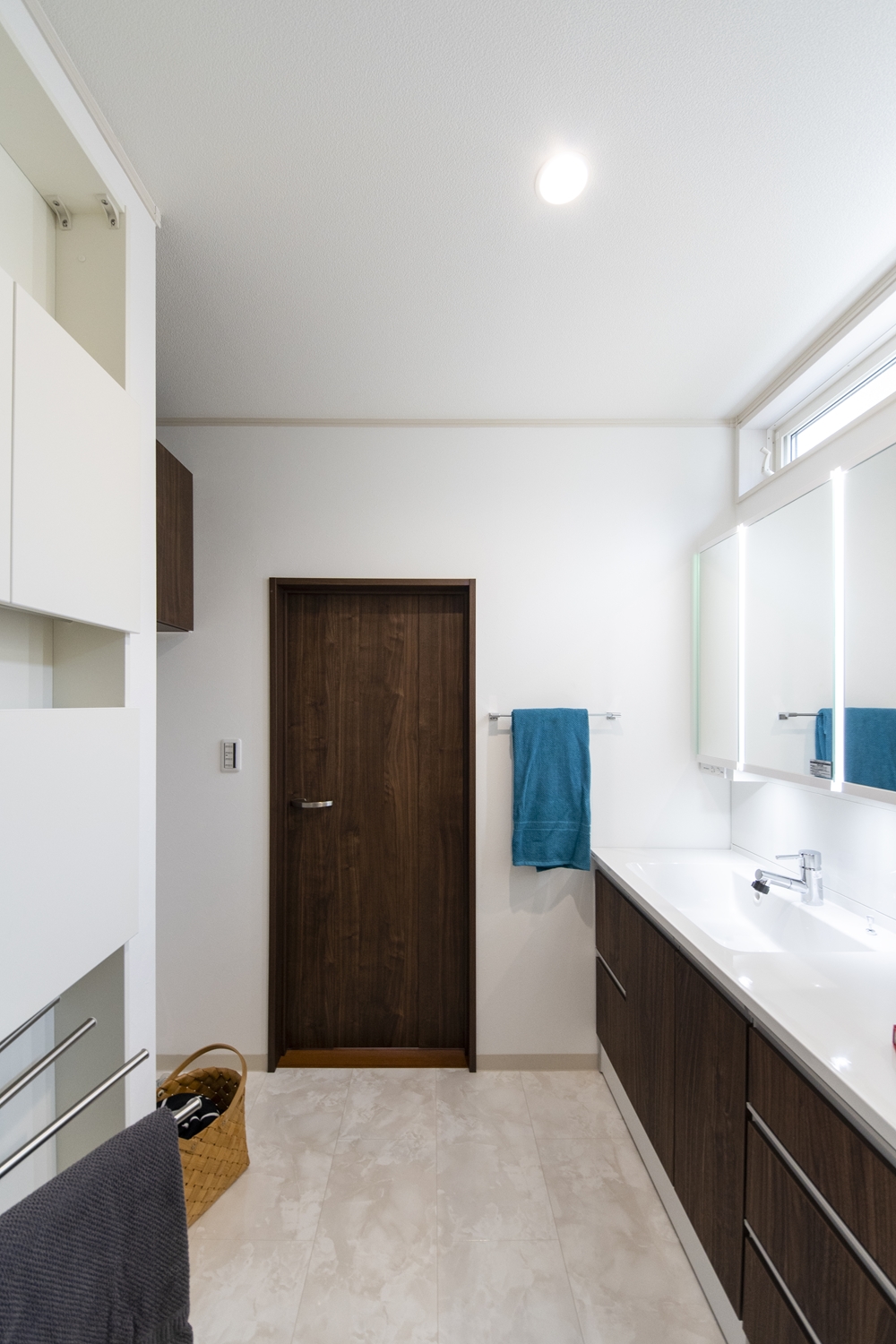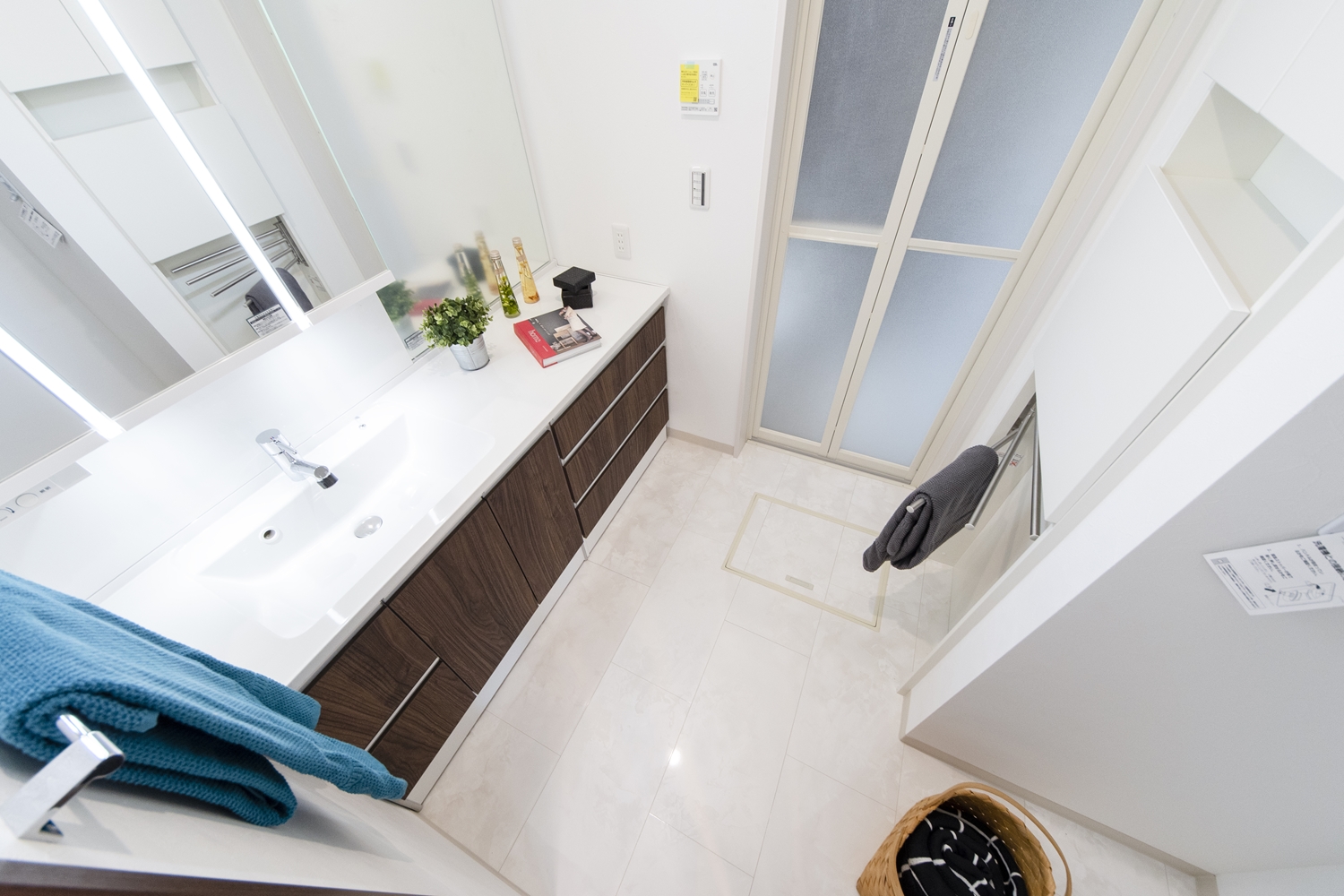 白を基調とした清潔感のあるサニタリールーム。汚れや水に強い大理石柄のフロアを施しました。