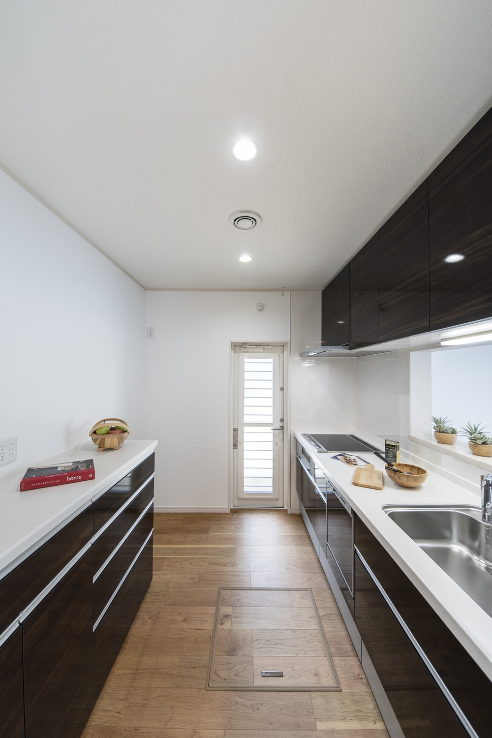 美しい光沢を放つキッチン扉は、上品なダーク木目デザインです。
