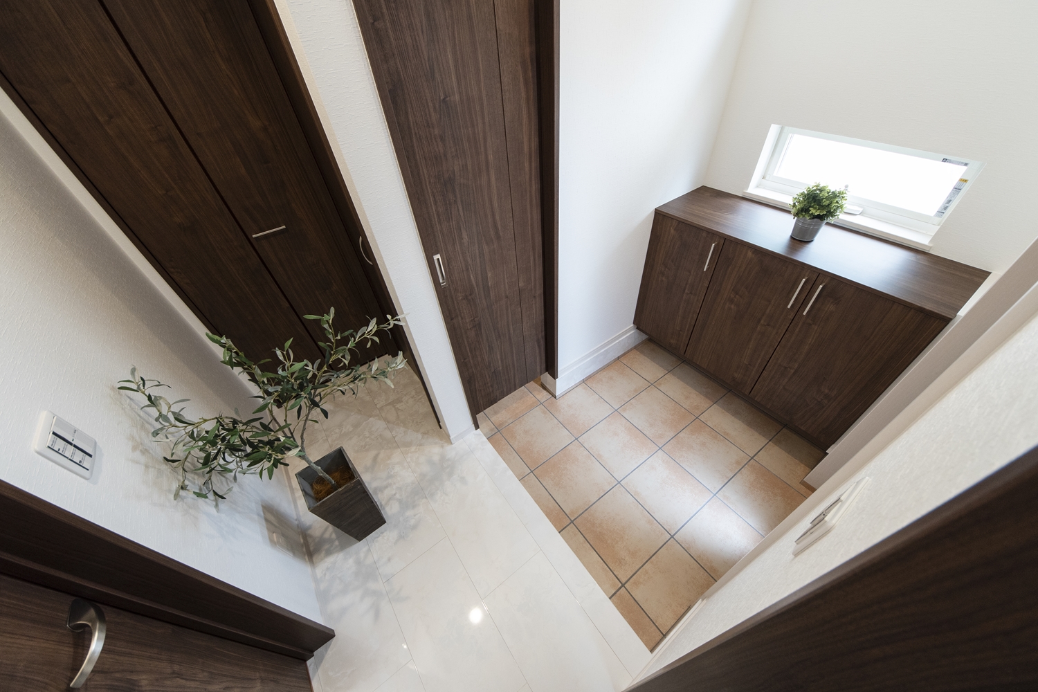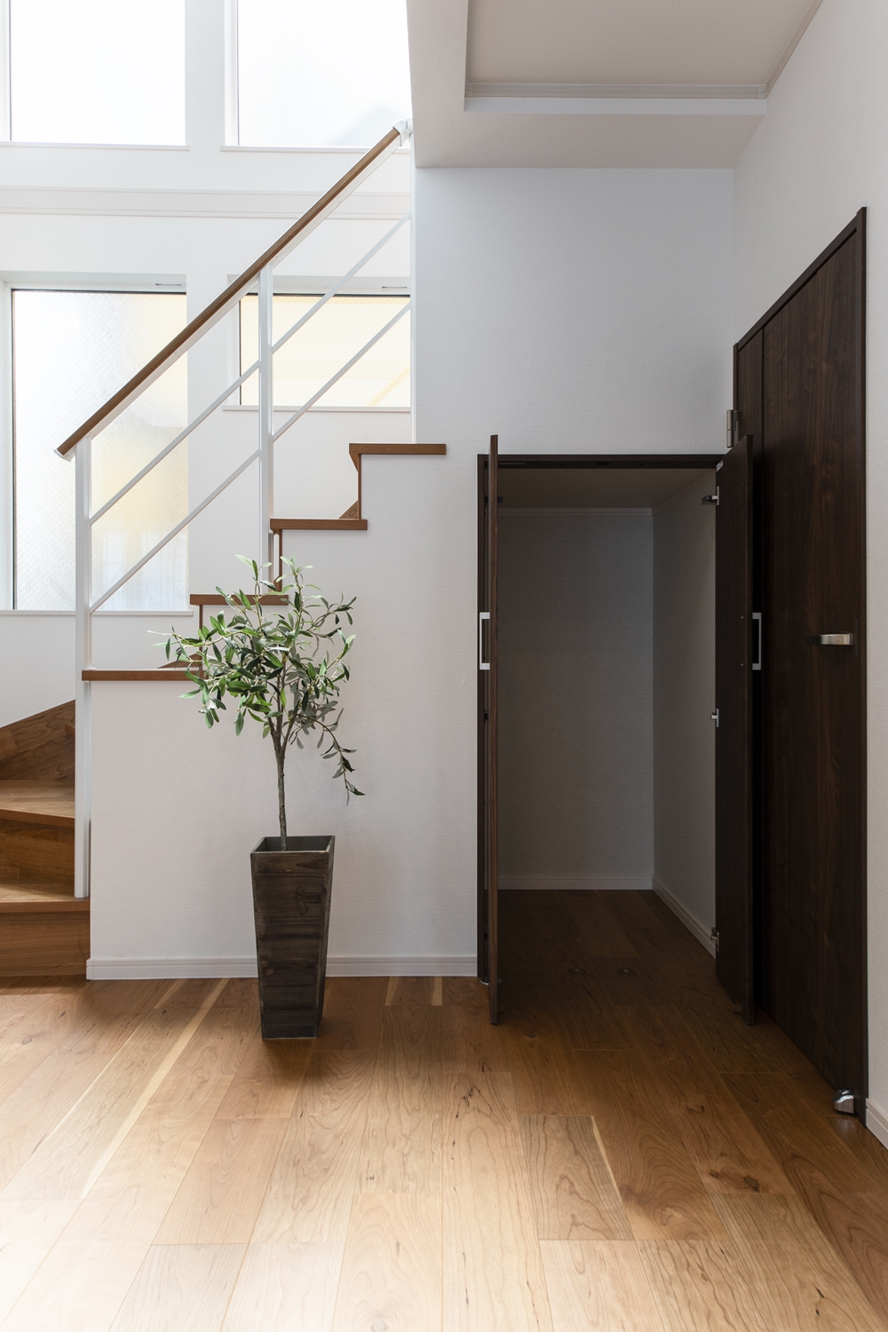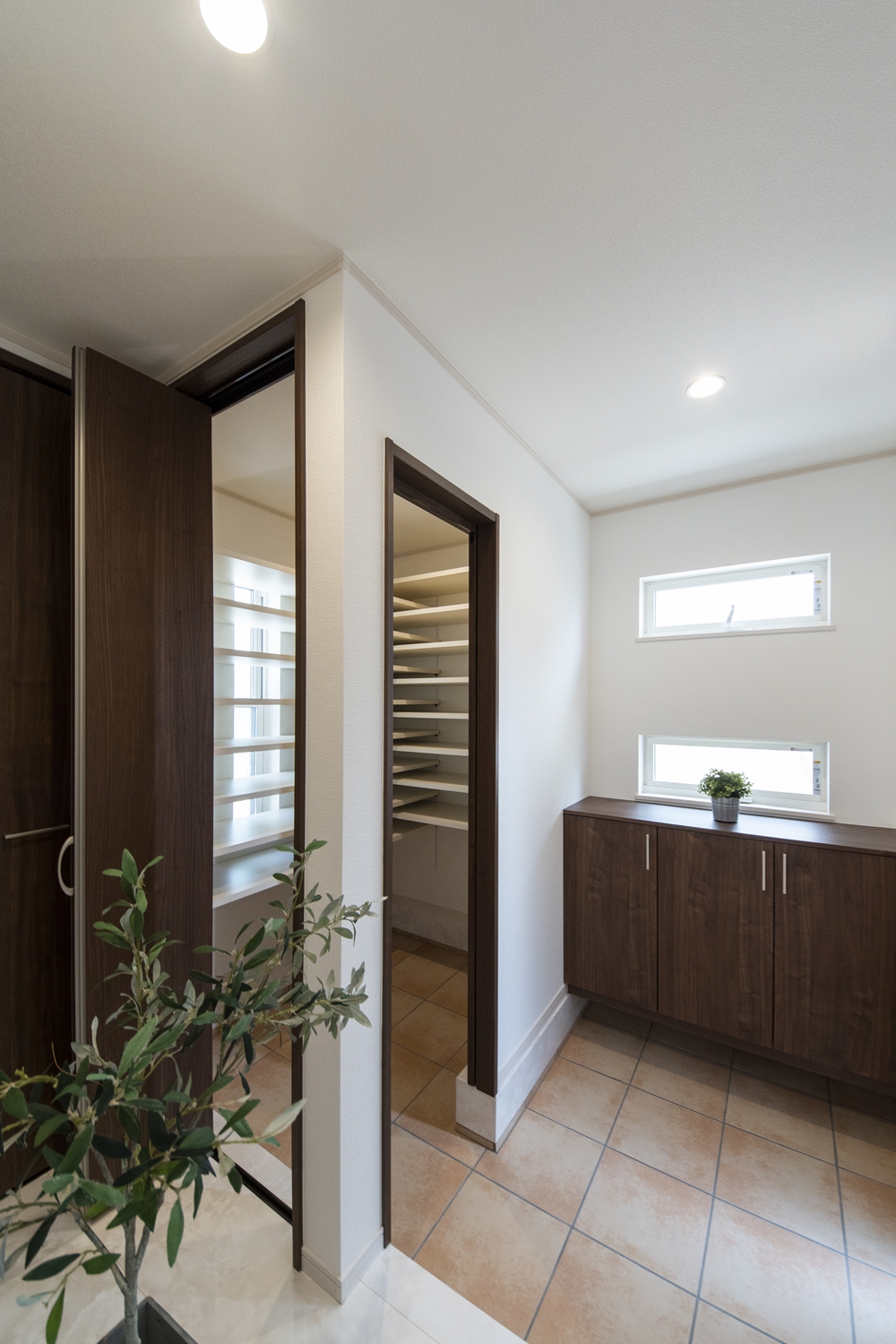 靴はもちろん、スポーツ用品、アウトドアグッズなどの収納に便利なシューズクロークを備えた機能的な玄関。