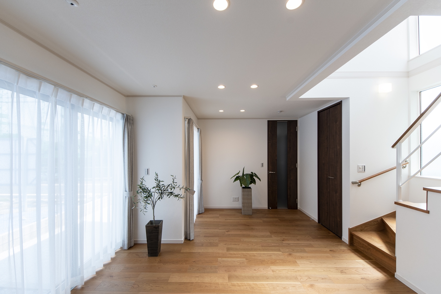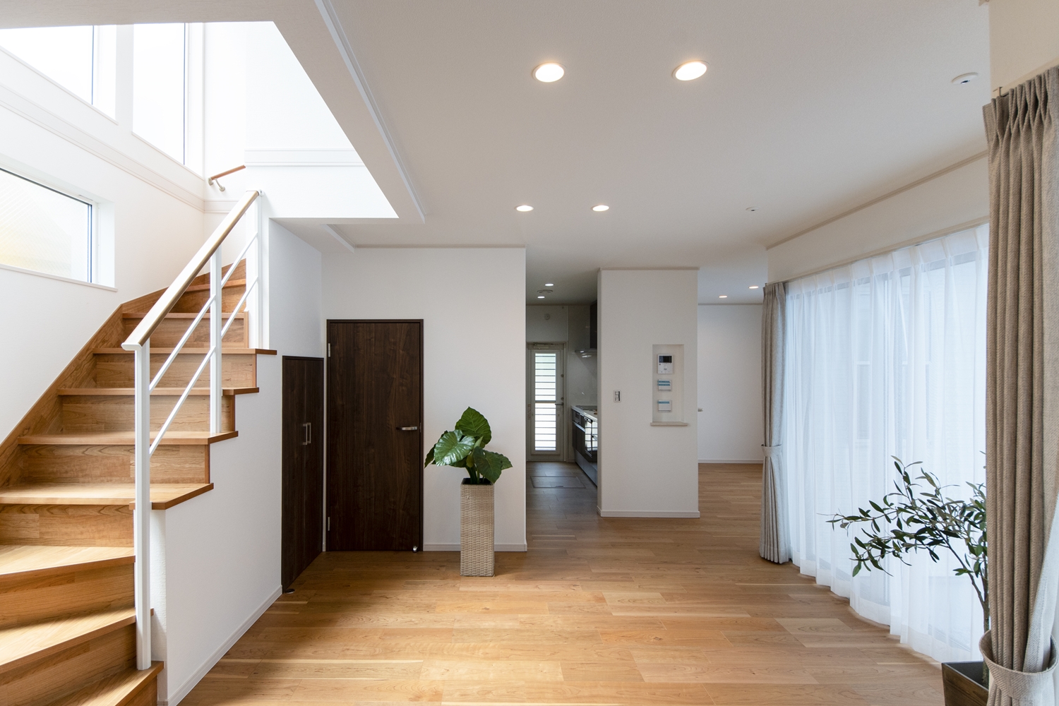 吹抜けから明るい光が差し込み、窓から自然な風が入り込む、明るく開放感のあるリビング。