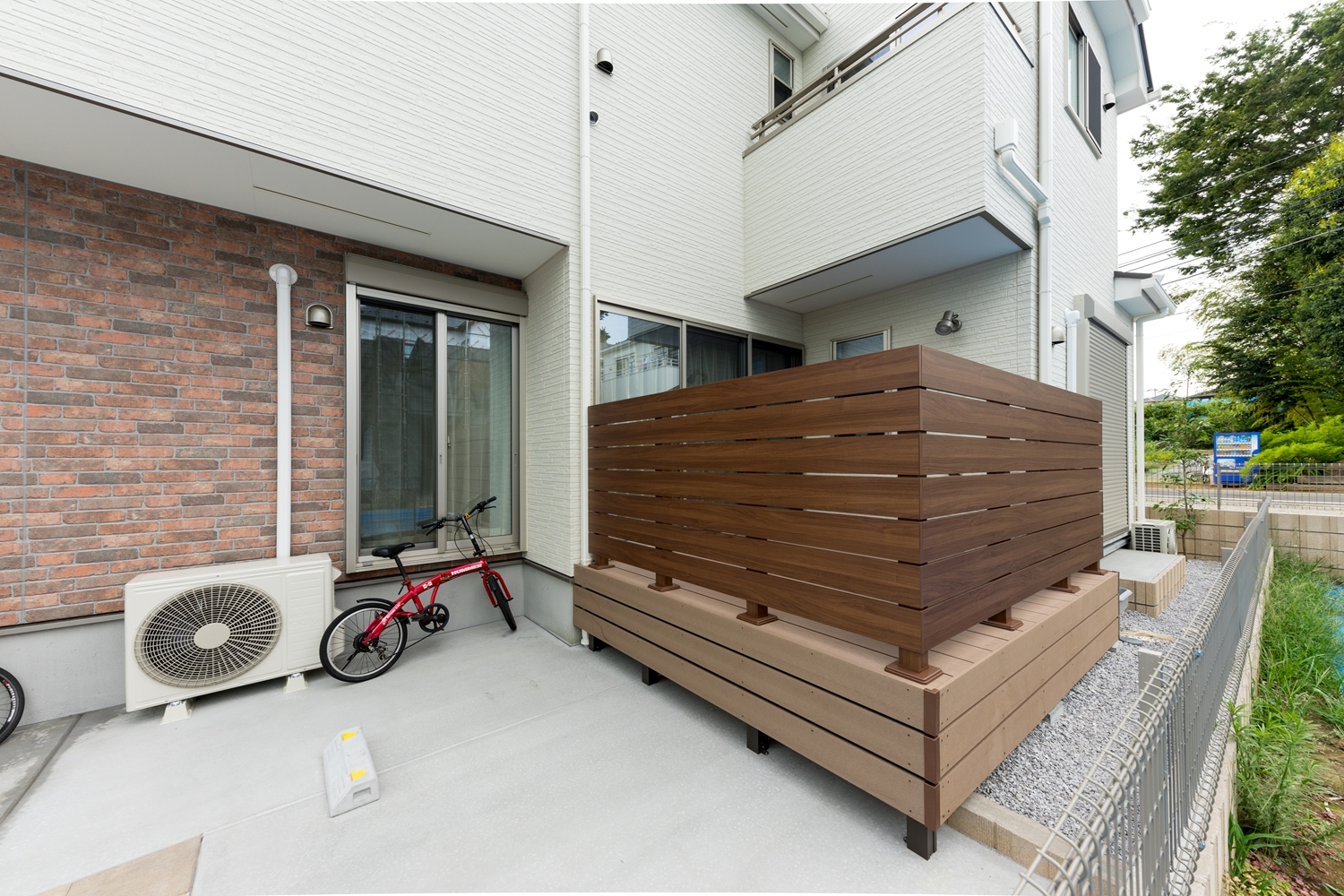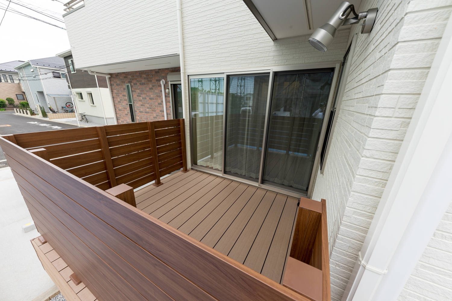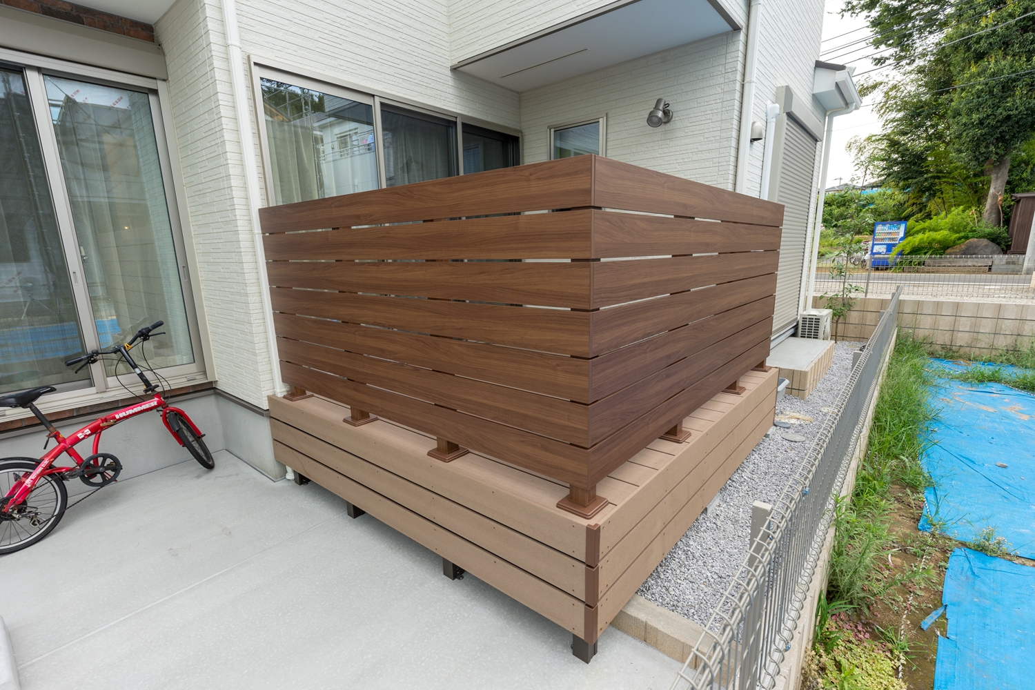 ウッドデッキ/光と風を存分に通しながらプライバシーを守る、木目デザインのフェンスを施しました。