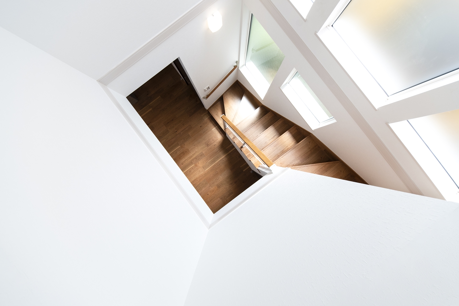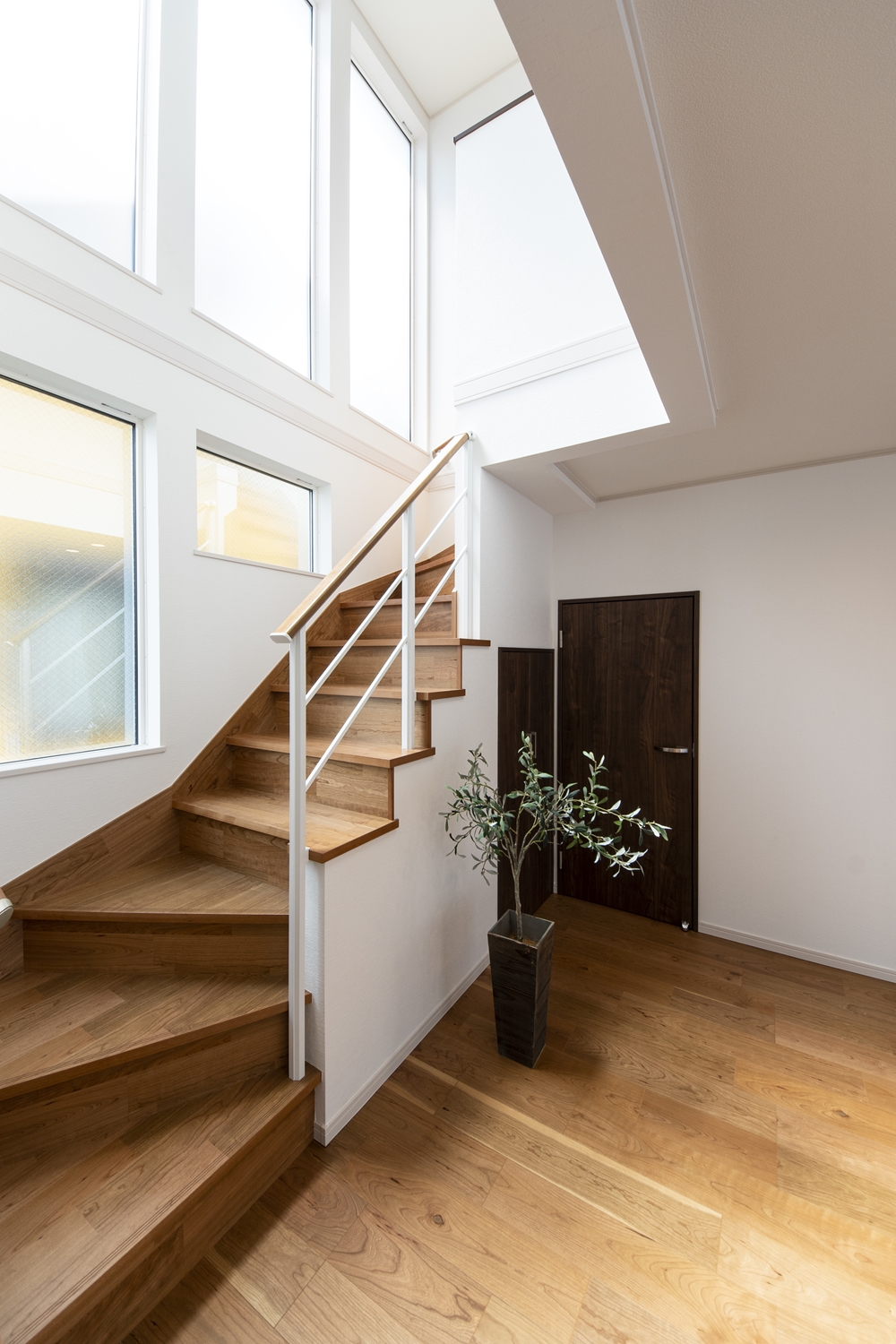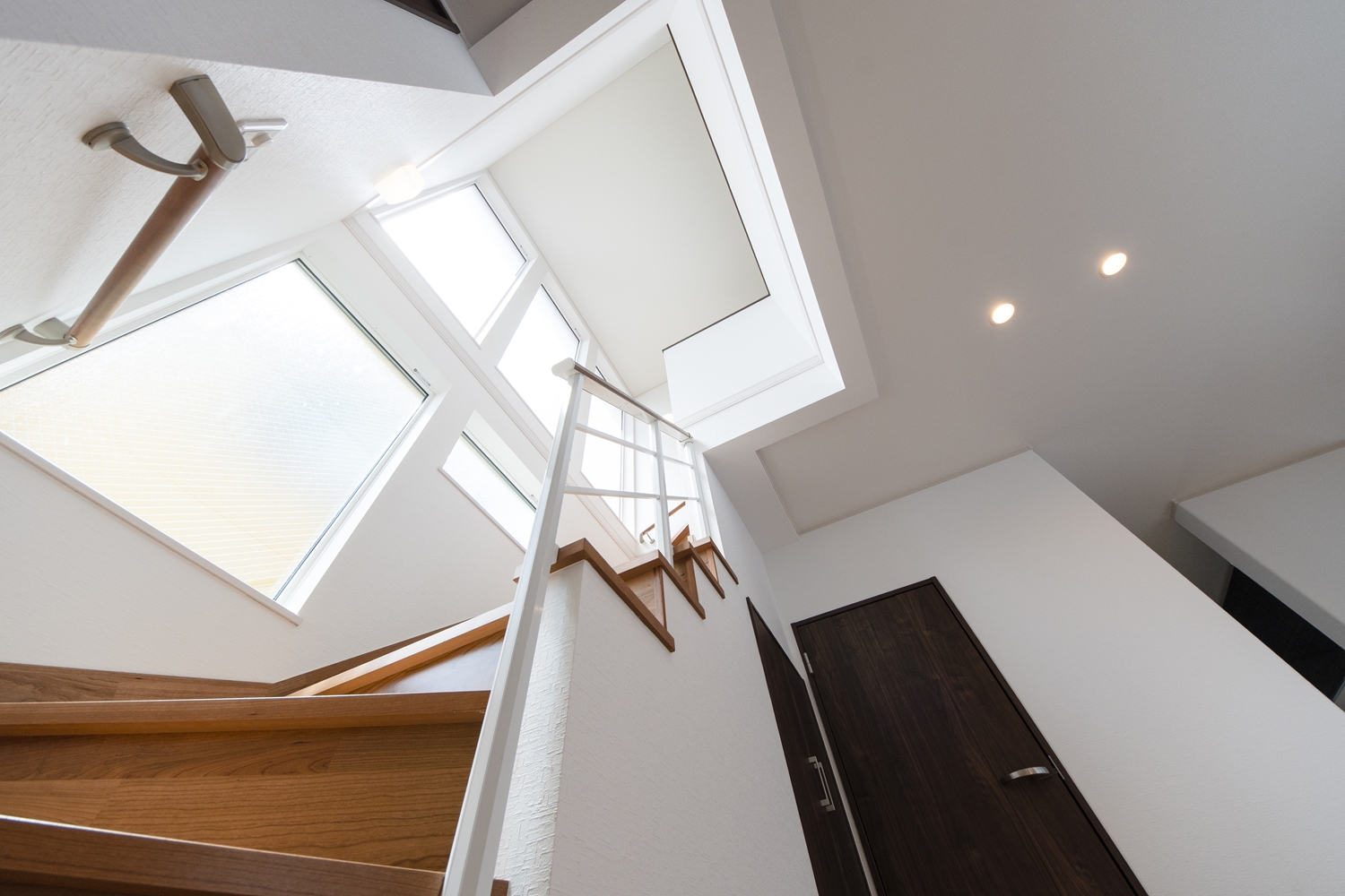 上階からの明るい光が差し込む、光と風が演出する心地よい吹抜け空間。