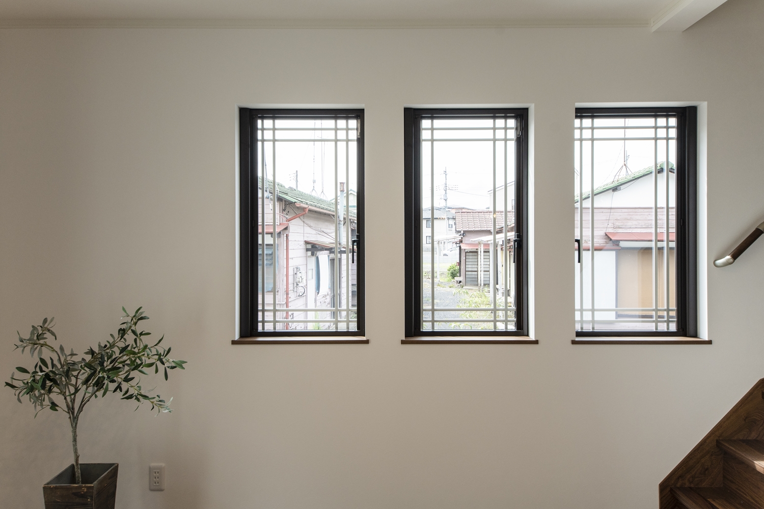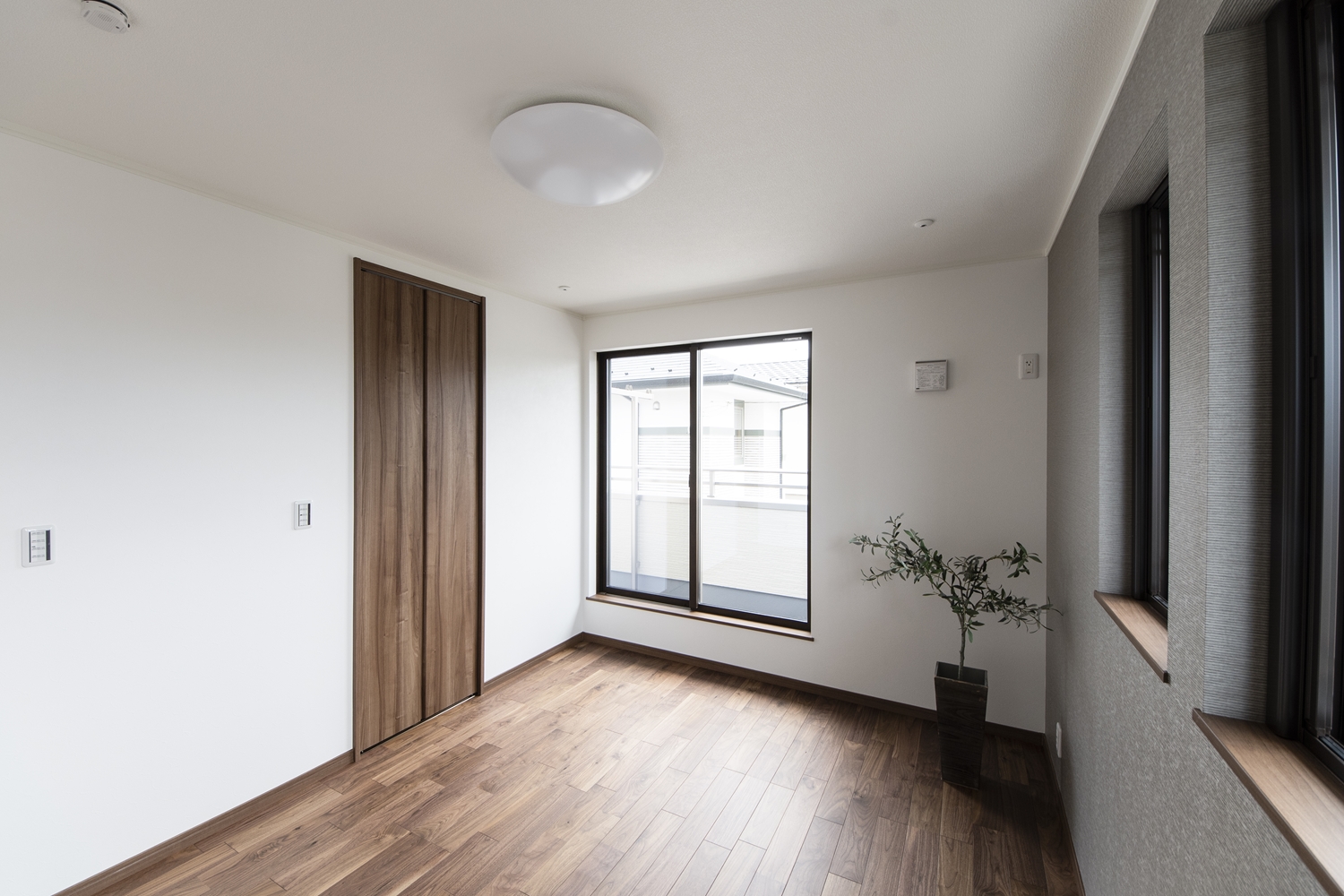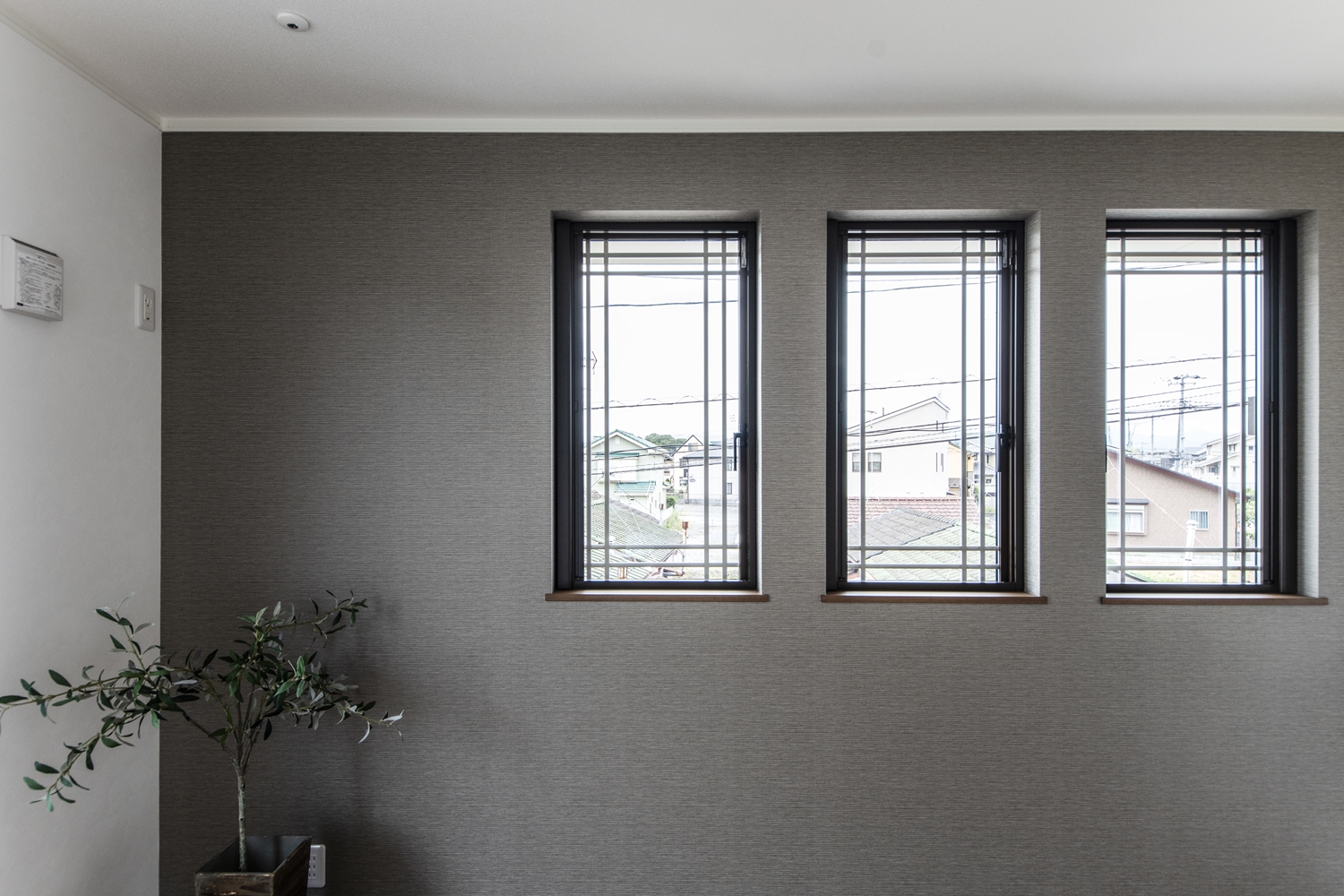 2階洋室/サイドに格子の入った窓を3連に並べた、洋風な雰囲気のおしゃれな空間。
