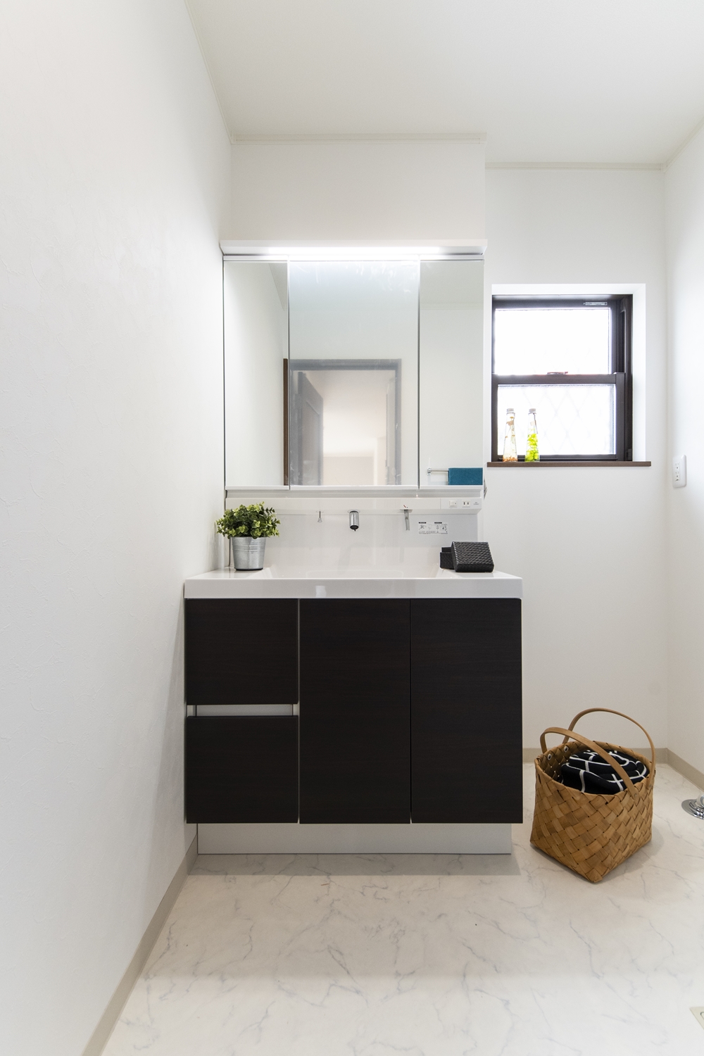 白を基調とした清潔感のあるサニタリールーム。洗面化粧台扉カラーをダークブラウンでアクセントにしました。