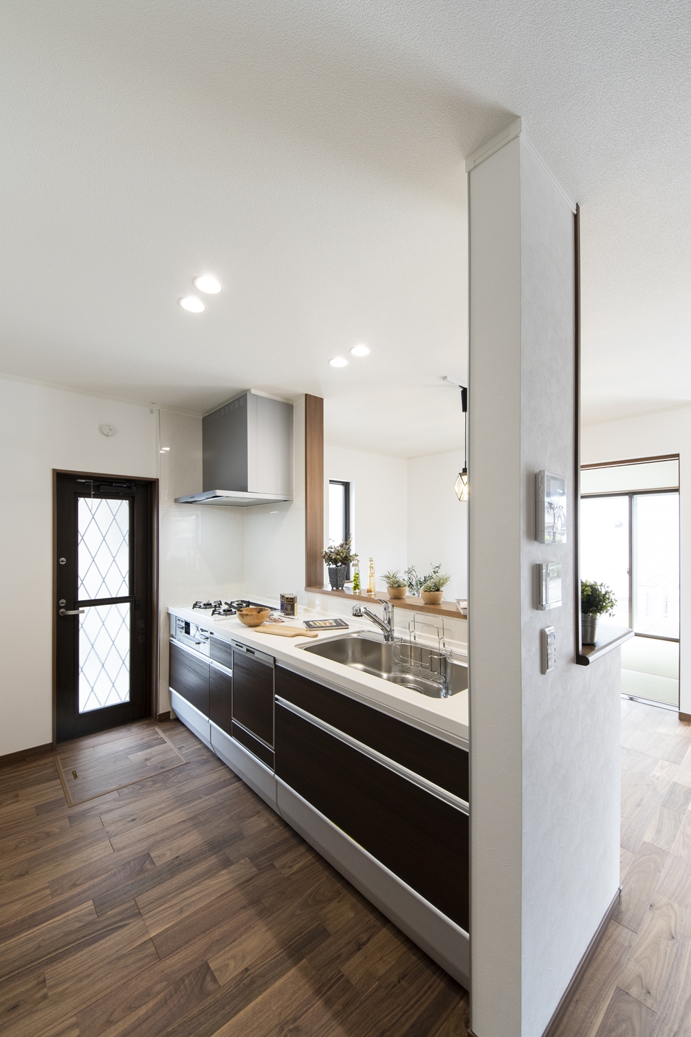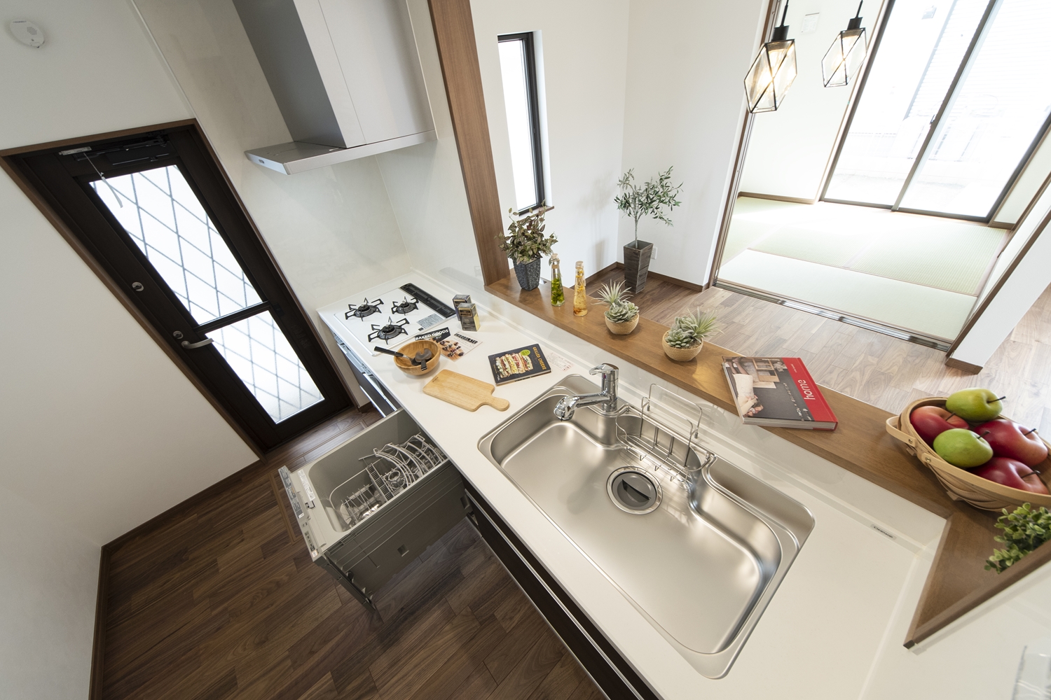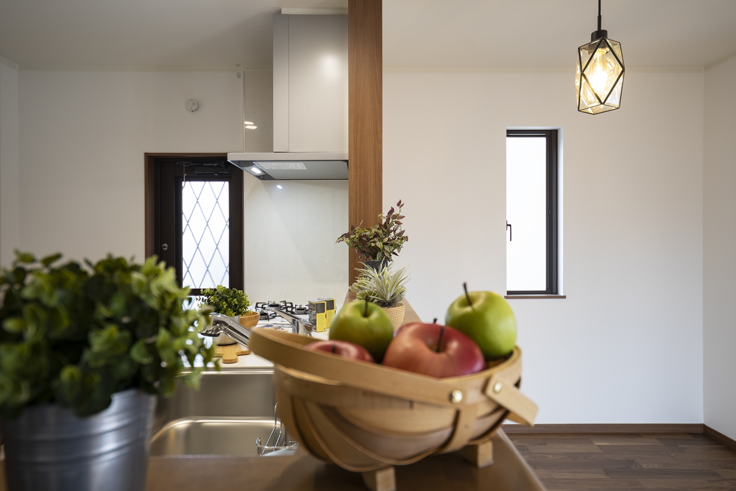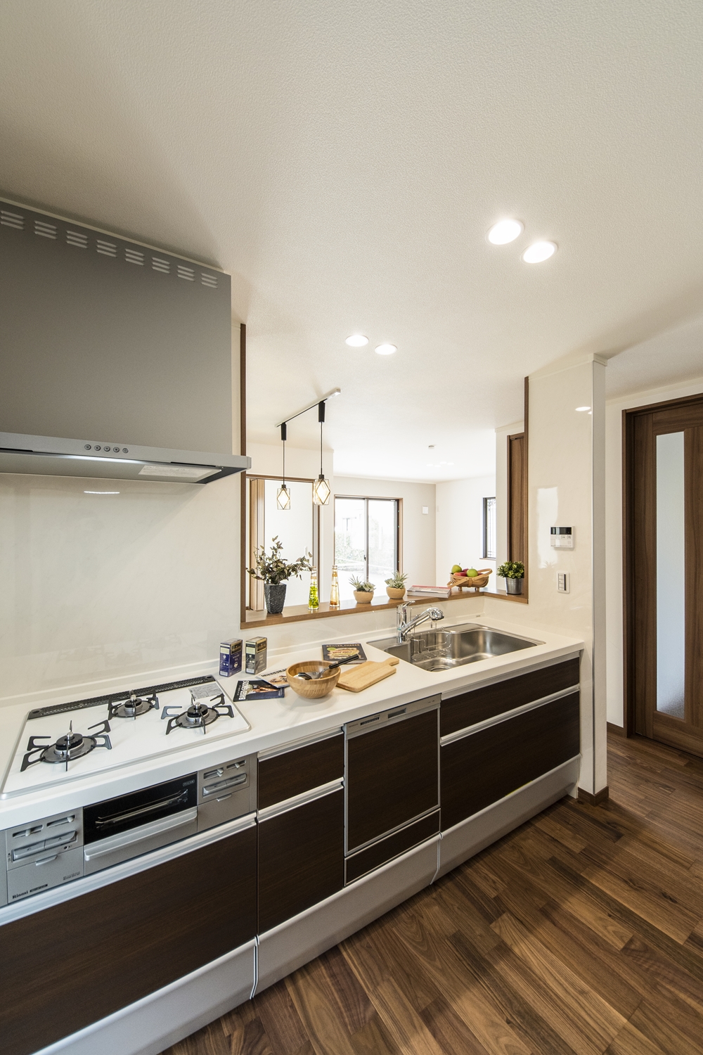 家族のコミュニケーションをはぐくむ対面式キッチン。キッチンカウンターにはアイテムを飾ったりインテリアも楽しめます♪