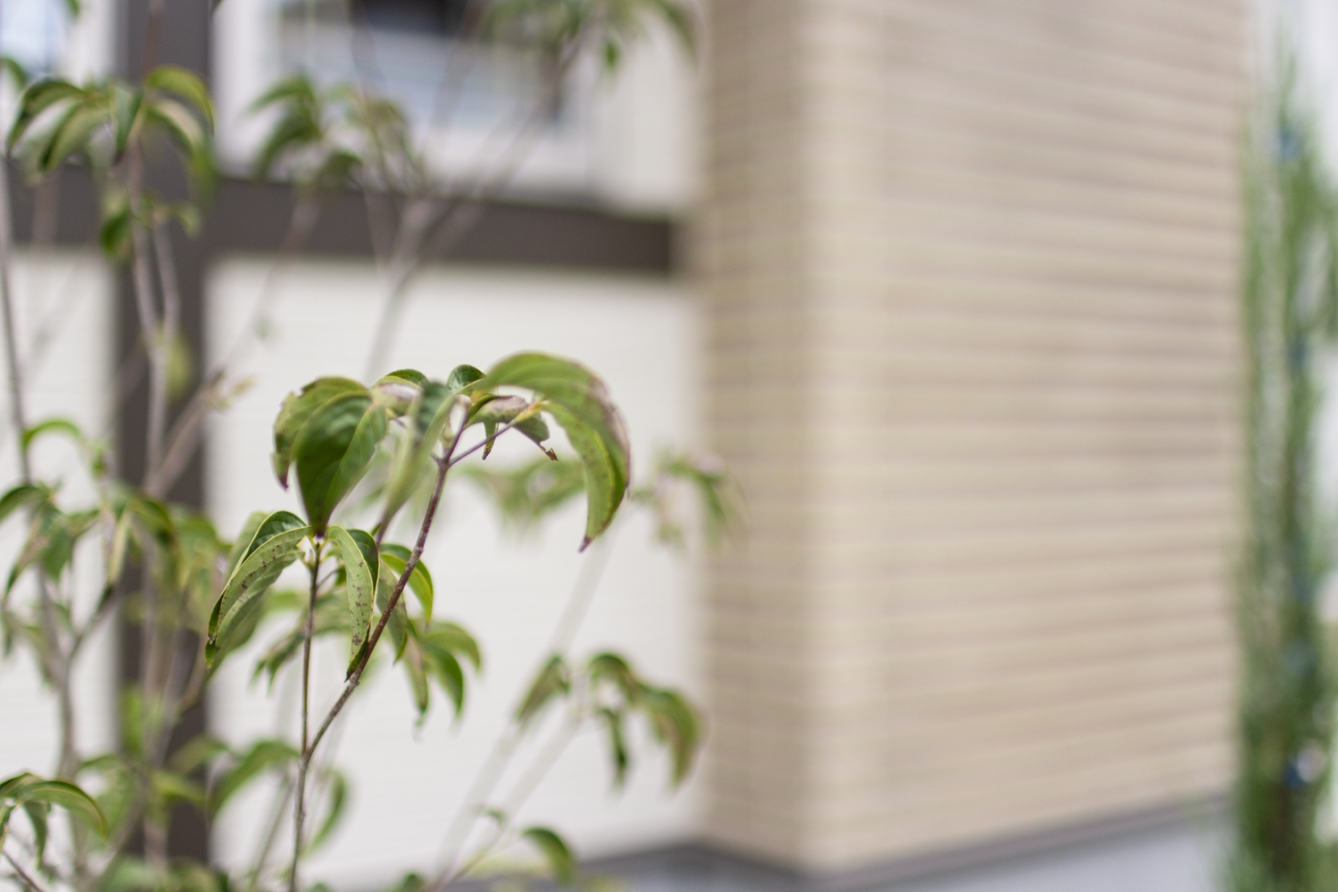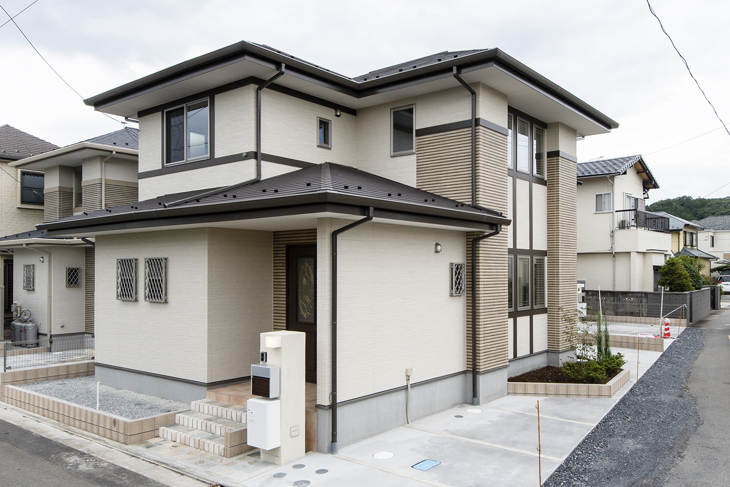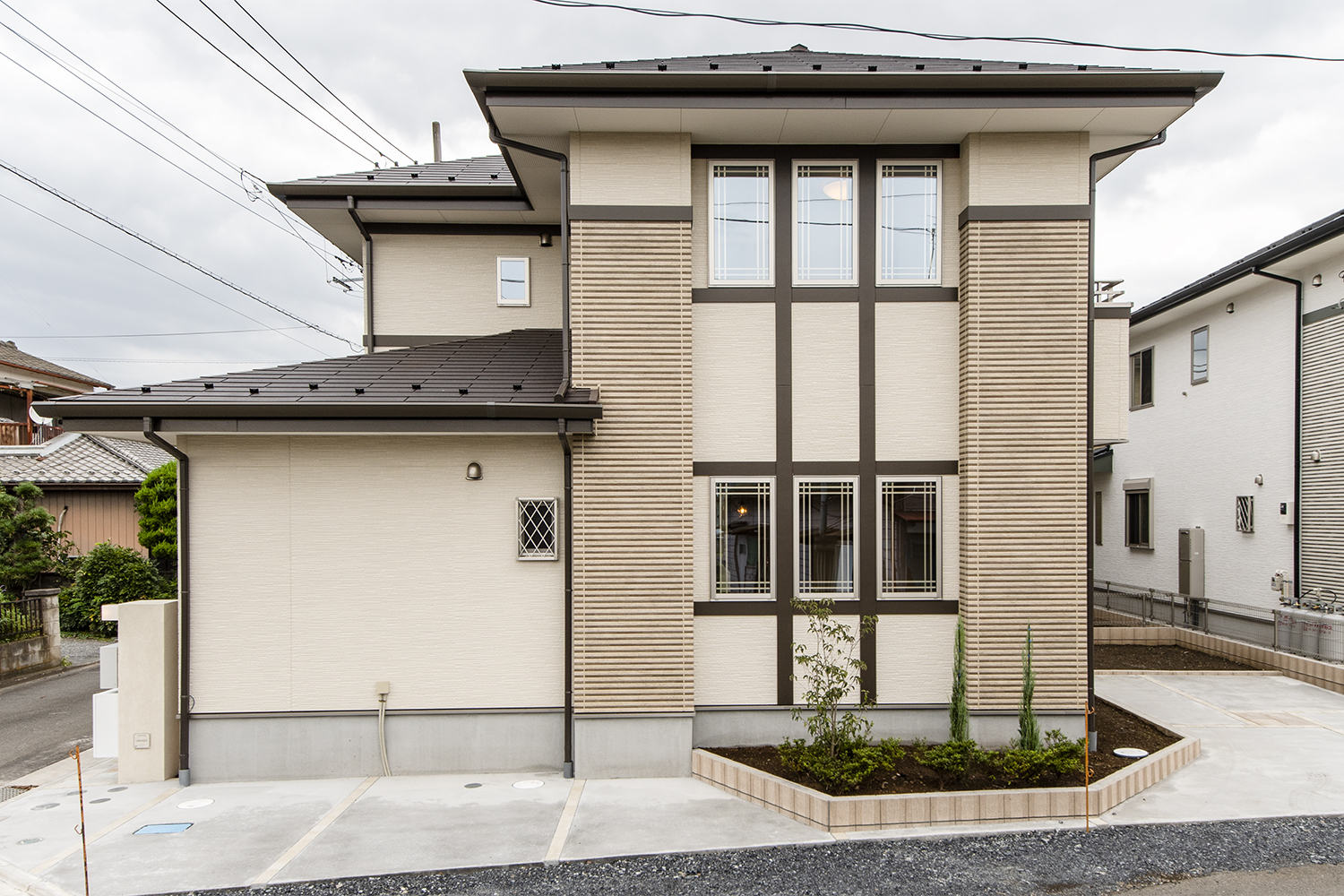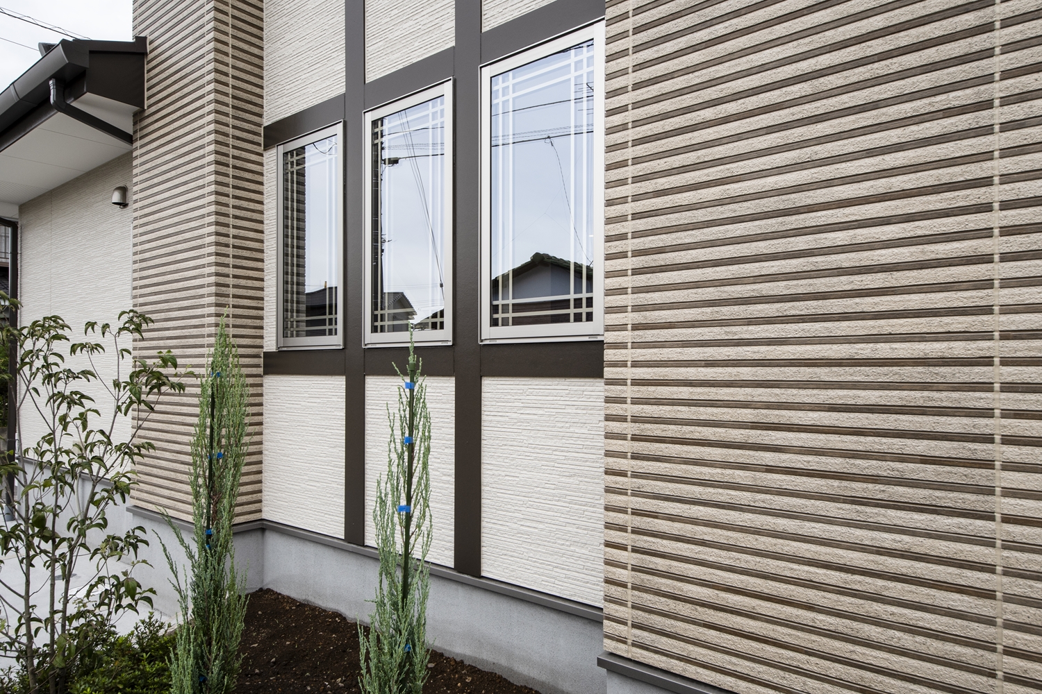 サイドに格子の入った窓を3連に並べた、おしゃれな洋風スタイル。