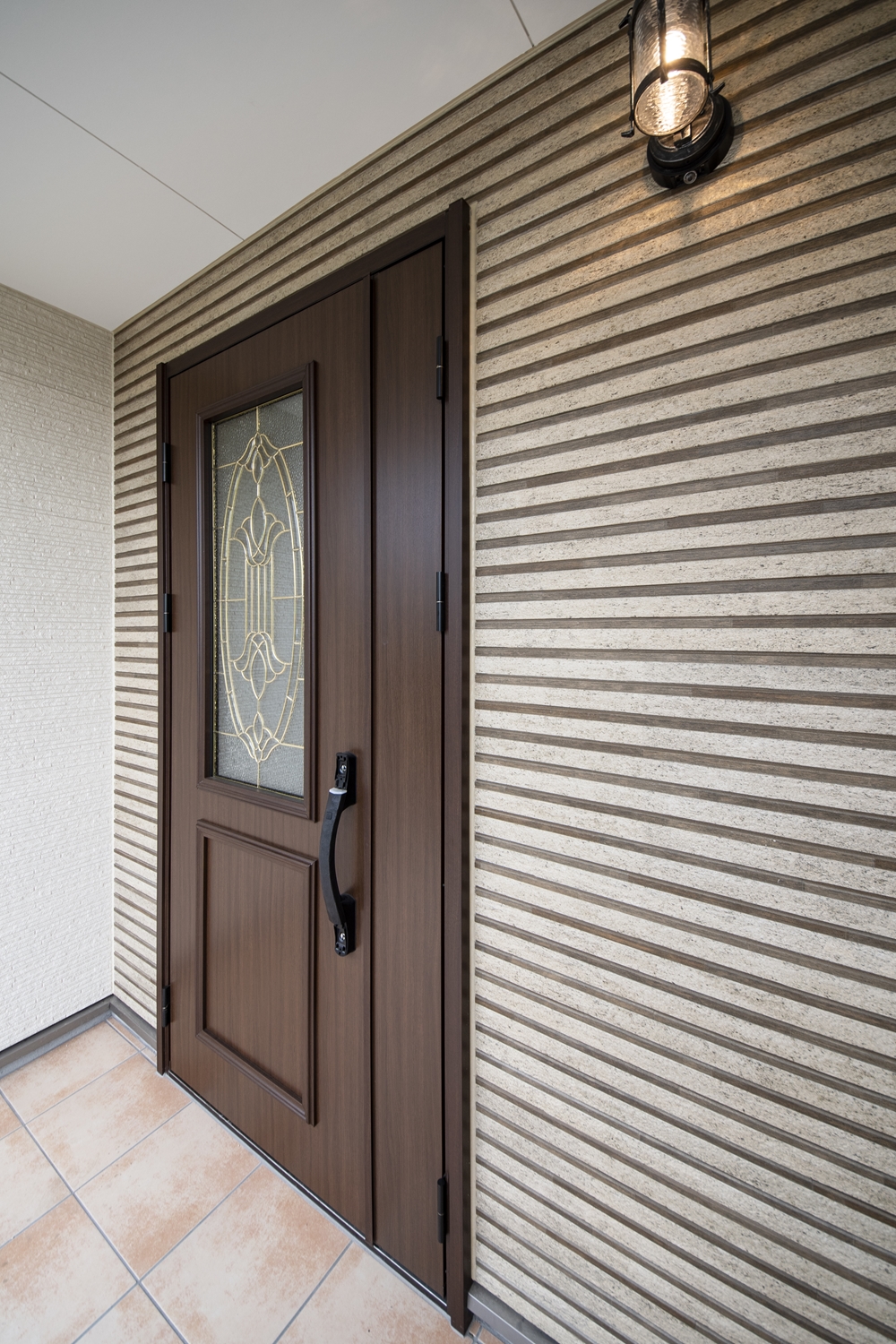 スタイリッシュなボーダーデザインの外壁に、ステンドガラスの玄関ドアを施した、おしゃれな洋風エントランス。