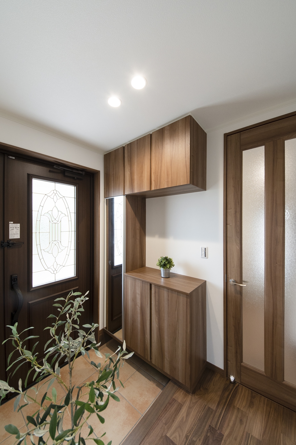 シューズクロークを設えた便利な玄関。木の温もりを感じる落ち着いた印象の玄関です。