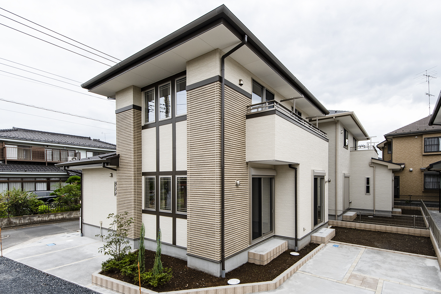 スタイリッシュなボーダーデザインのブラウン系外壁をアクセントにして、縦横にラインを入れた、ブリティッシュスタイル。