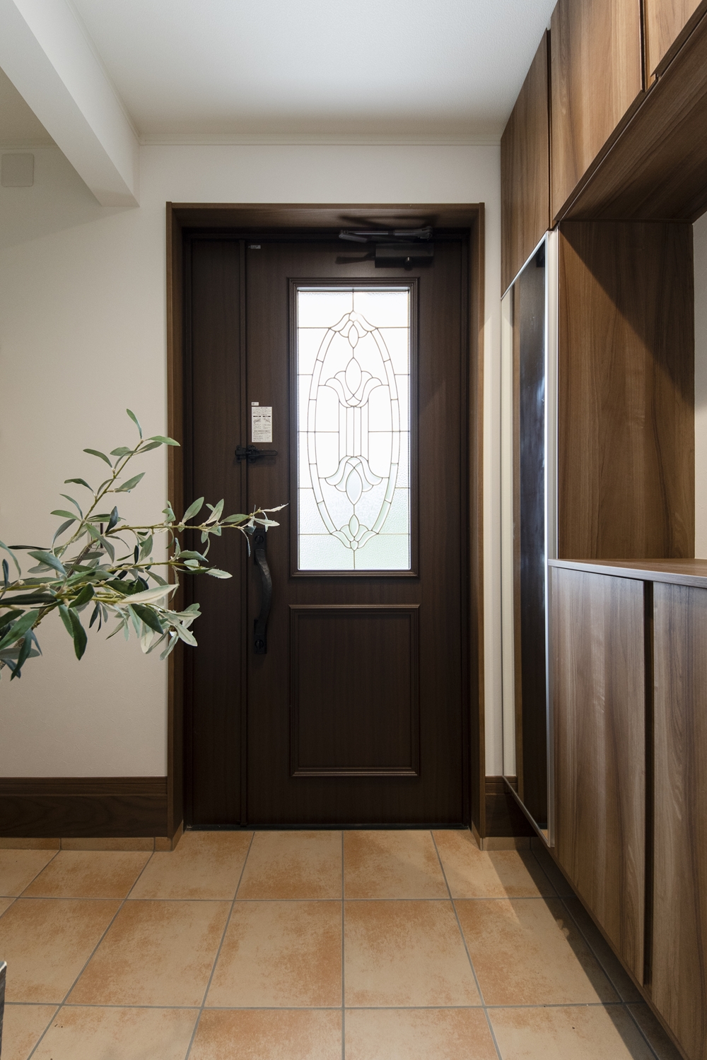 ステンドガラスが目を惹く、上質で重厚感漂う玄関ドア。