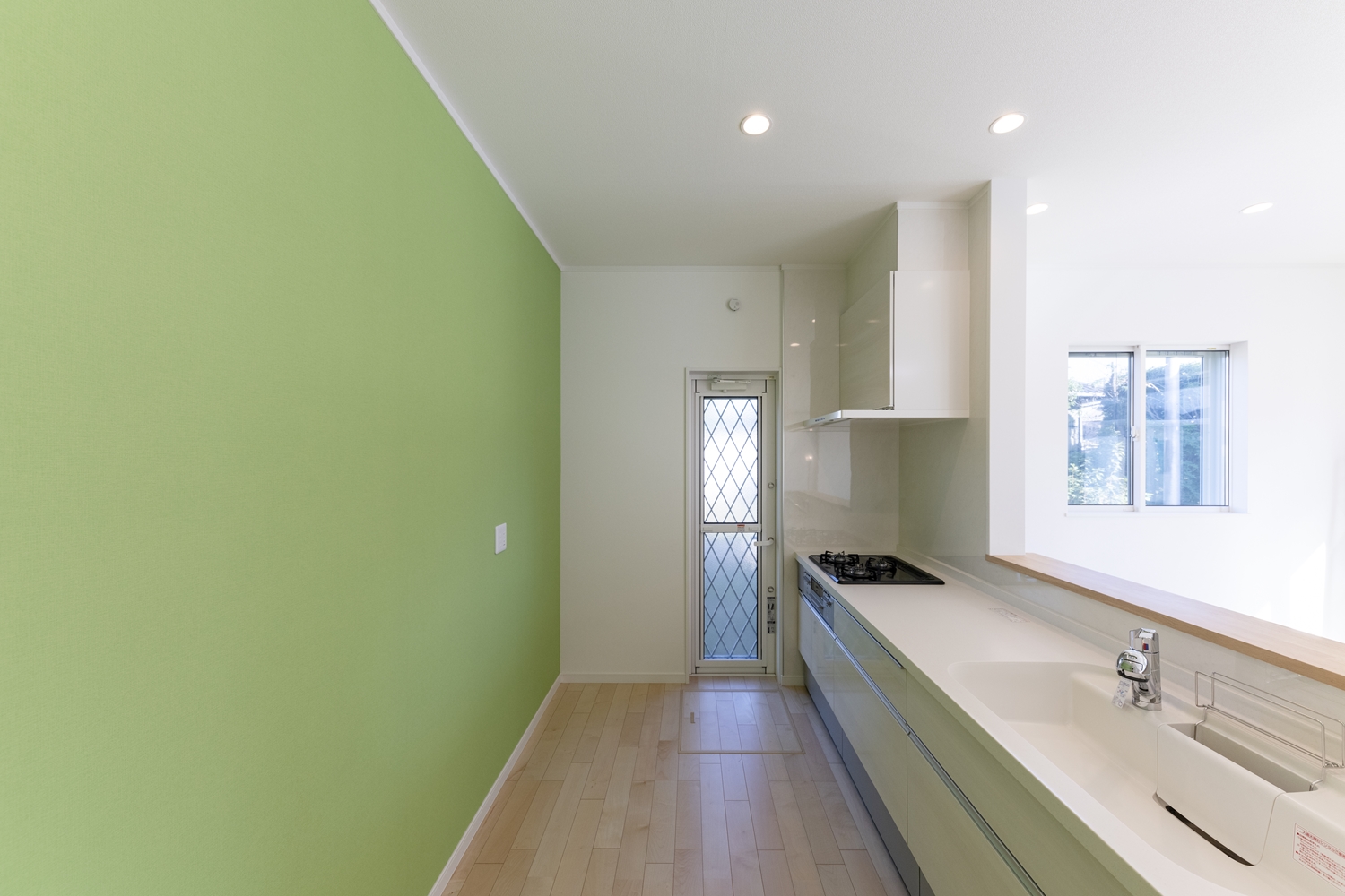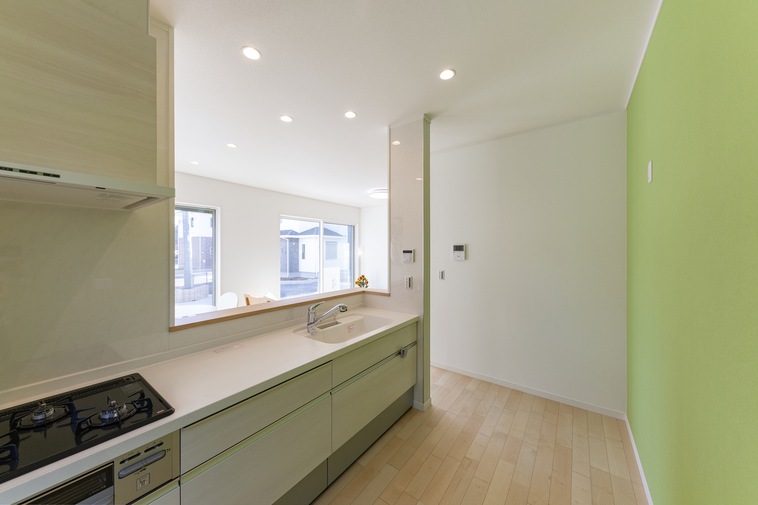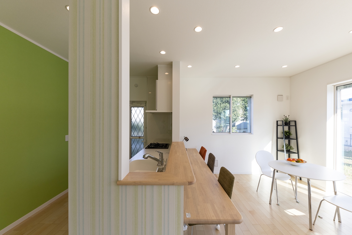 キッチン周りにグリーン系のクロスをアクセントにした、明るく爽やかな空間。