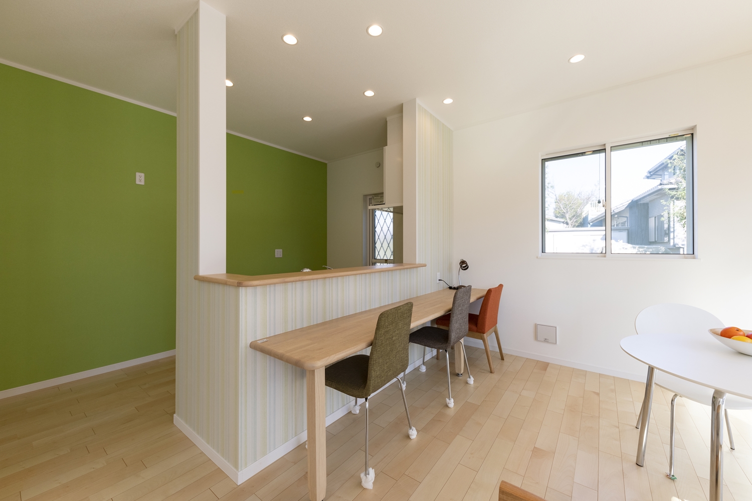 キッチン前のカウンターは奥行きを広く取り、ちょっとした食事や、お子様の勉強やPCコーナーとして使える嬉しい場所。