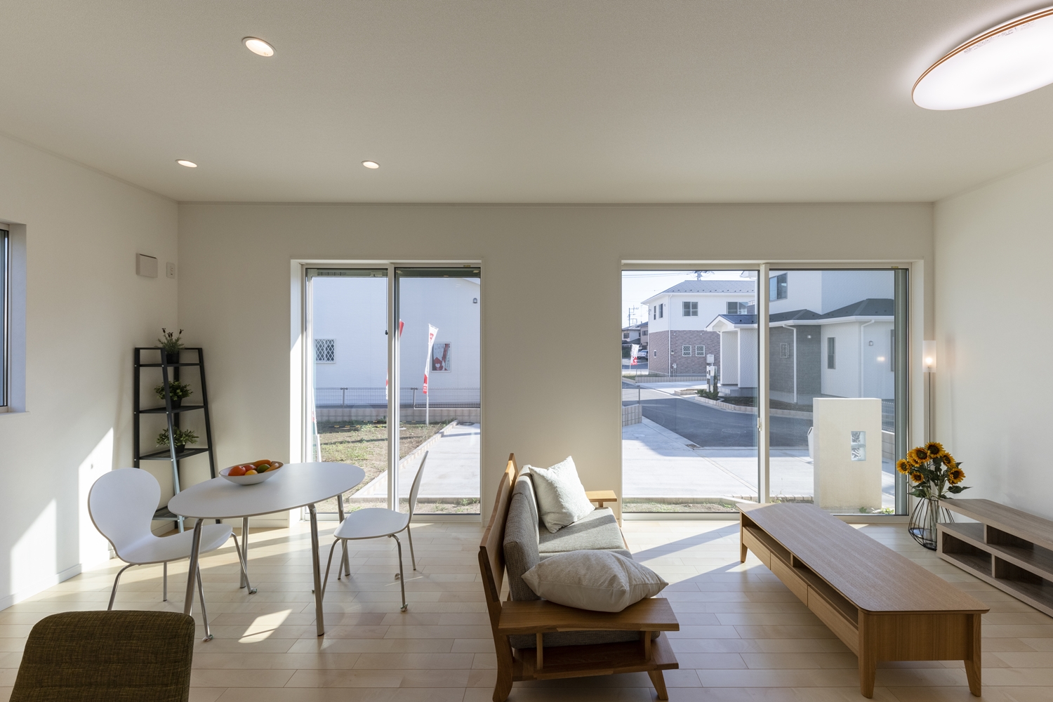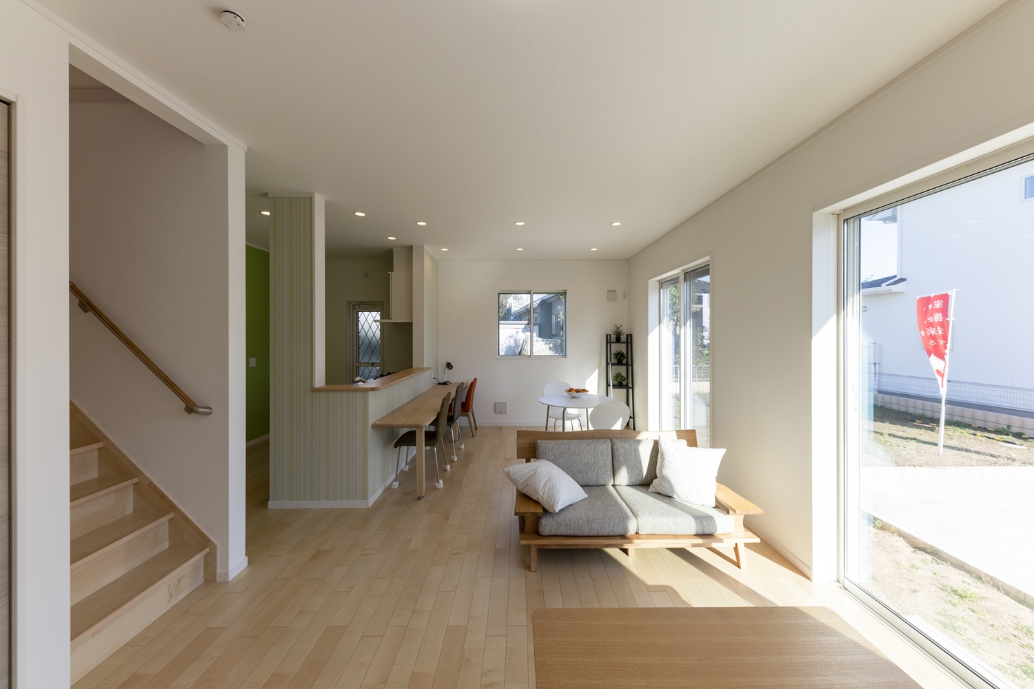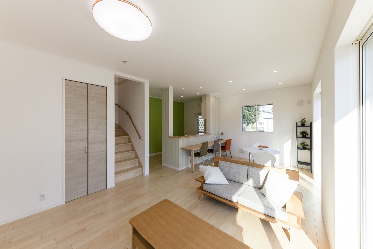 ハイスタッド仕様で天井が高く、大きな窓から自然のやさしい光が降り注ぐ、明るく開放的なLDKのご紹介です。