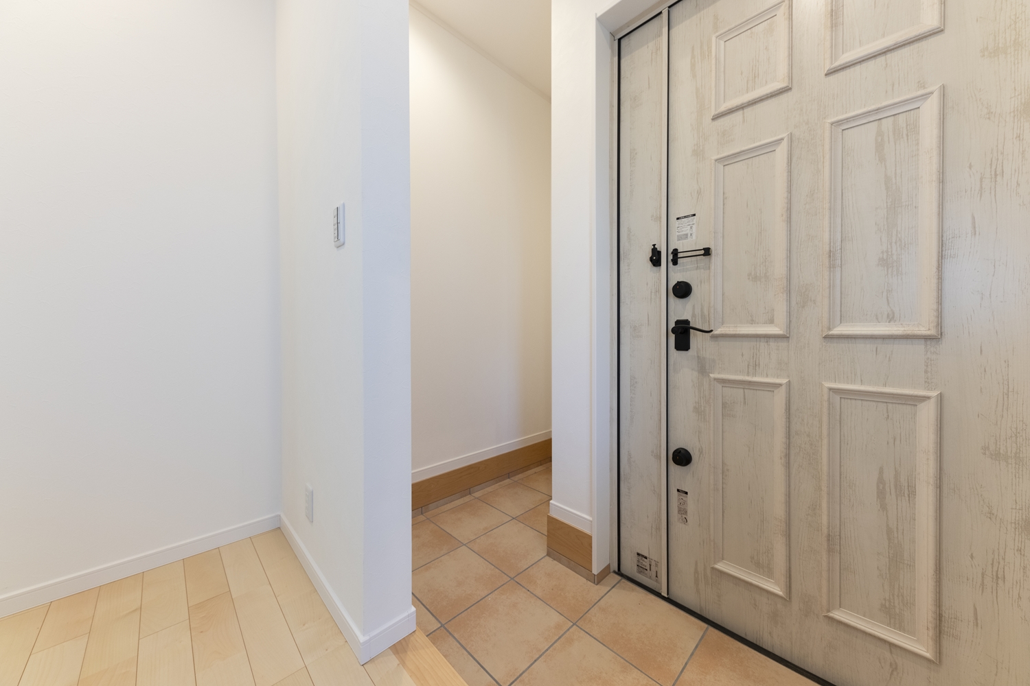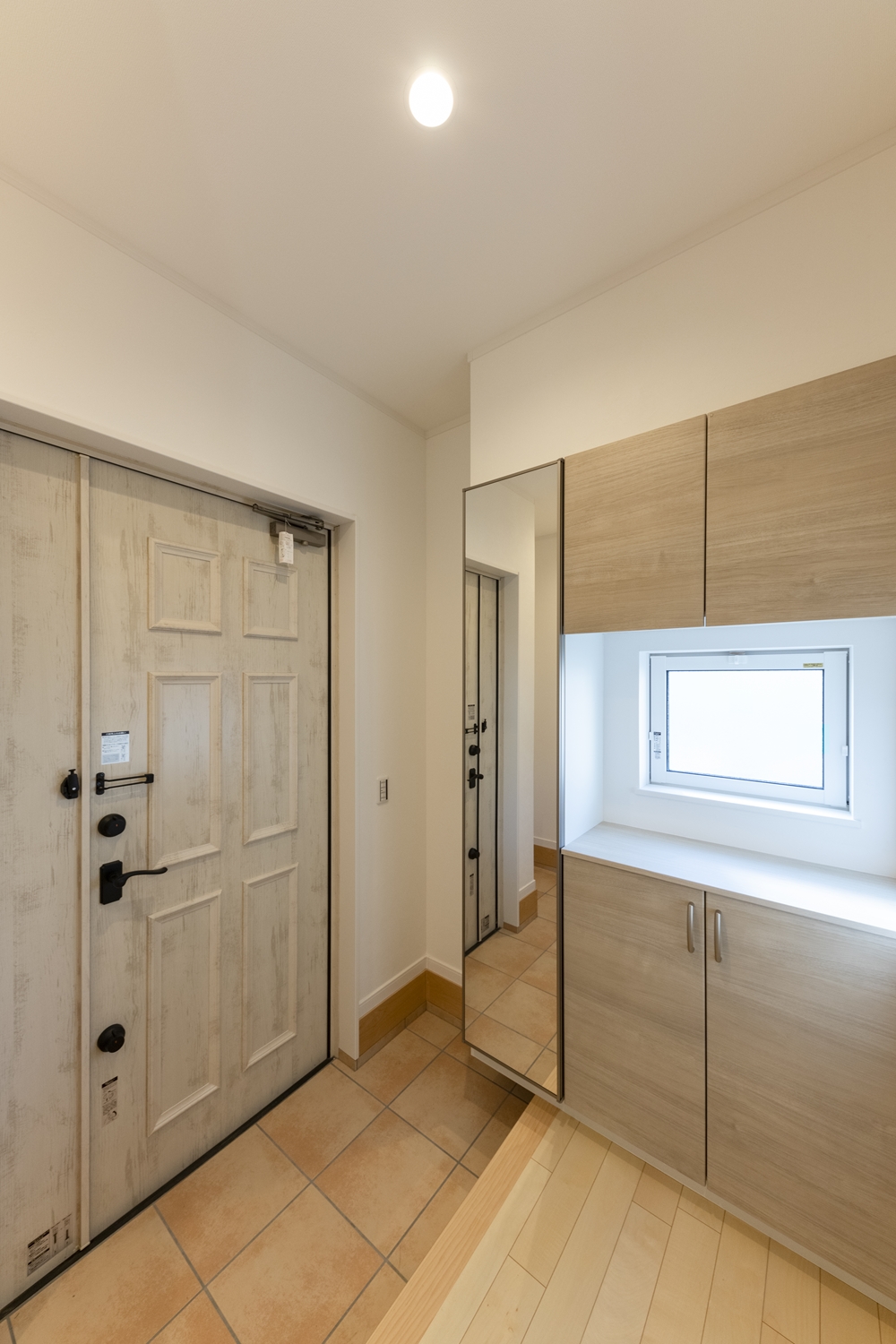 木の温もりを感じるナチュラルテイストな玄関。小窓から光が差し込む明るい空間です。