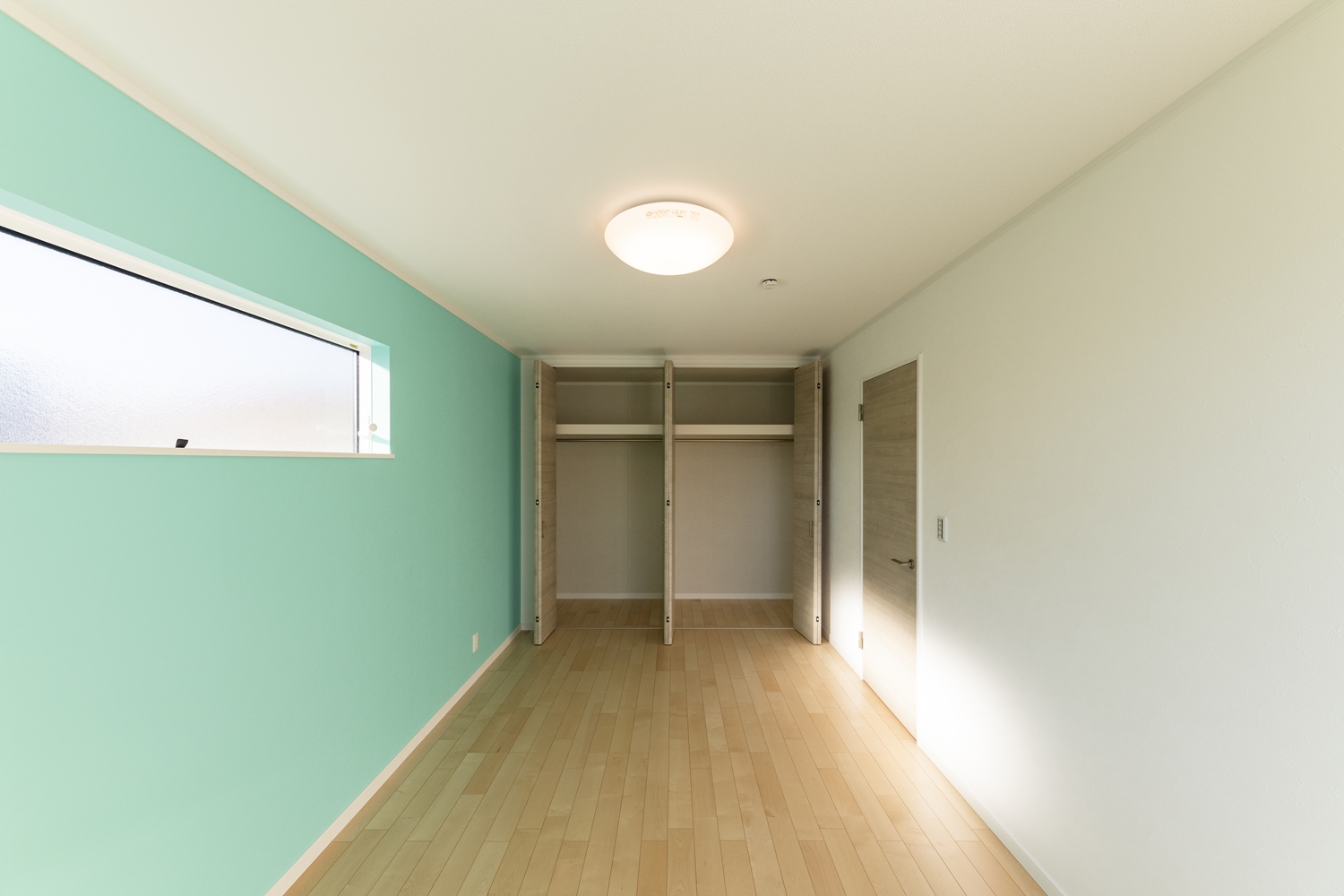 2階洋室/ブルーグリーンの壁紙をアクセントにした、爽やかな空間。