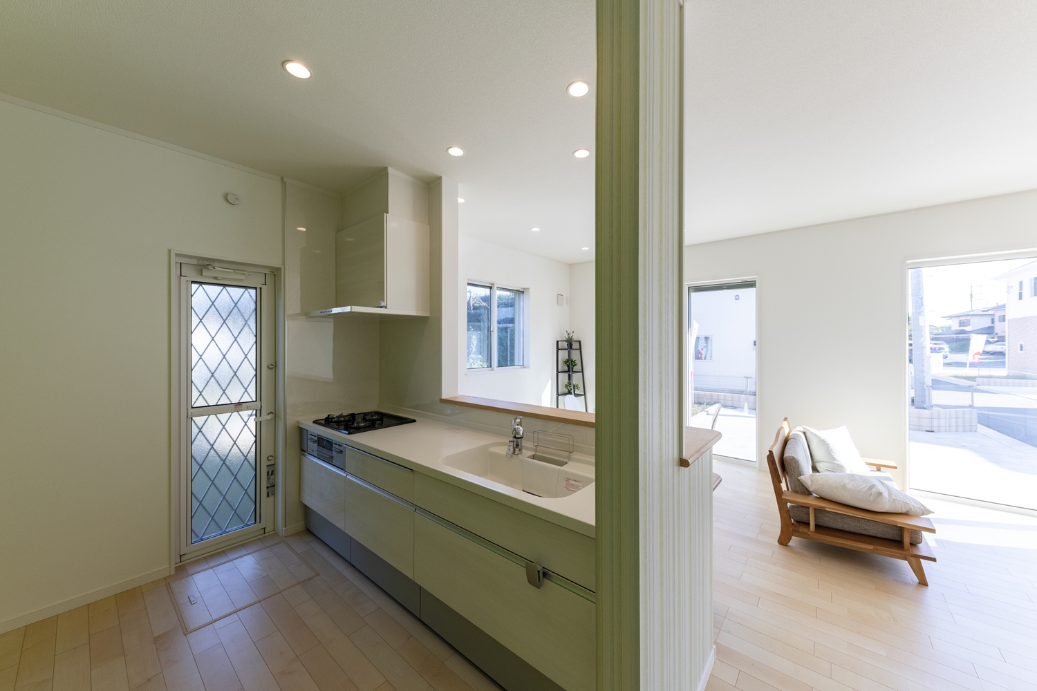 キッチンから見渡すリビングには明るい陽射しと心地よい風が降り注ぎます。
