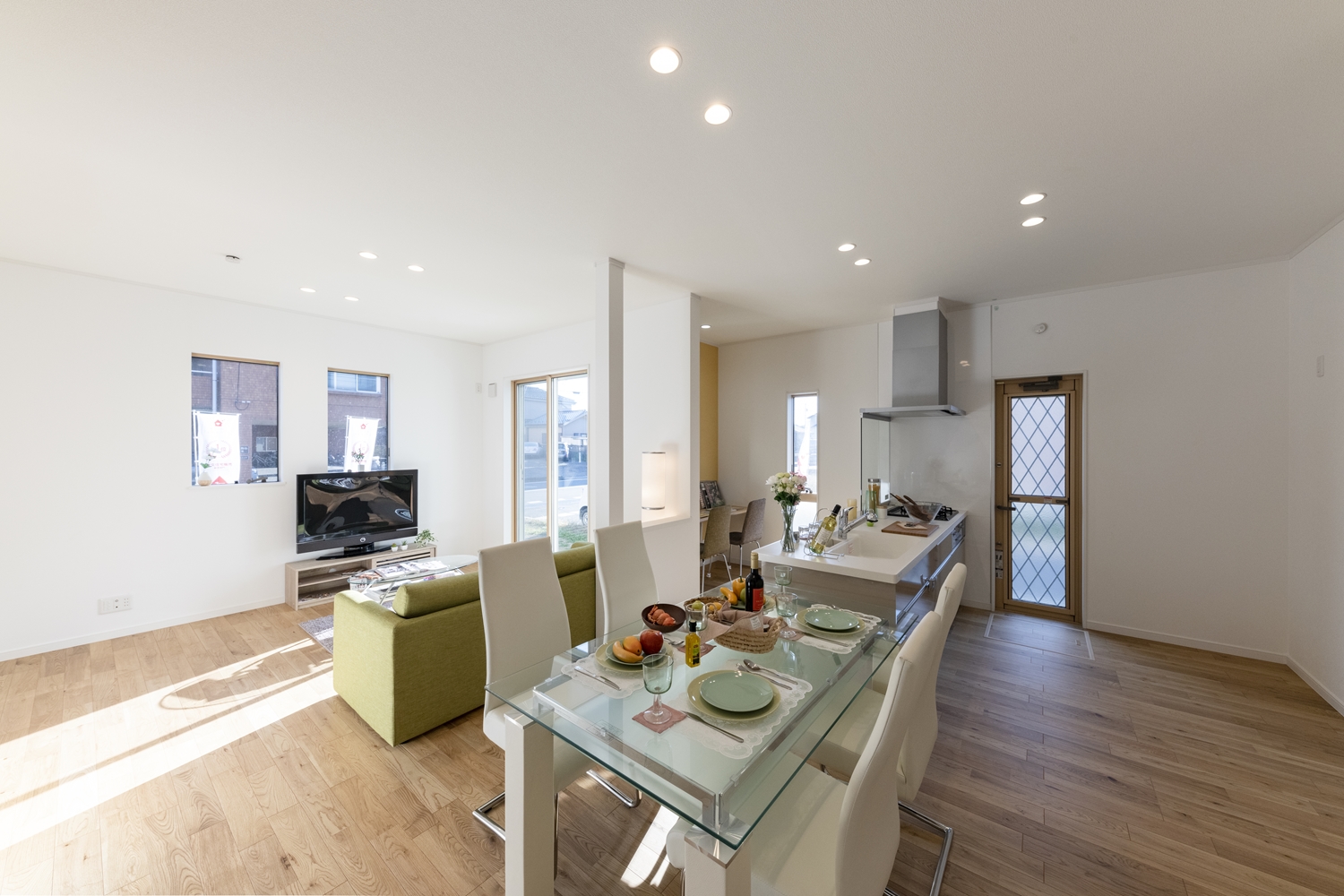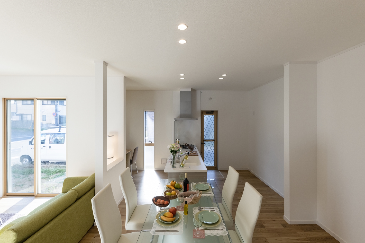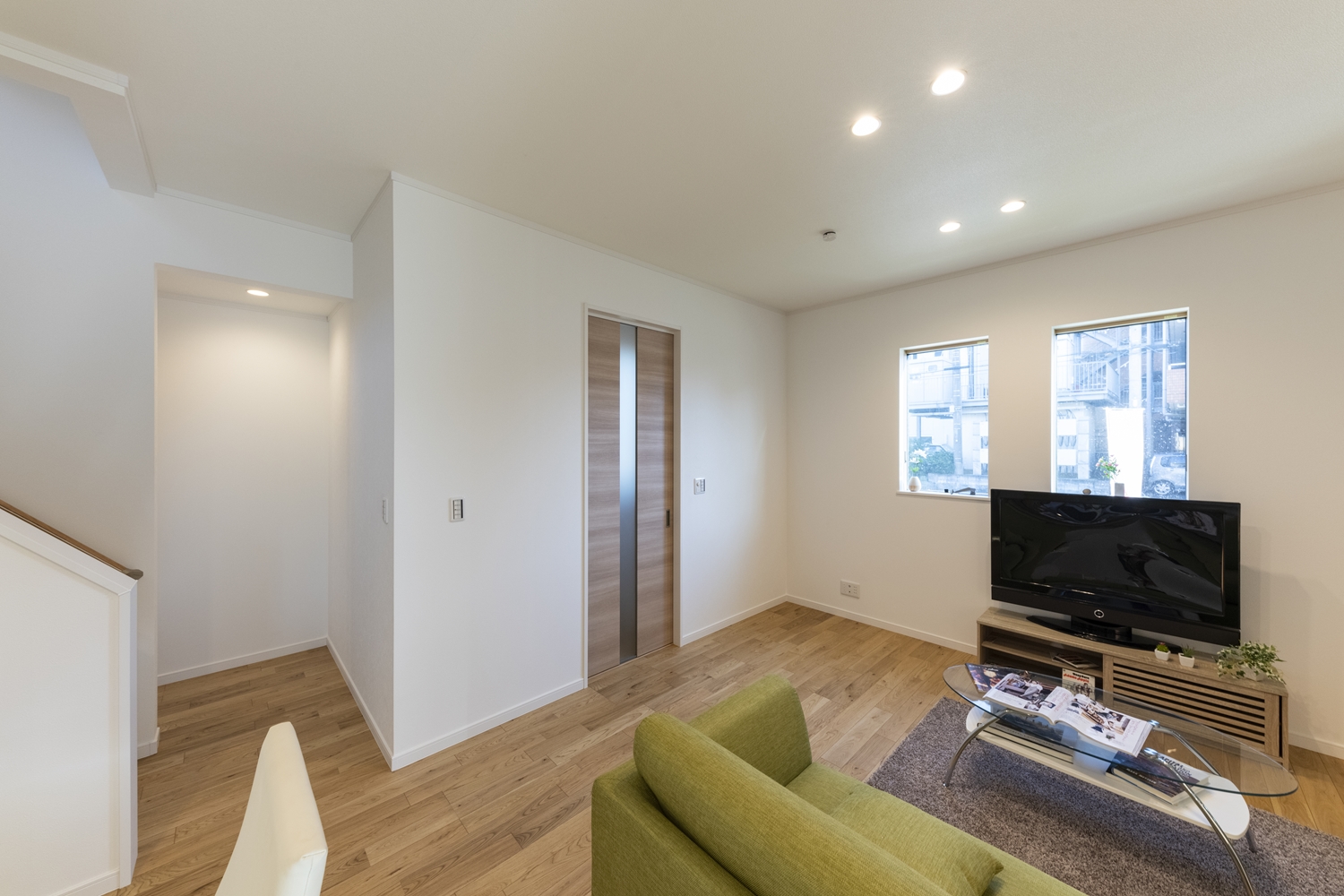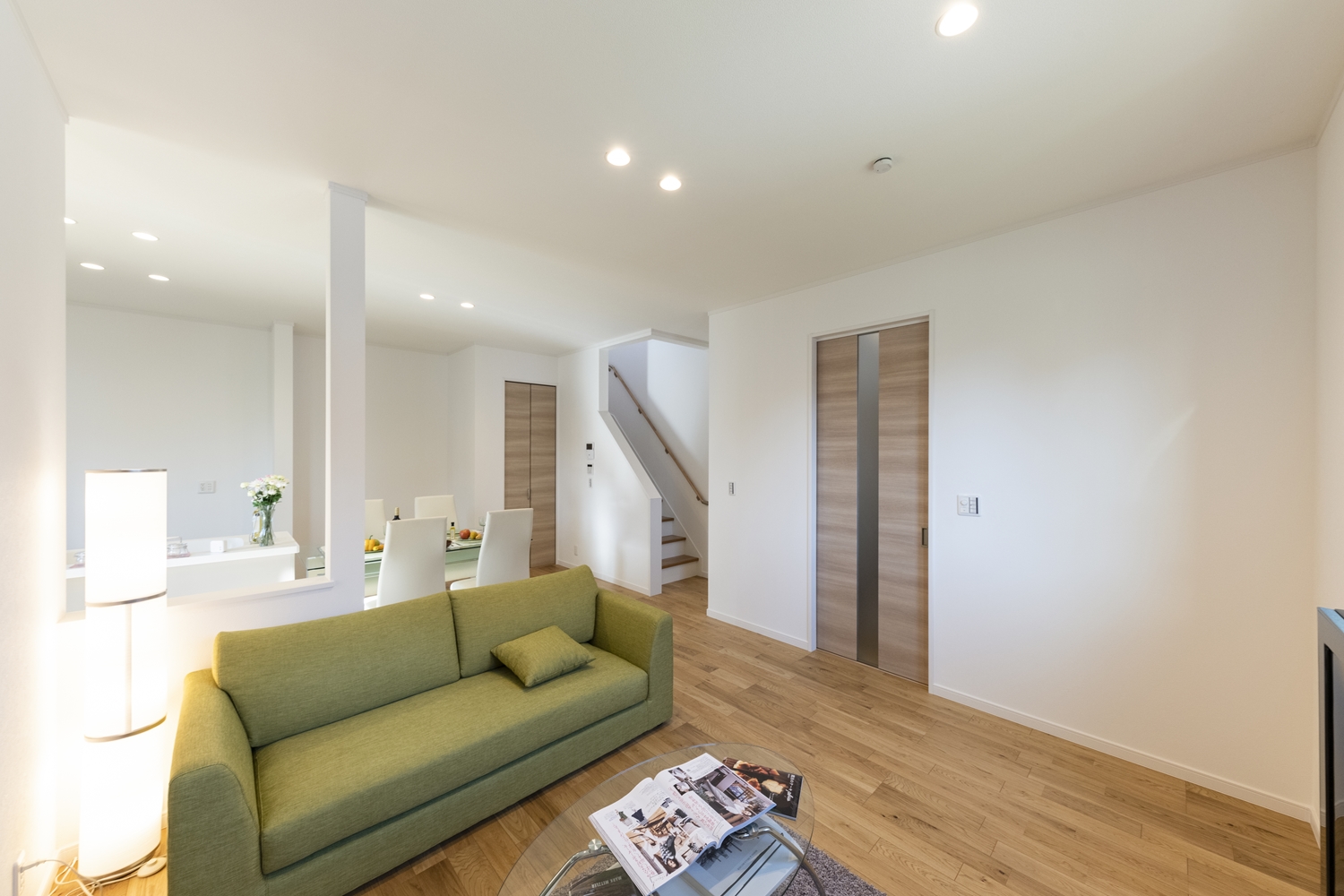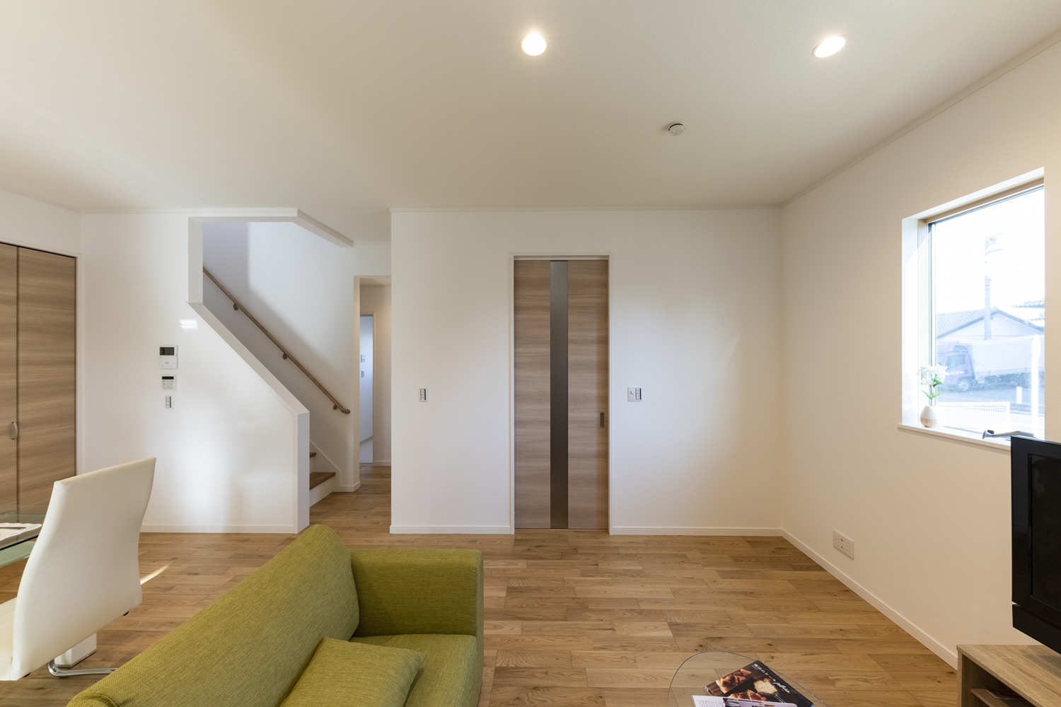 日中は窓からの光が部屋全体を包み込み、夜はダウンライトがモダンな空間を演出します。