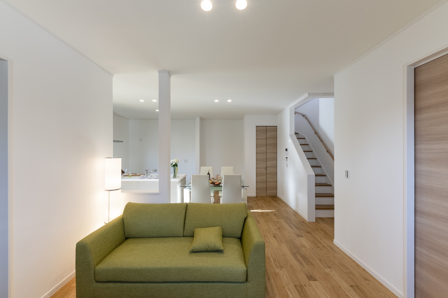 お子様の帰宅が分かるリビングイン階段を採用。「ただいま」や「おかえり」の笑顔が自然と生まれる間取りです。