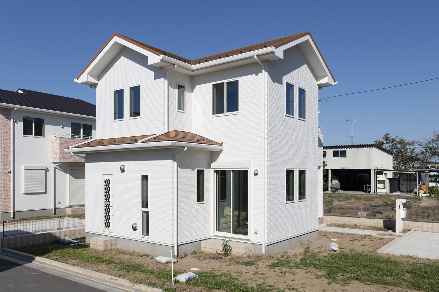 白いレンガ調の外壁にオレンジ色の屋根をあしらった、ナチュラル&モダンな外観。