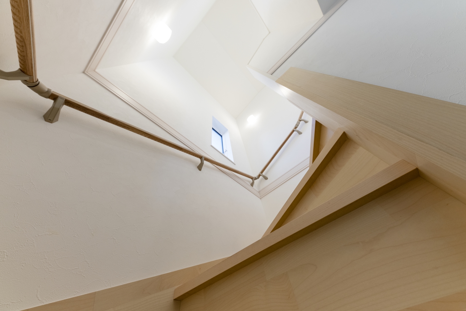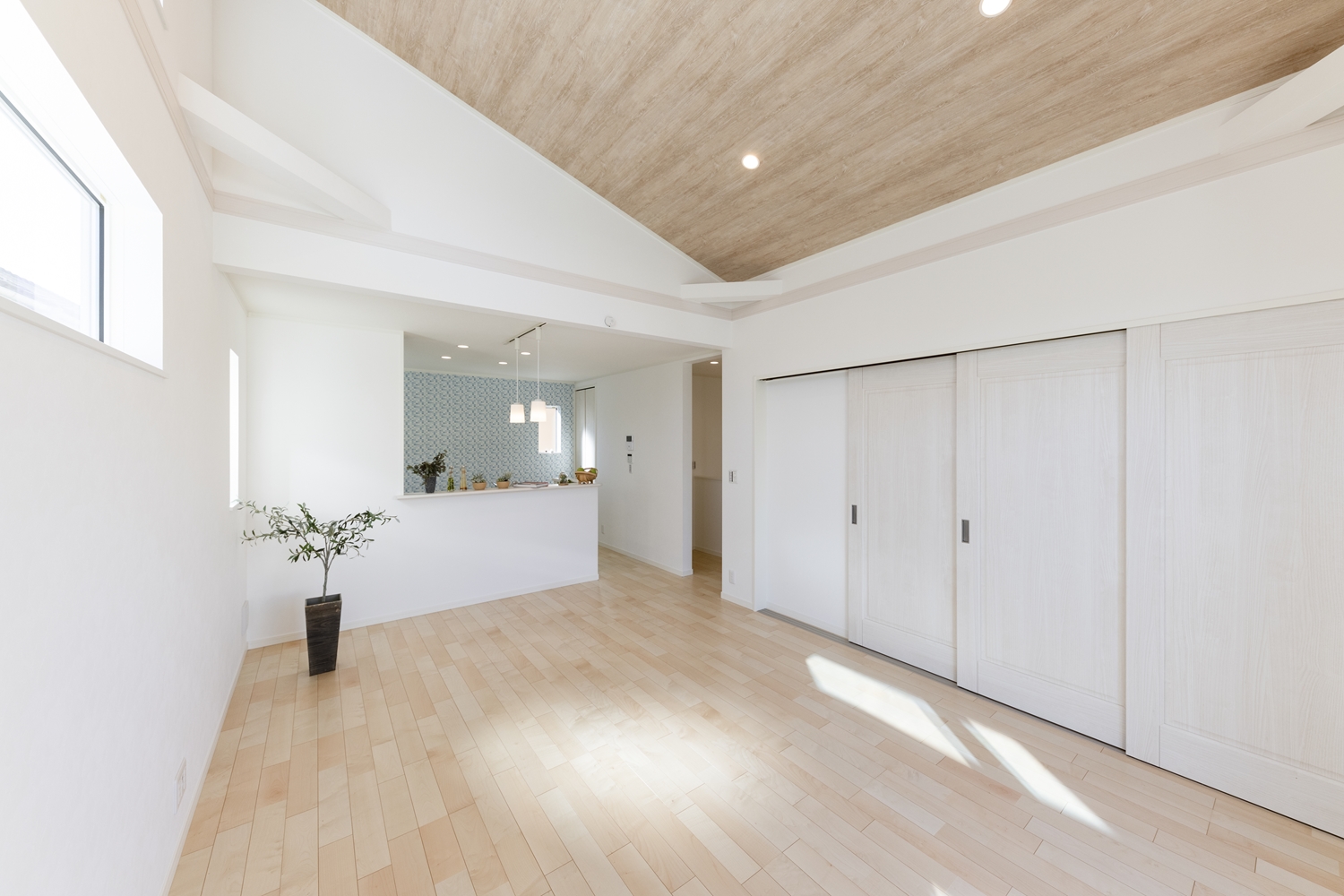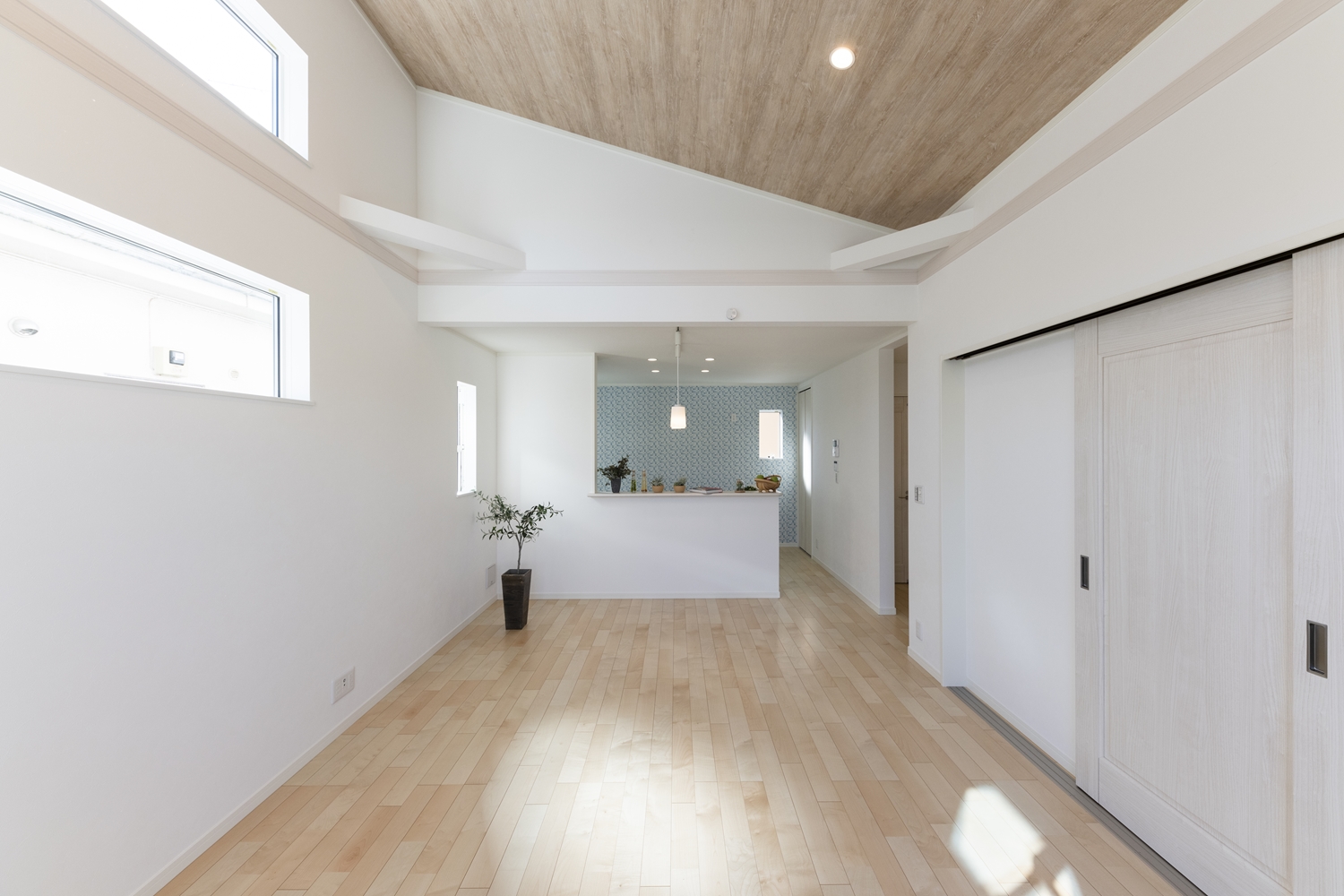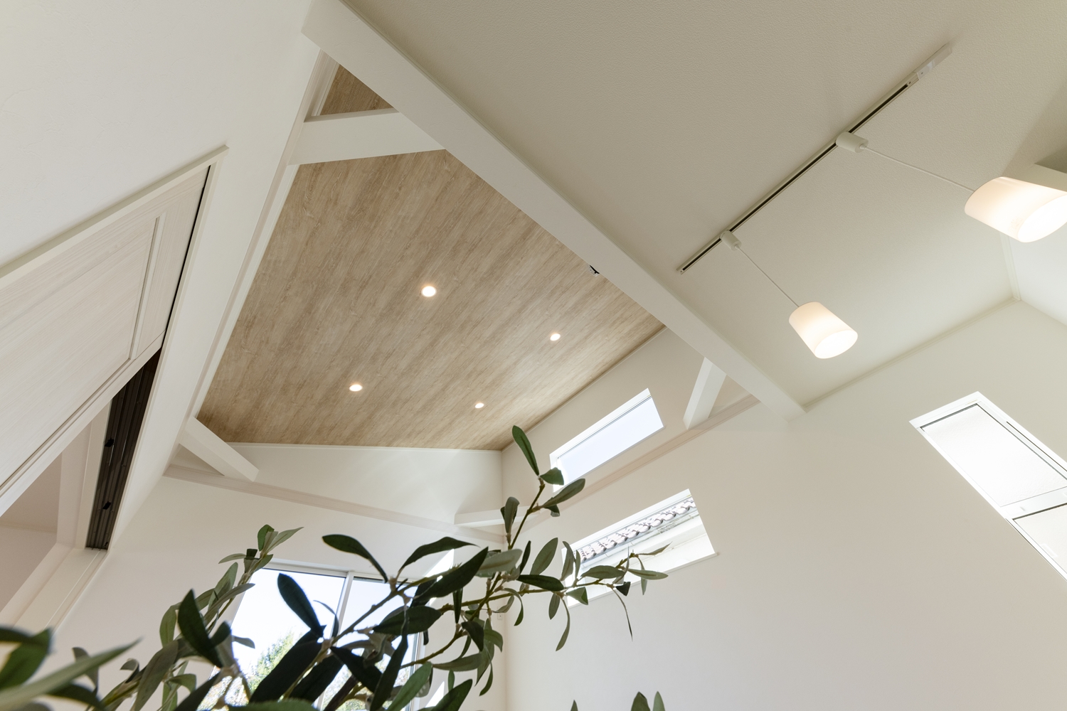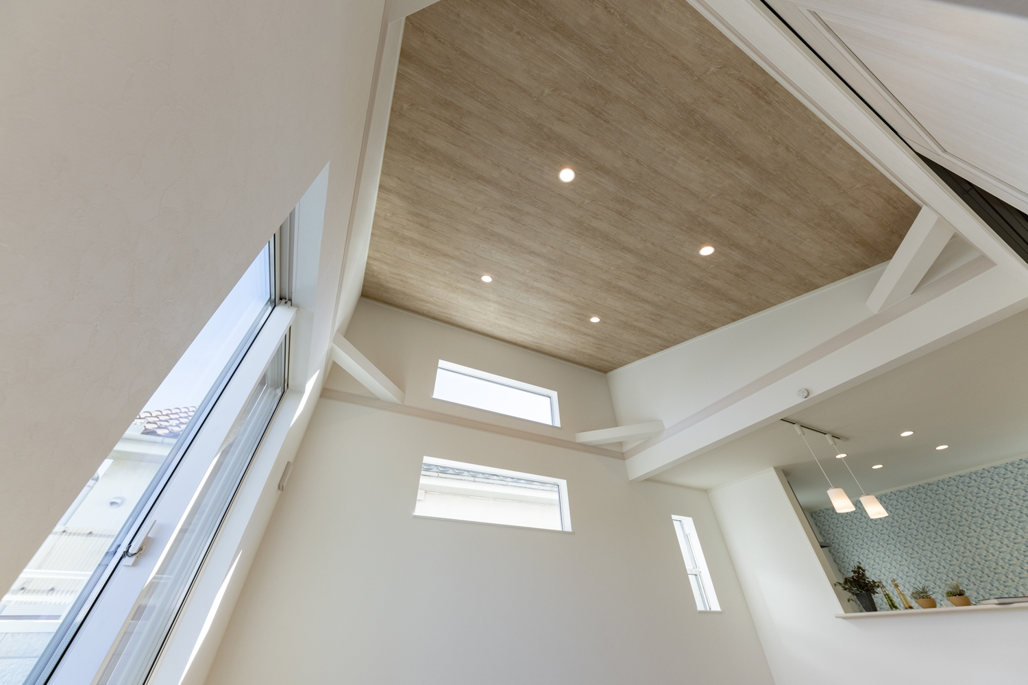 2階リビングならではのデザイン!屋根の傾斜を利用した、勾配天井を設えました。開放的で広々とした空間に仕上がりました。