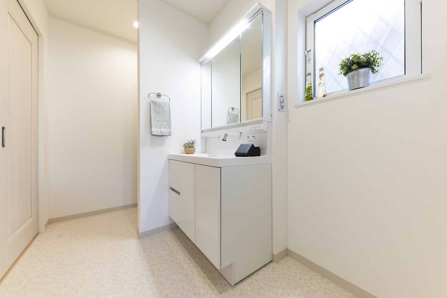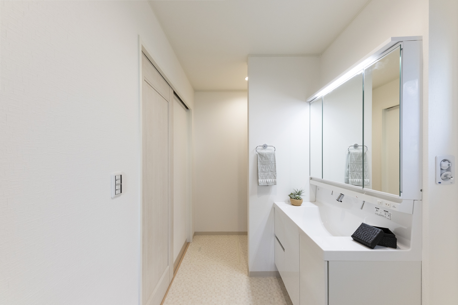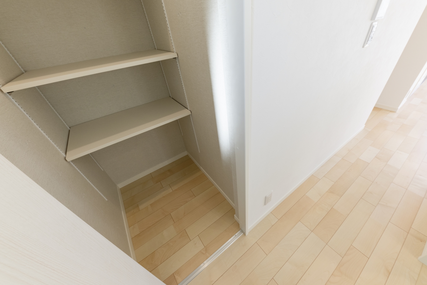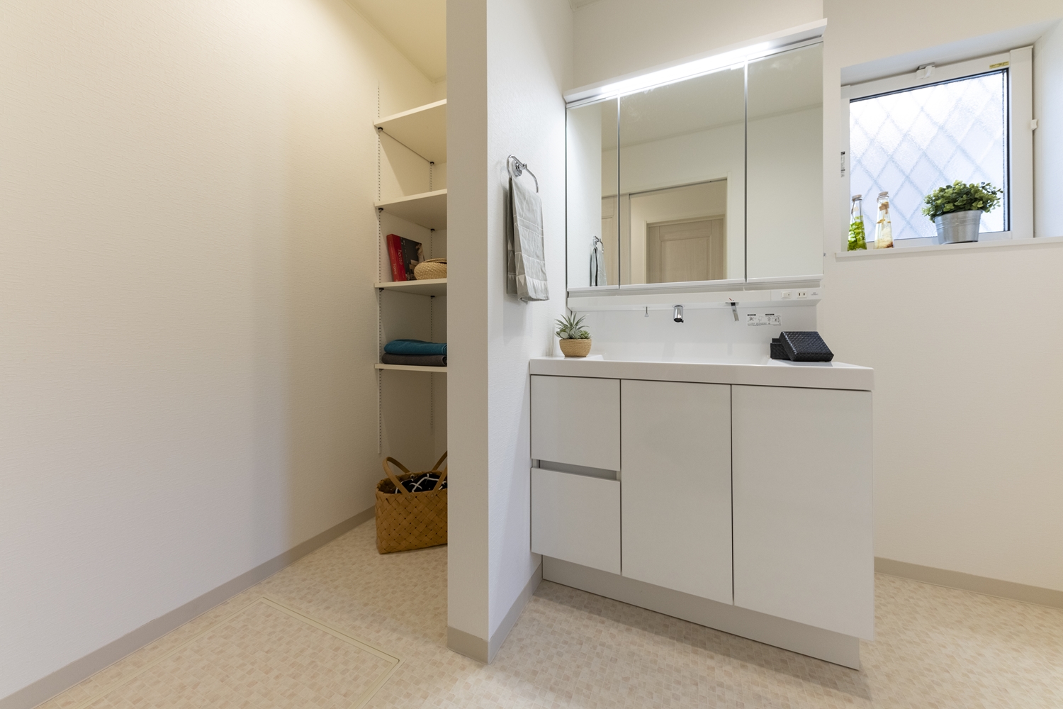 タオルや洗剤等をたっぷり収納できるリネン棚を設置しました。