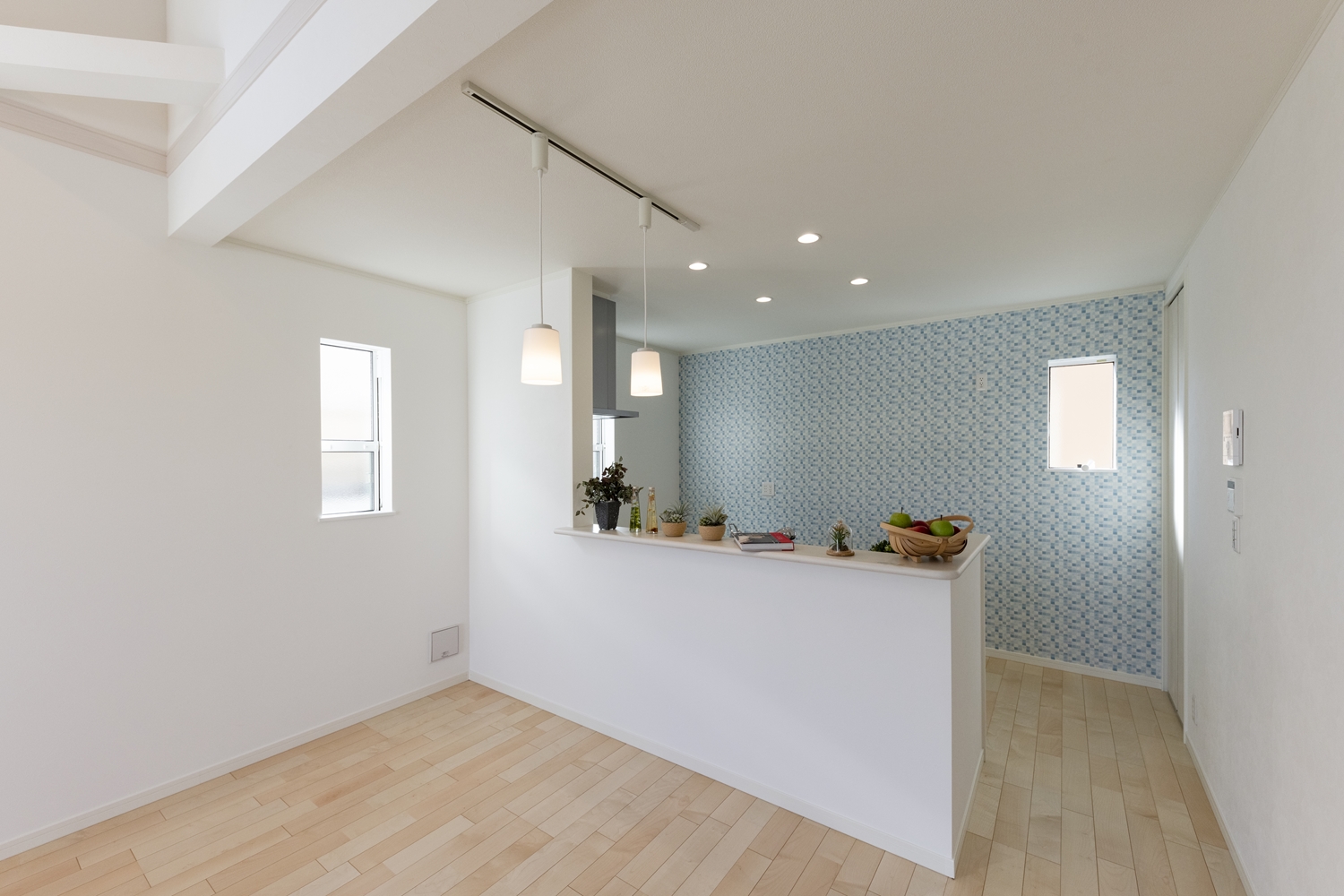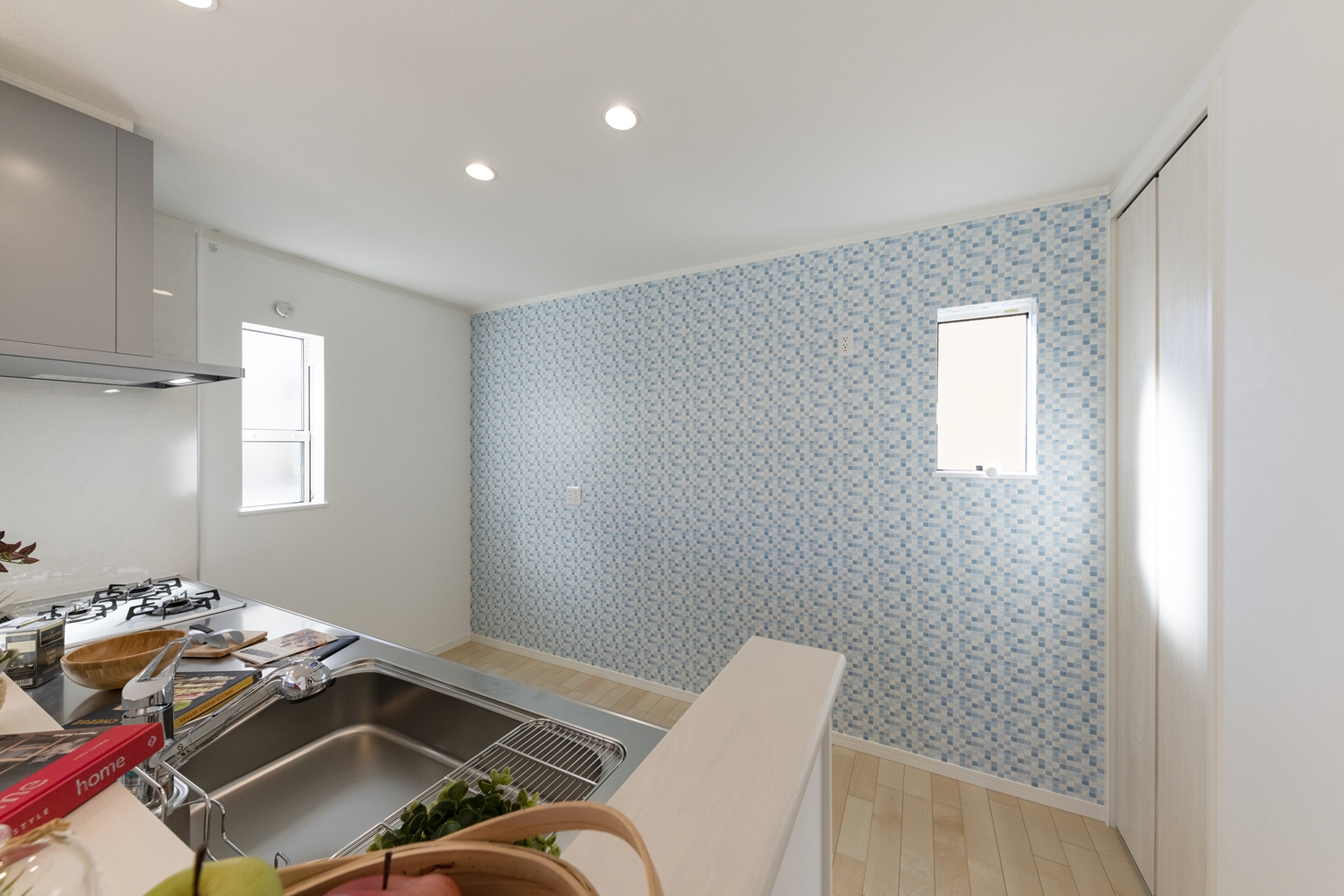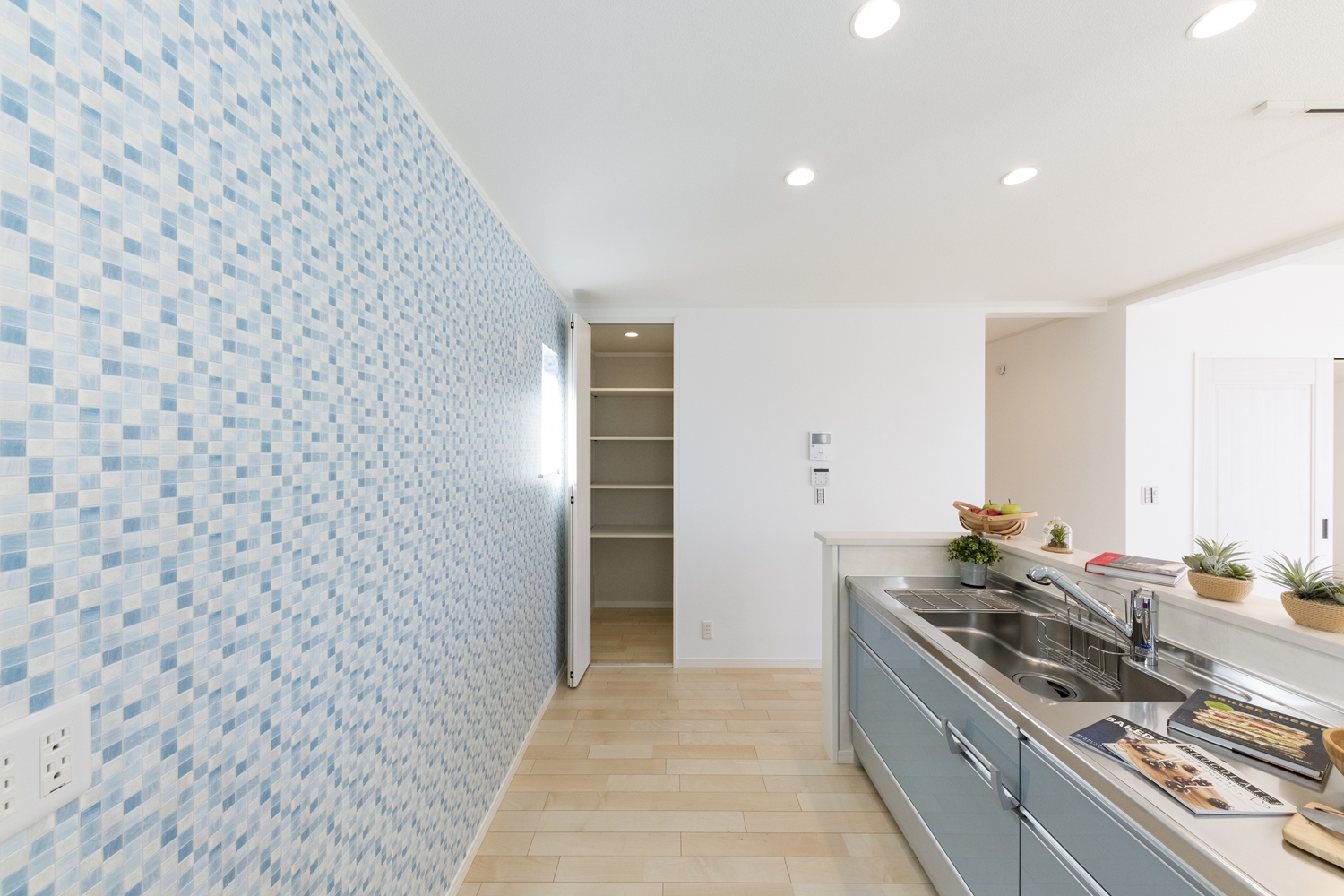 キッチン背面にブルー系のアクセントクロスを施してお部屋にワンポイントをプラスさせました♪