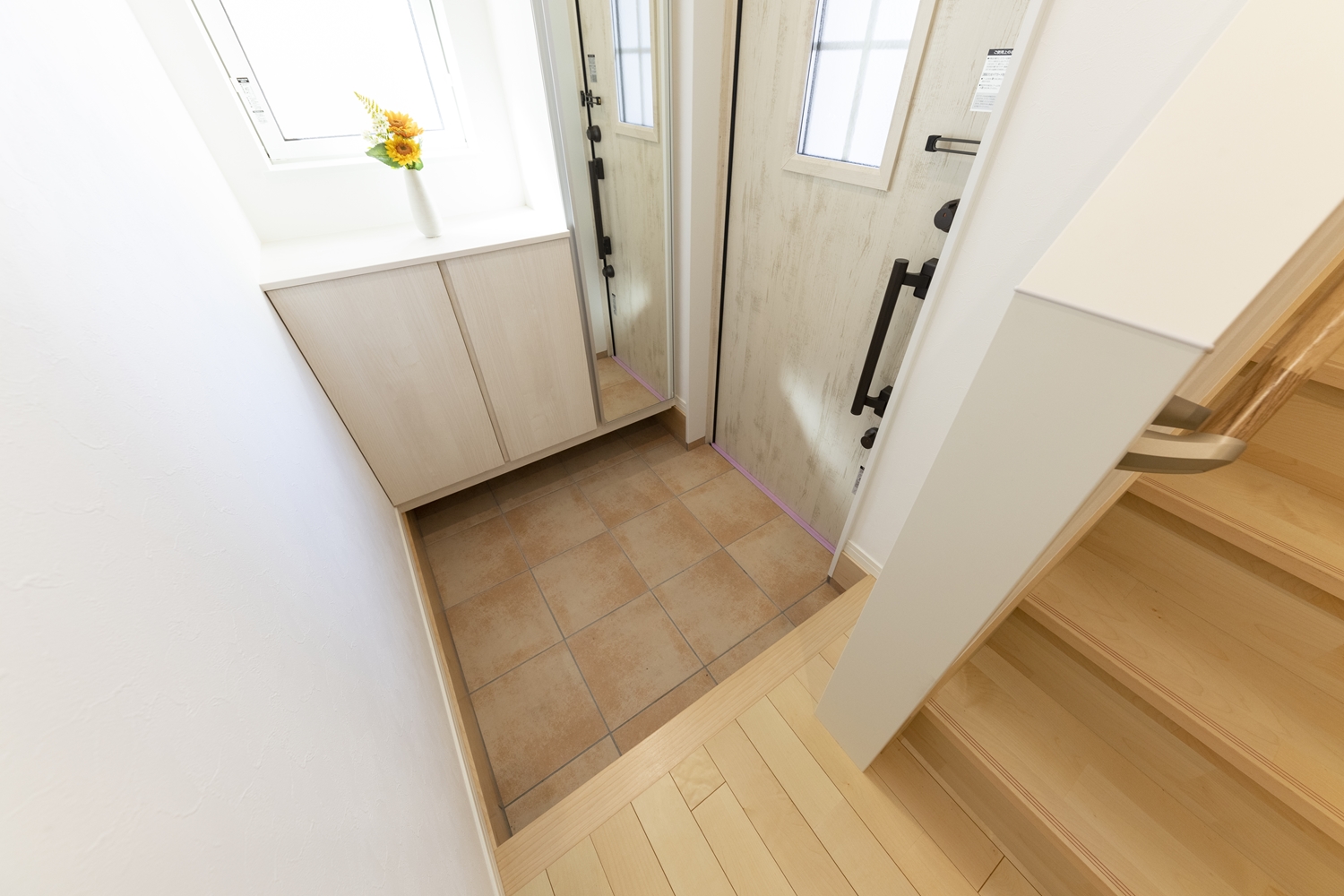 木の温もりを感じる玄関ドアと収納、ベージュのテラコッタ調タイルがナチュラルな空間を演出します。