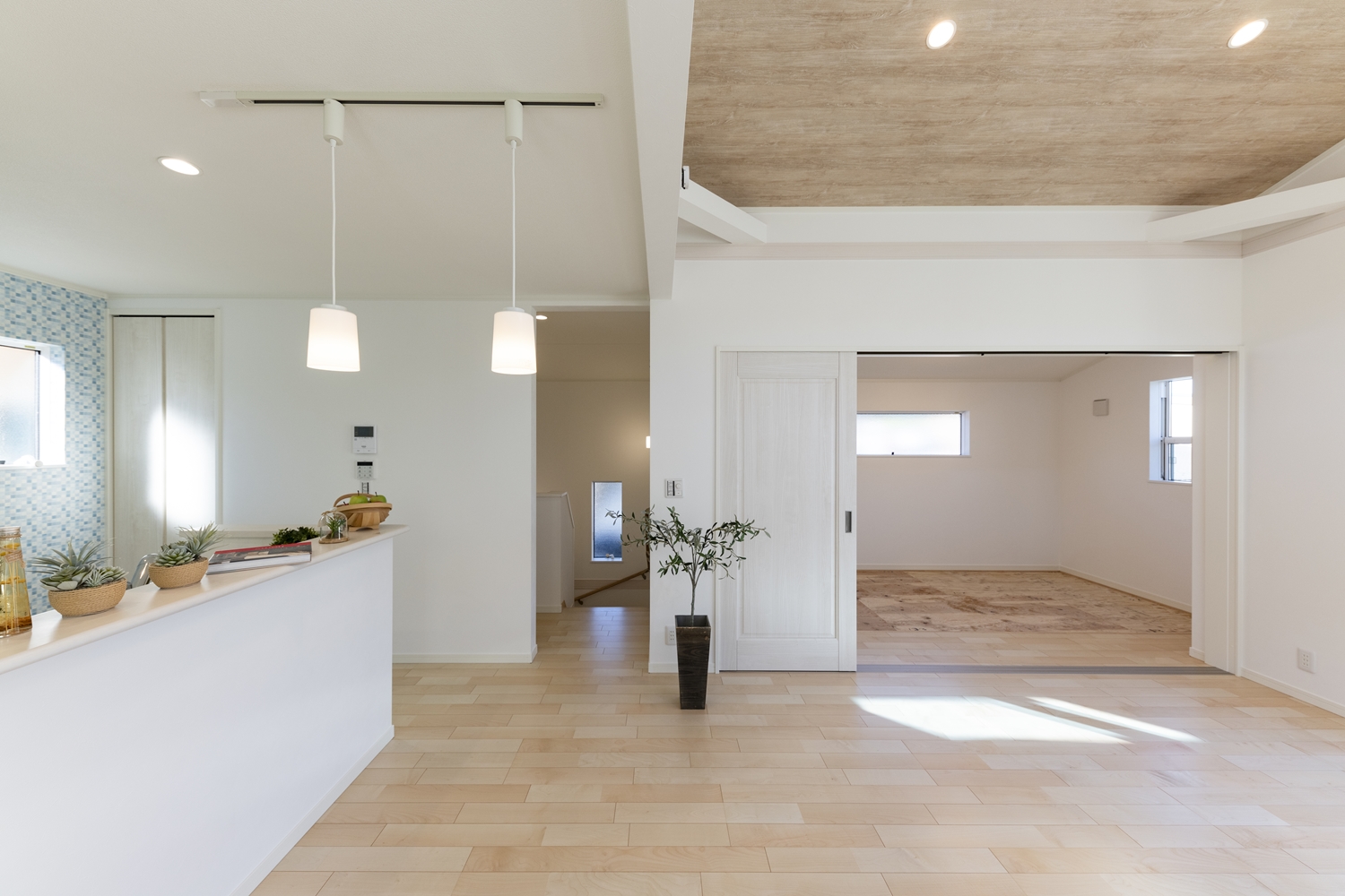 2階LDK/キッチンから、リビング、ダイニングが見渡せる、開放的で一体感のある間取り。