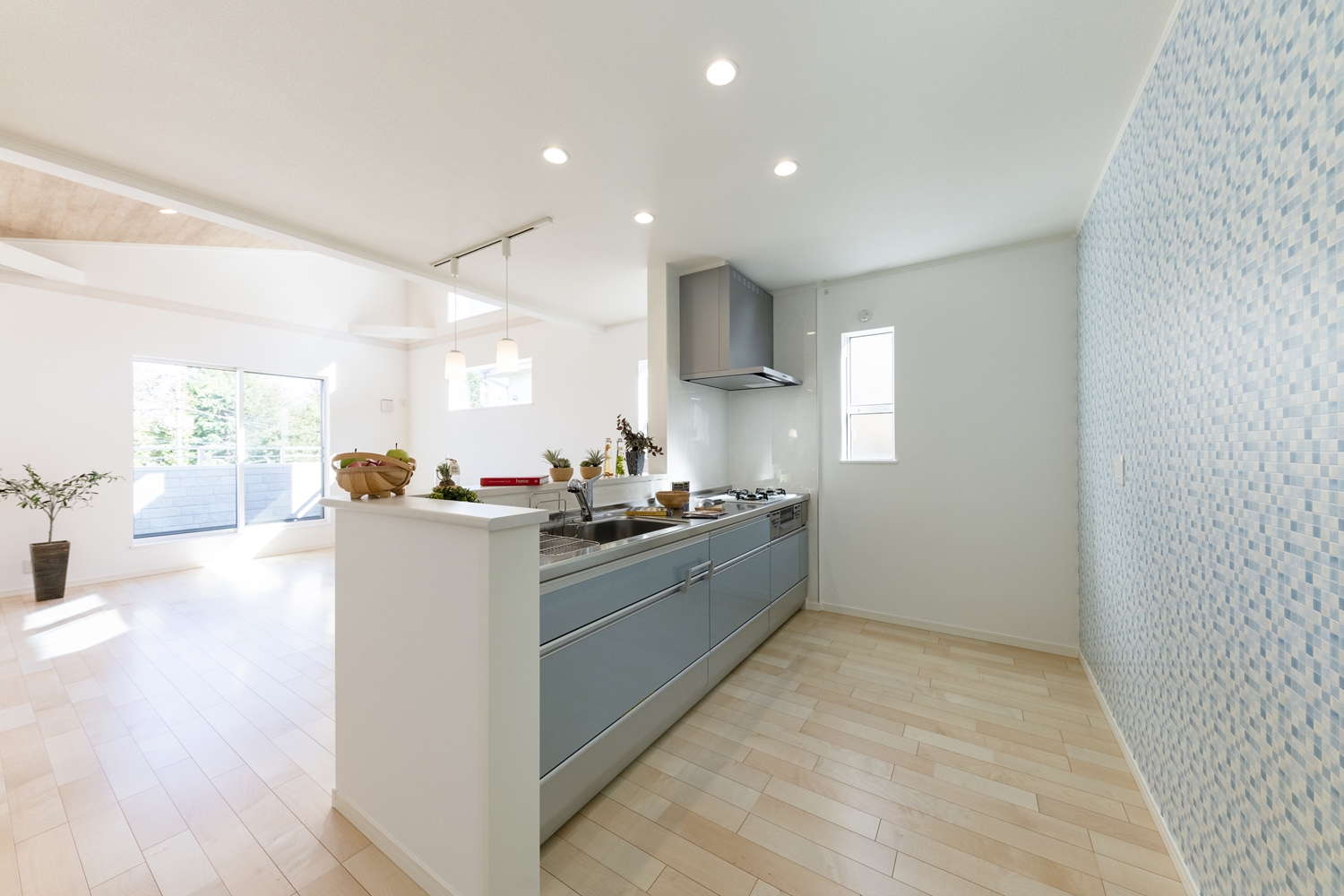 爽やかなブルーのキッチン扉。清潔感溢れるキッチンスペース。