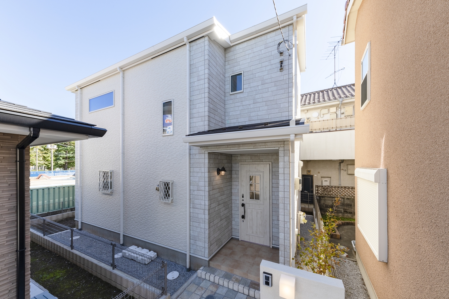 白を基調に、玄関廻りをレンガ調サイディングでアクセントをつけた、ナチュラル&モダンな外観。