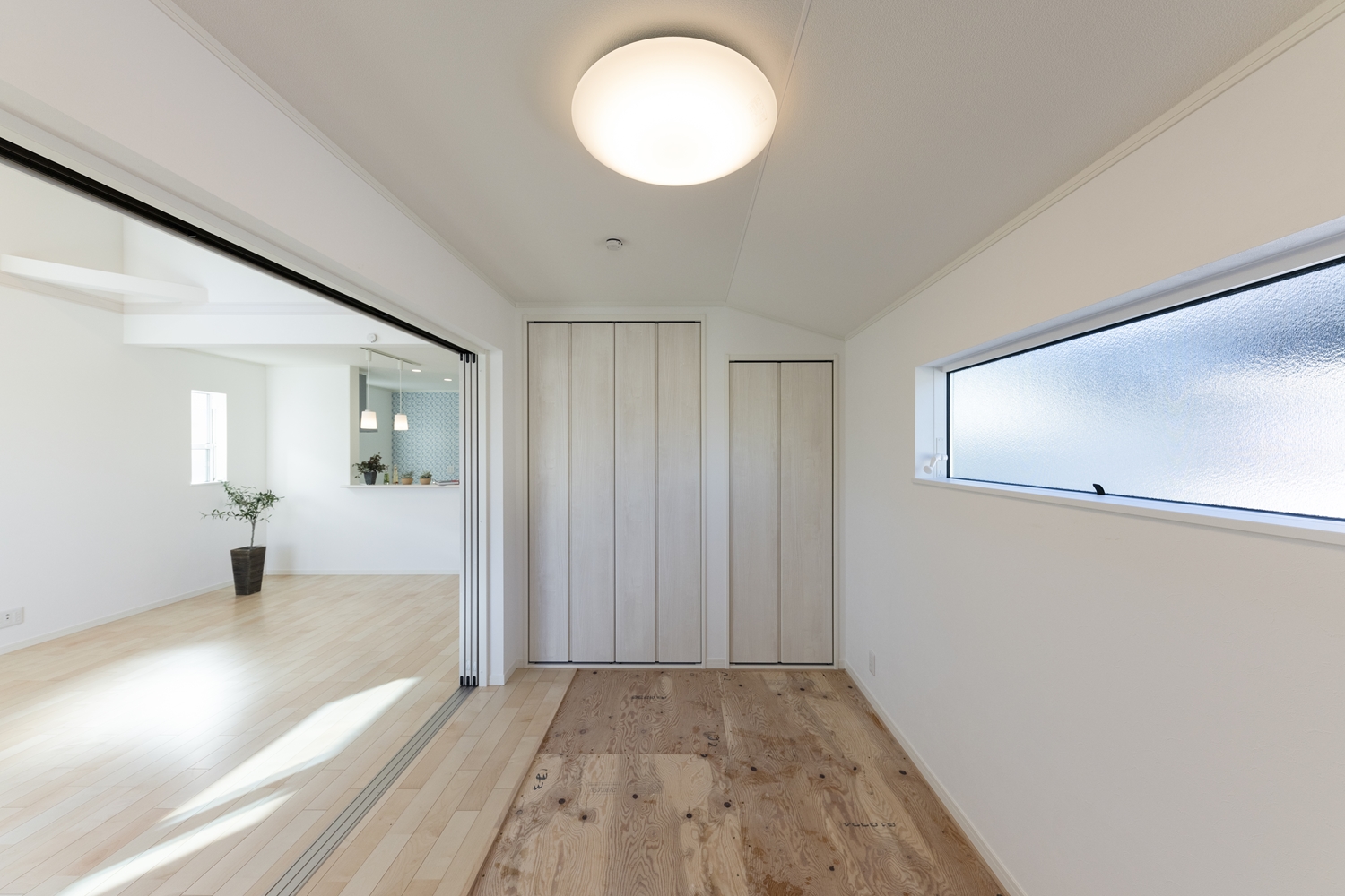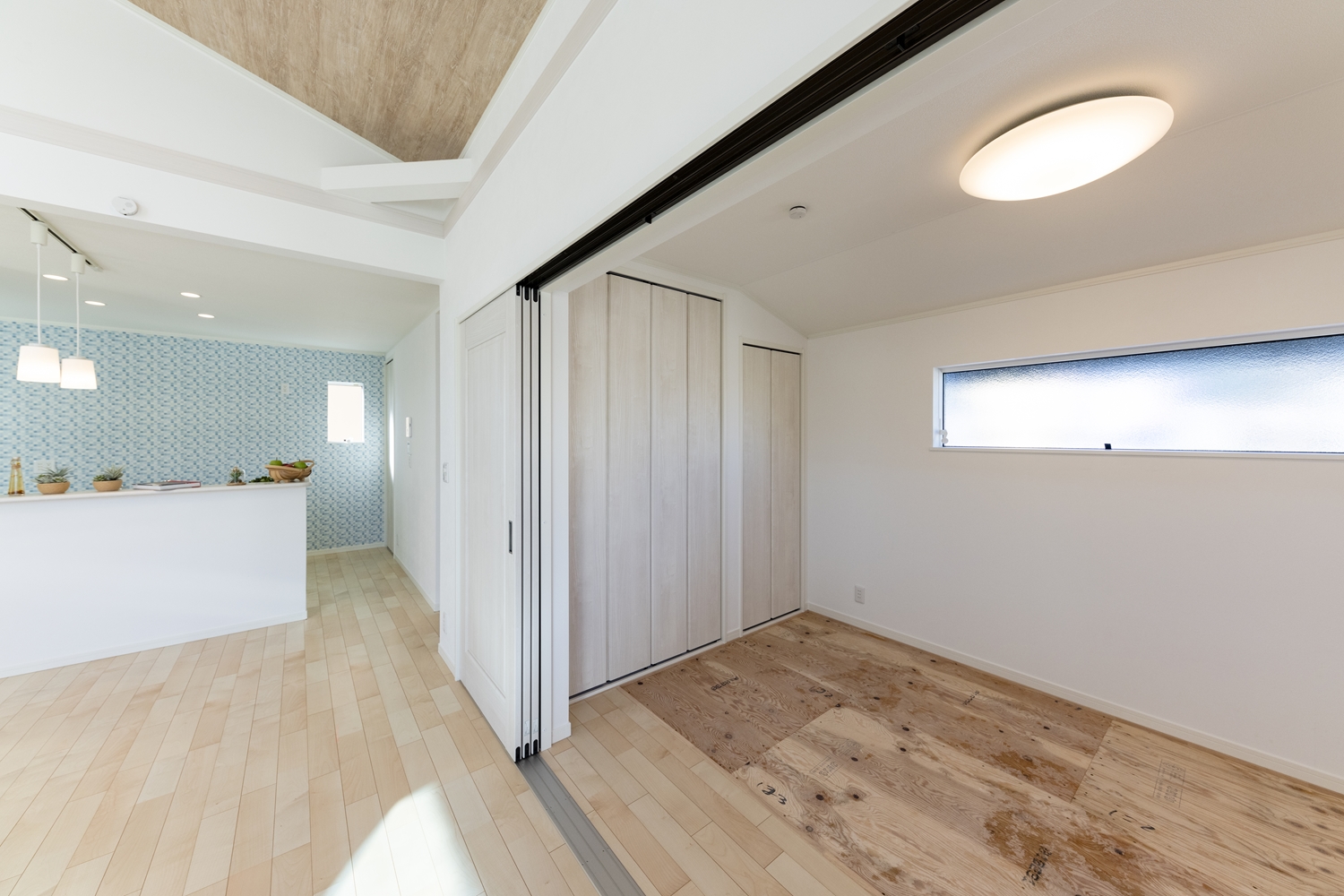 扉を開けてひとつなぎになった畳敷き洋室(写真は畳設置前)はリビングに開放感をプラスしてくれます。