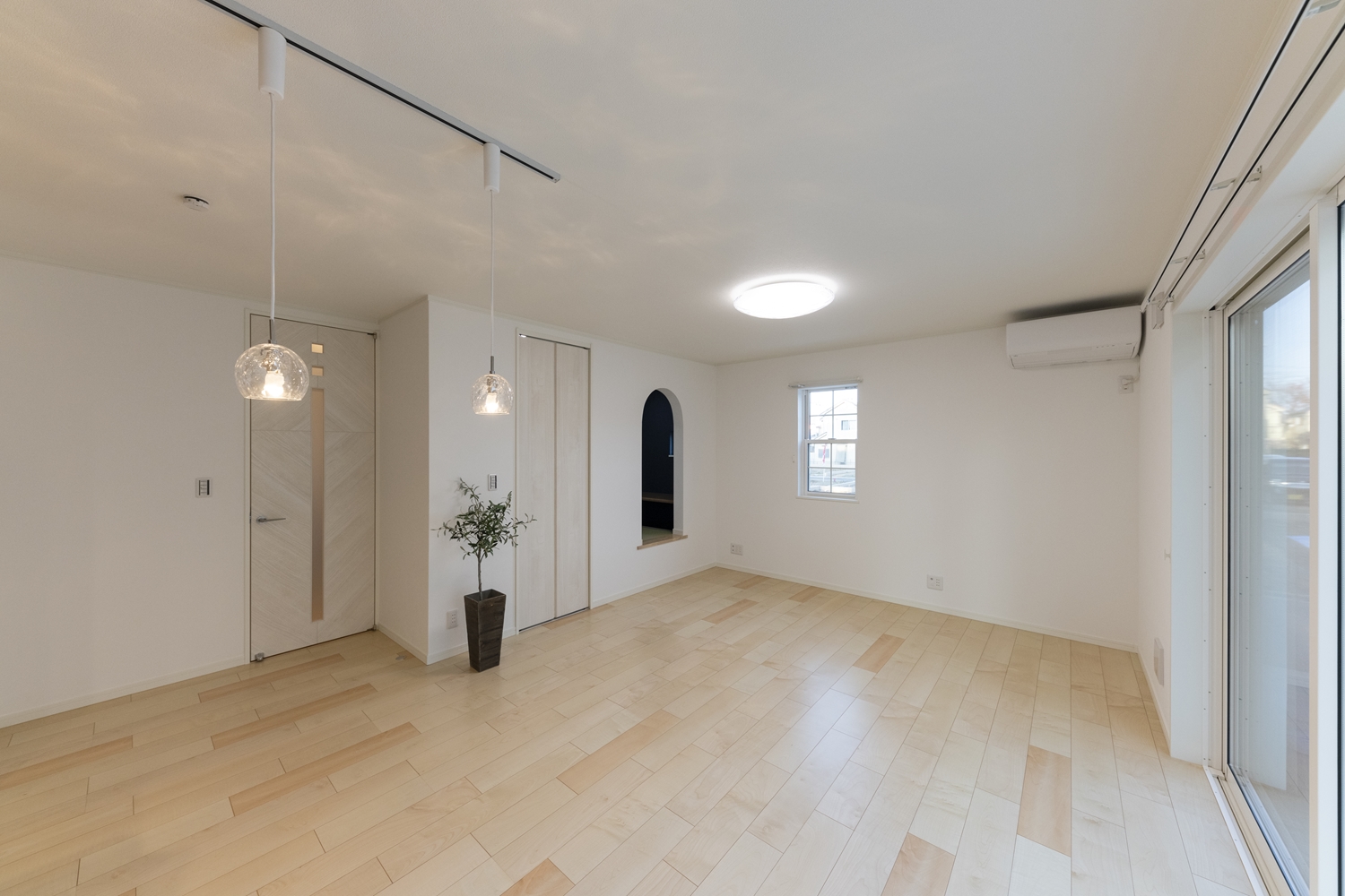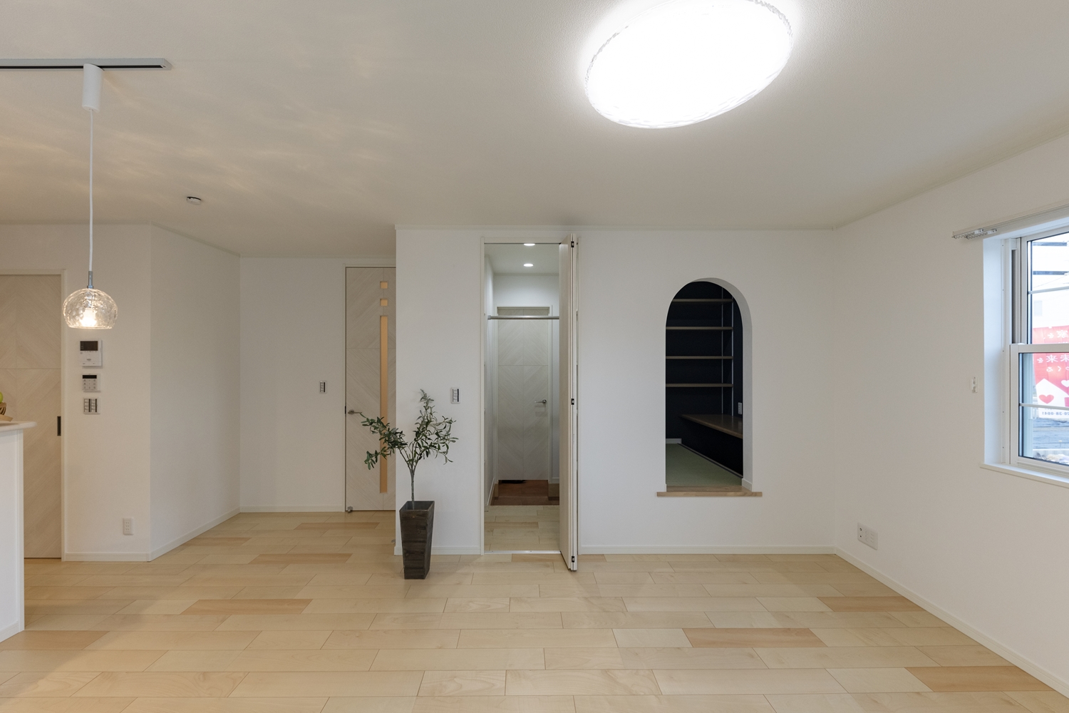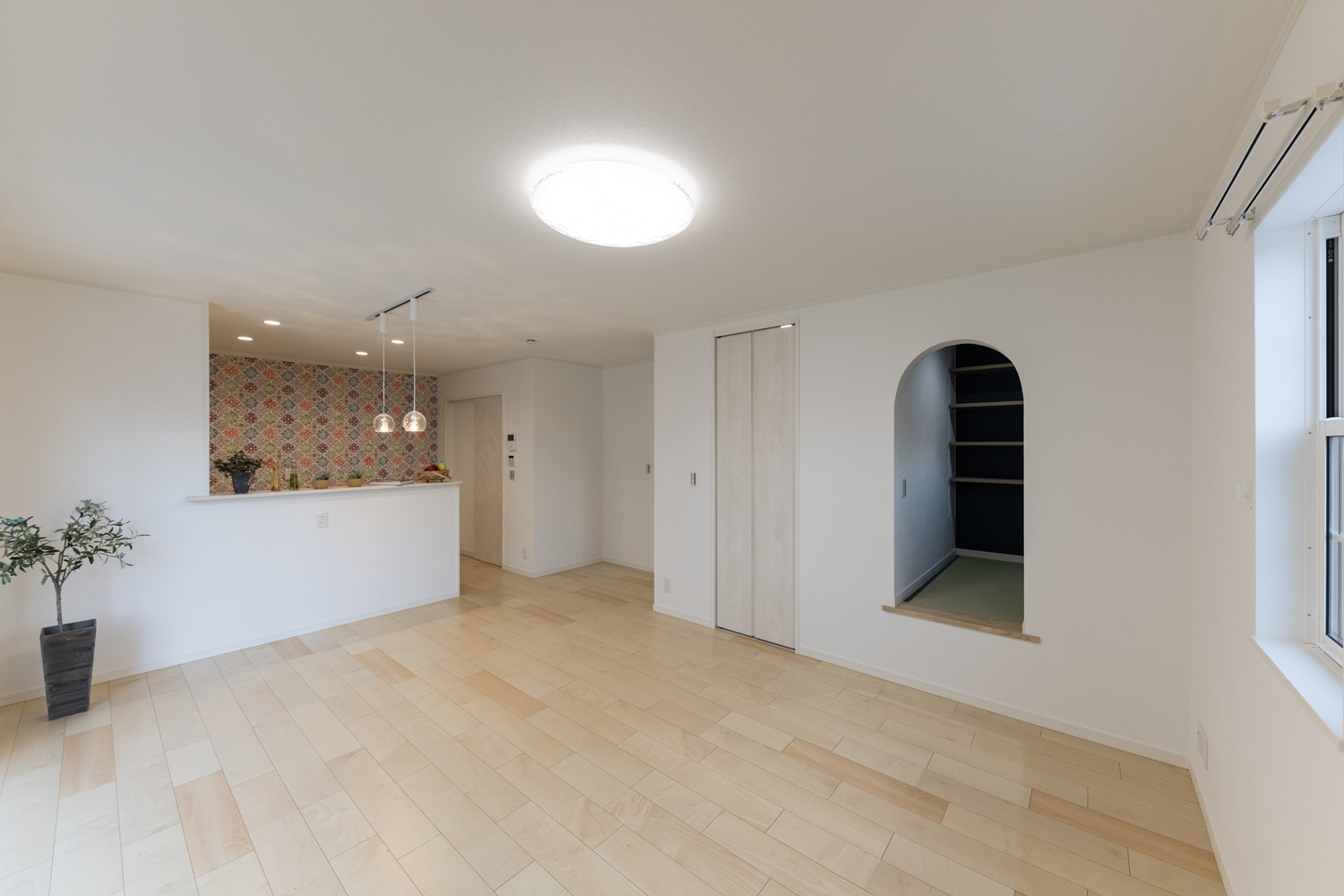 北欧風のカラフルな壁紙や、アーチ型の下がり壁をアクセントにした、可愛らしく温かみのあるLDK。