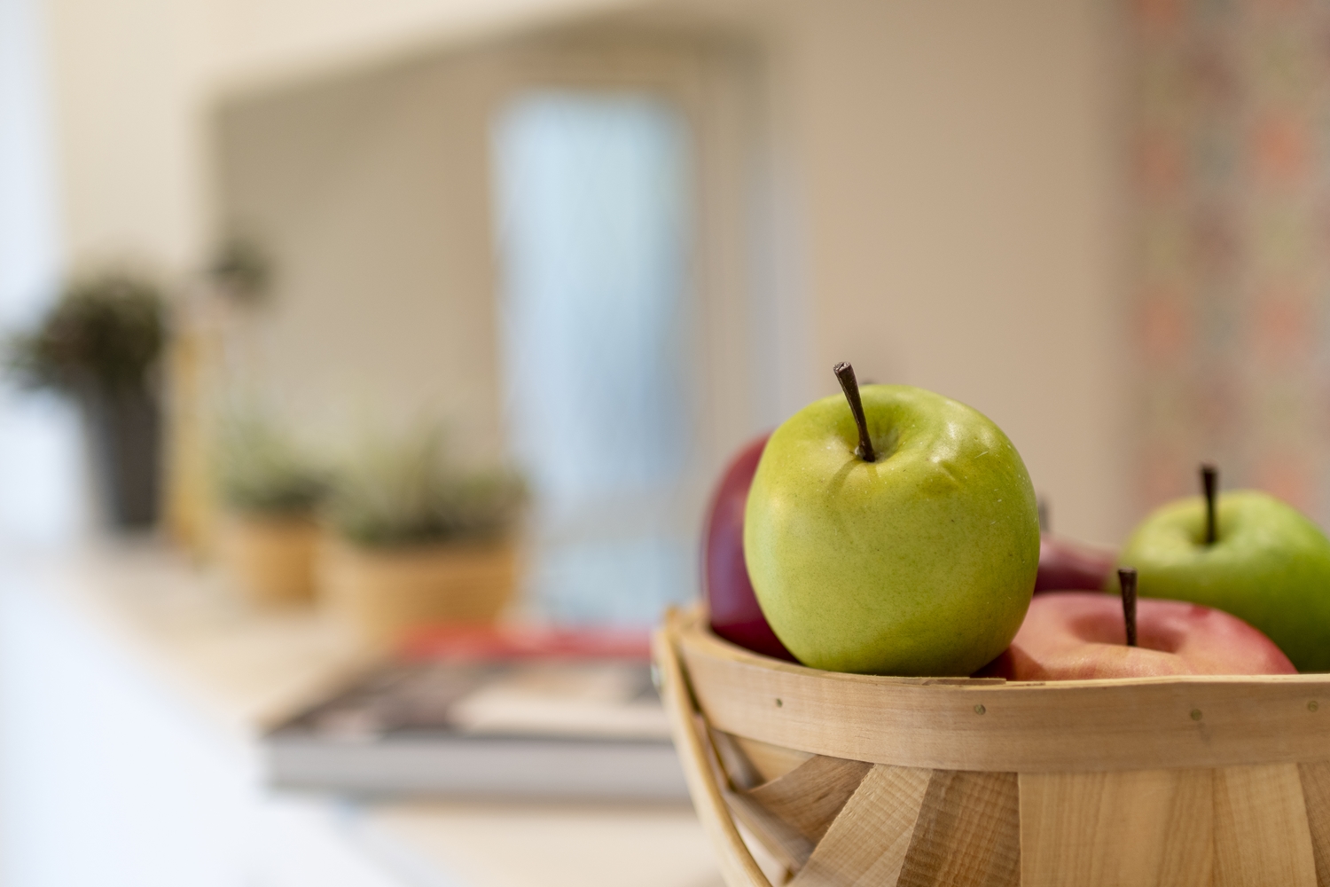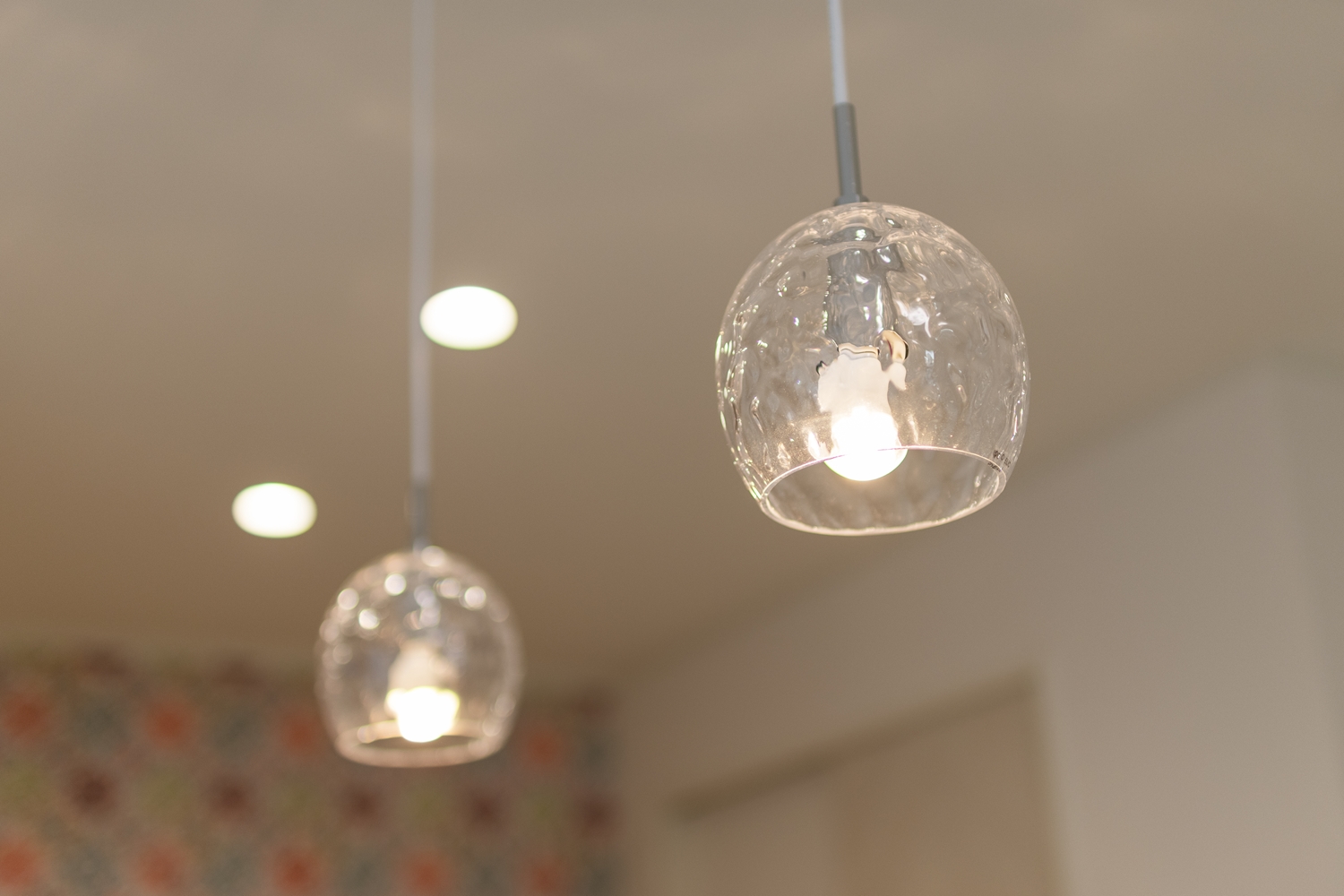 丸いフォルムがかわいらしいガラスのペンダントライトが、ダイニングをやさしく照らします。
