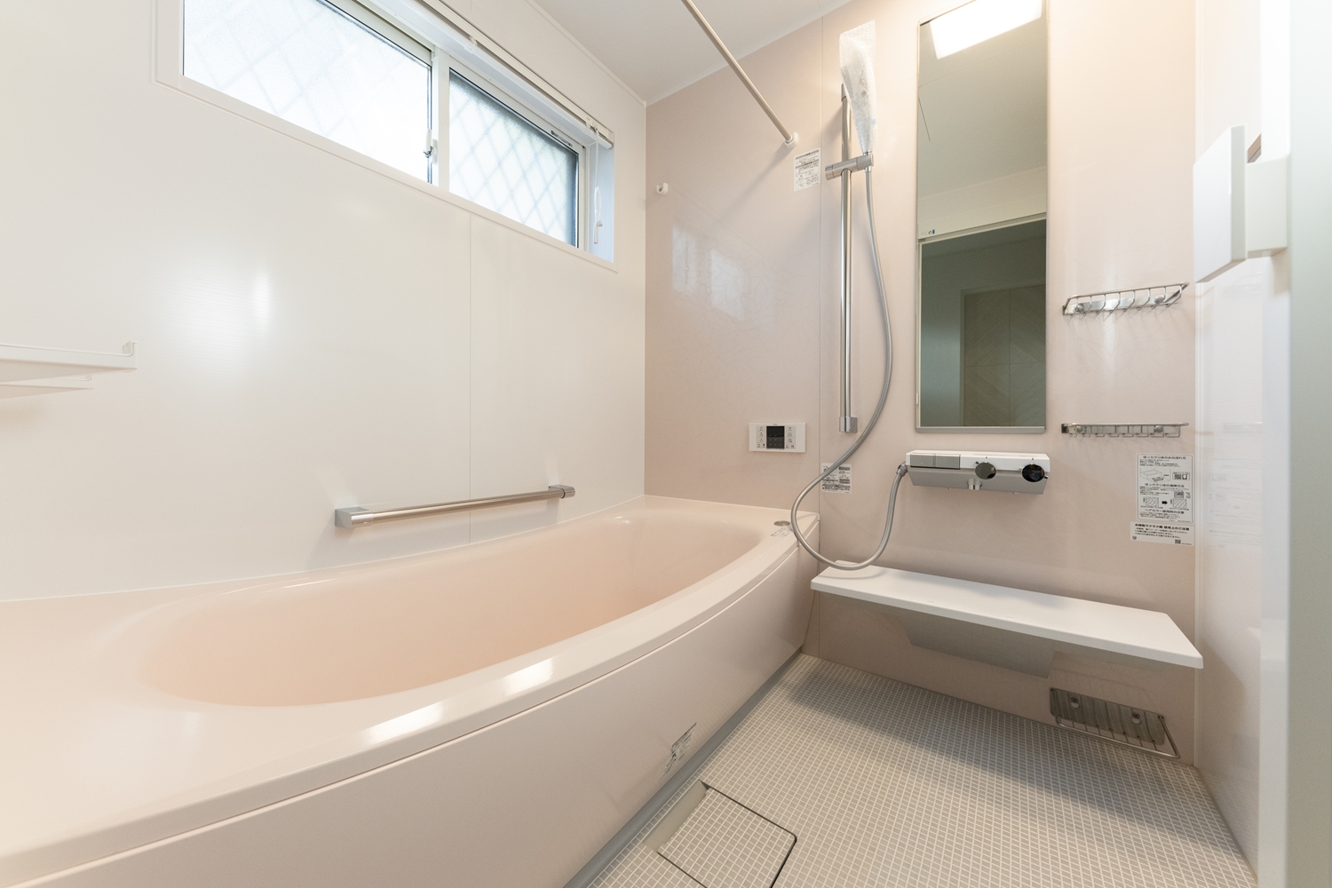 上品で華やかなピンクの花がモチーフのアクセントクロスを施しました。浴槽もピンクで合わせて、やわらかな印象のバスルームになりました♪