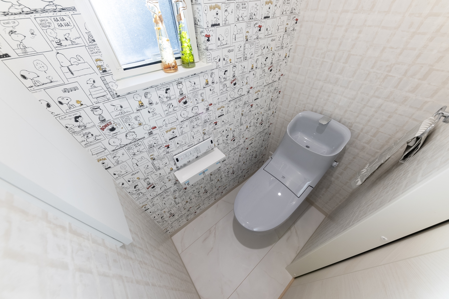 ポップなキャラクターデザインのクロスとスタイリッシュな柄のクロスを組合せた明るく楽しい気分になる2階トイレ♪