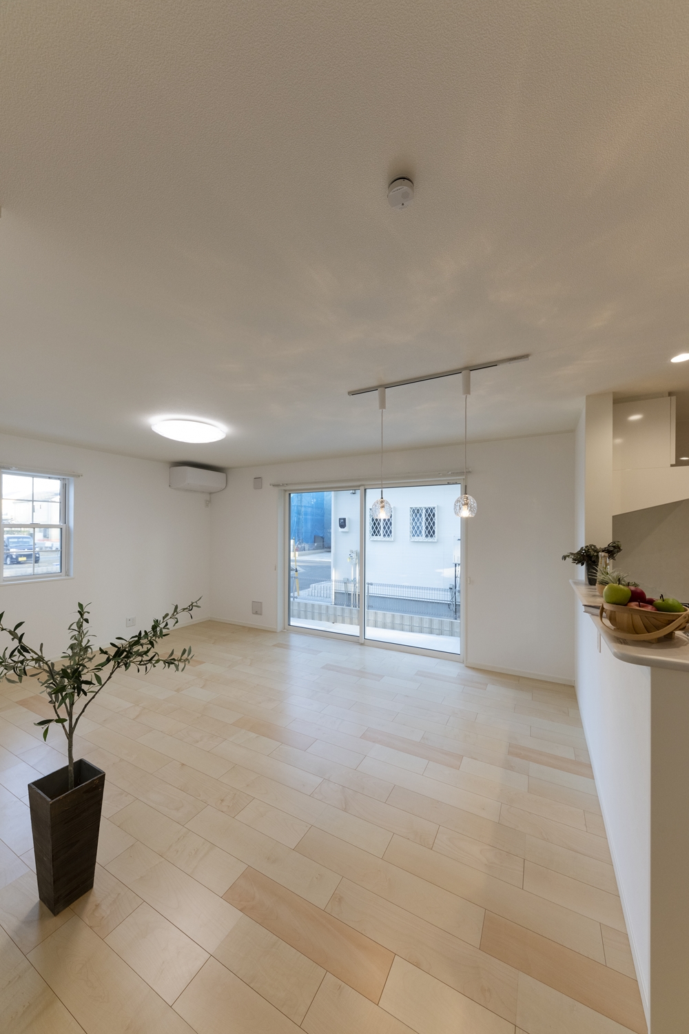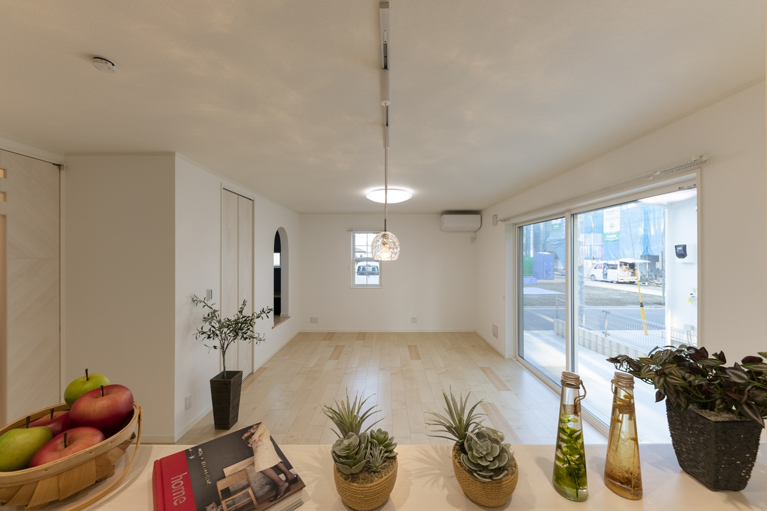 大きな窓から自然のやさしい光が降り注ぐ、明るく開放的なリビングダイニング。