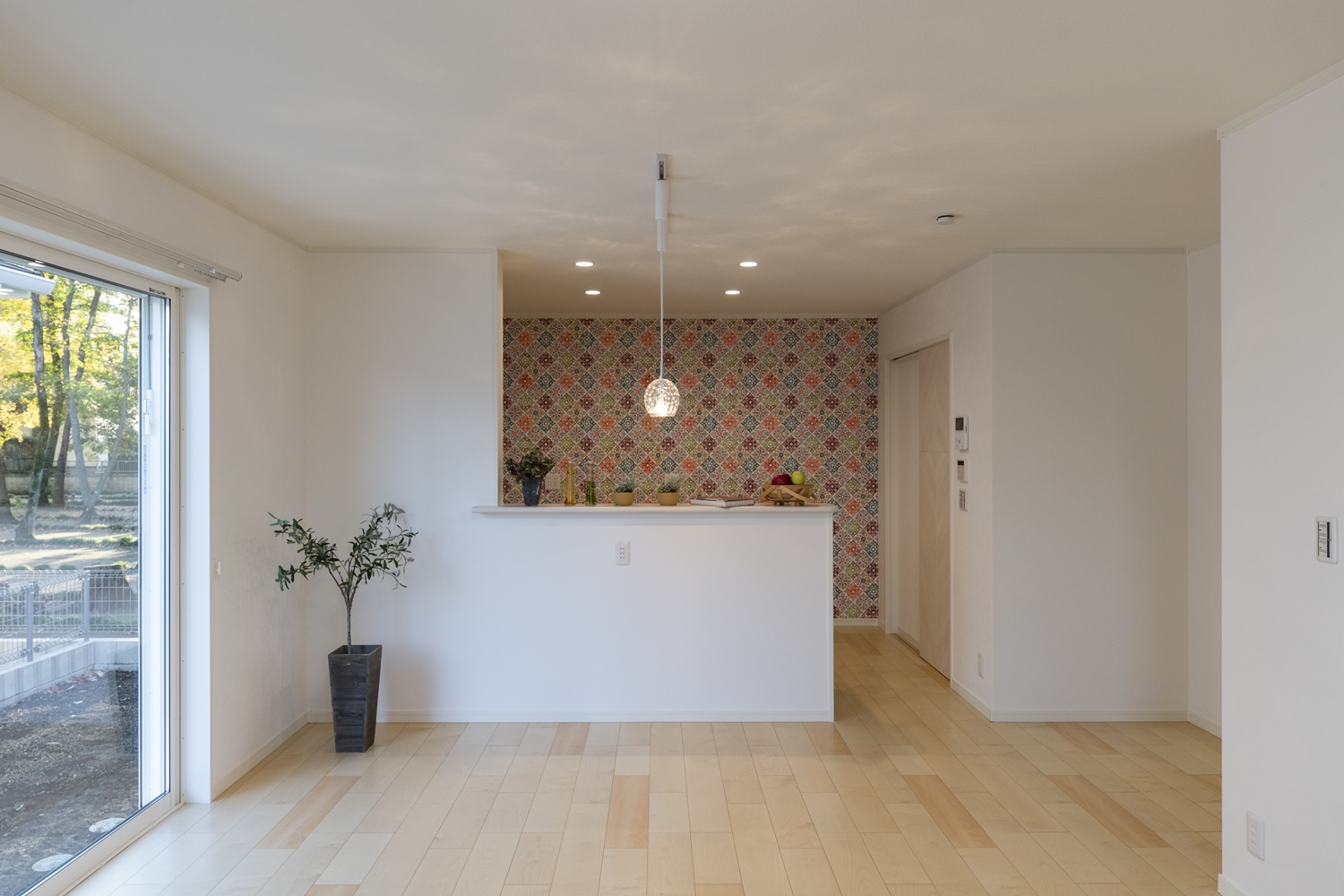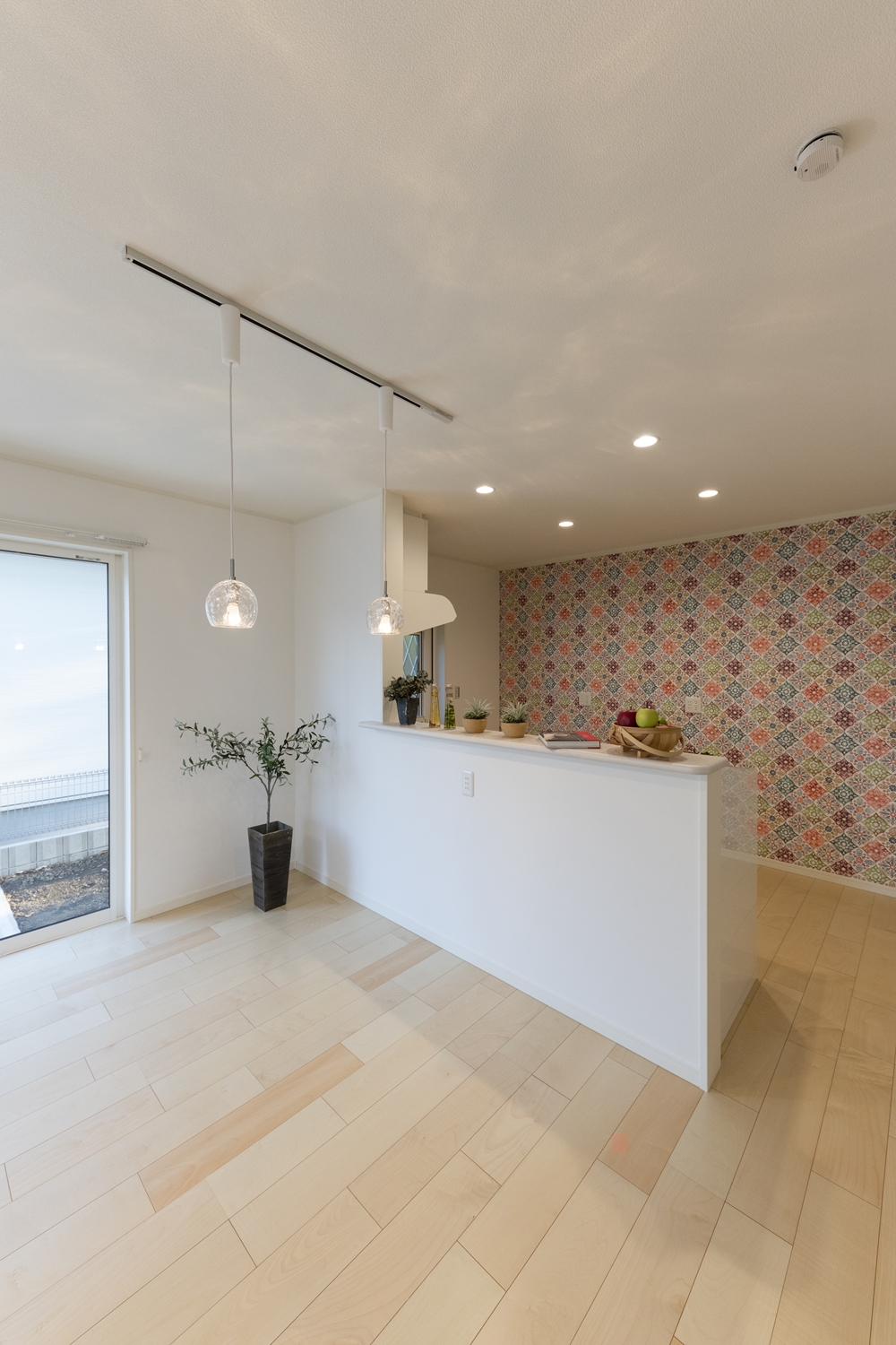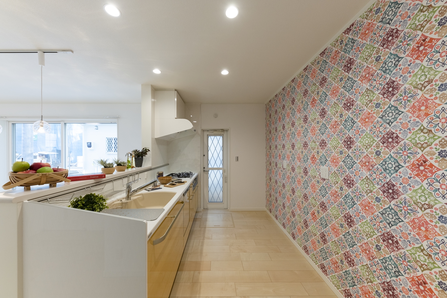 キッチン背面にポップで明るい北欧風のアクセントクロスを施してお部屋にワンポイントをプラスさせました♪