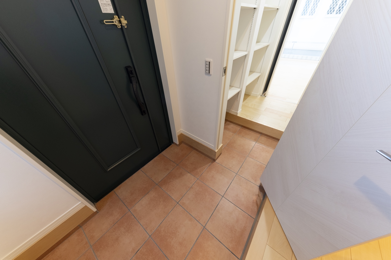 深みのあるグリーンの玄関ドアに、レッドのテラコッタ調タイルを施した、北欧風の温かみのある玄関。