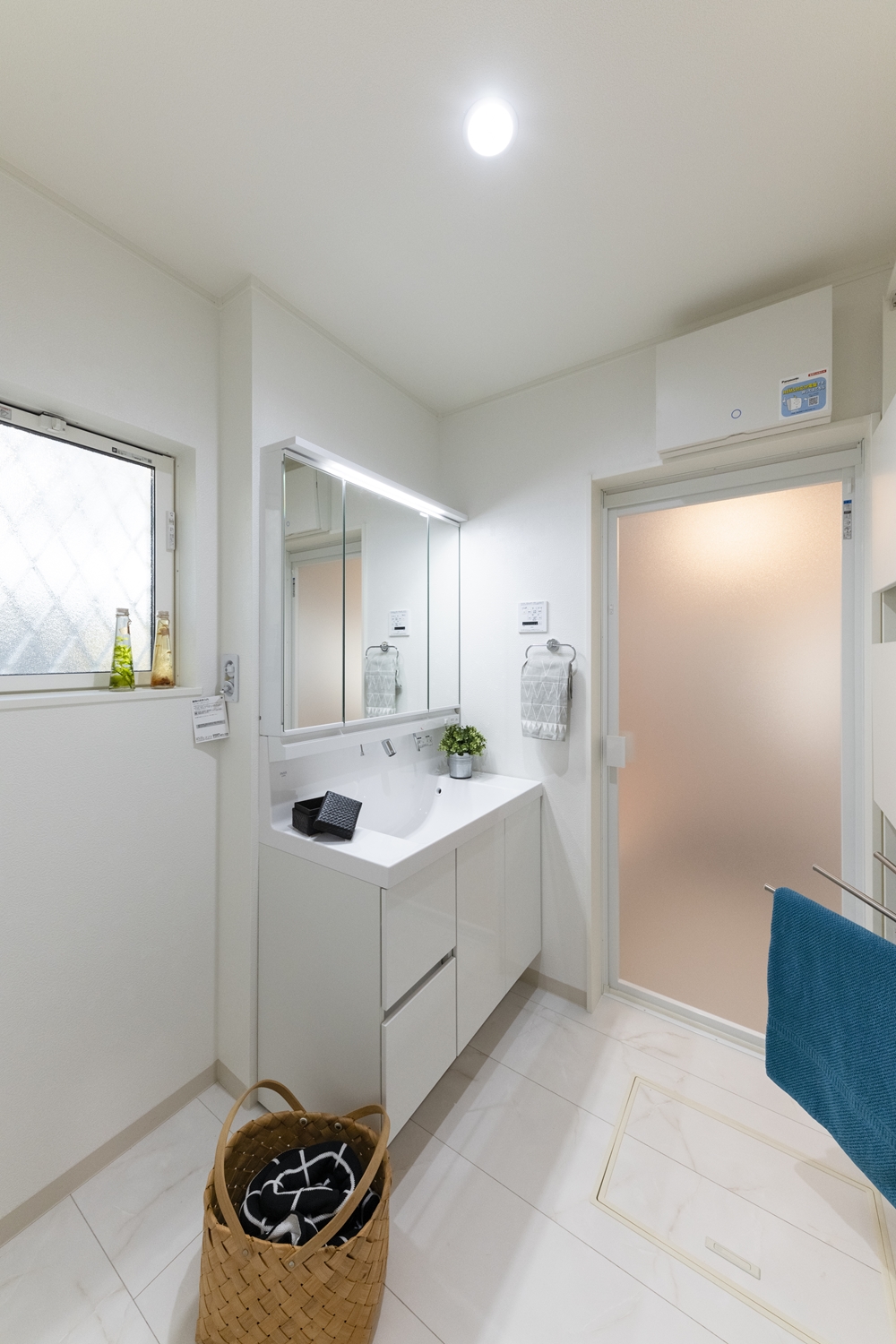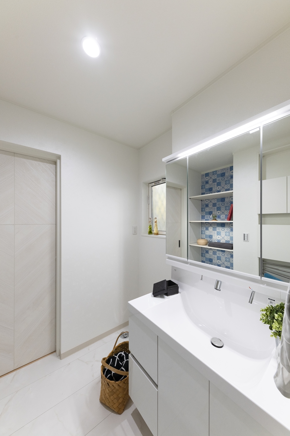 サニタリールーム/タオルや洗剤等をたっぷり収納できるリネン棚を設置しました。モロッコタイル柄のアクセントクロスが印象的です。