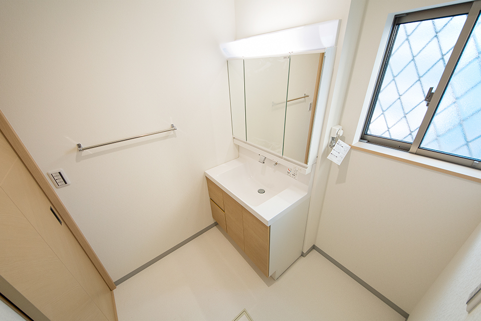 明るいメープル調の洗面化粧台と織物調の白いクロスが明るく清潔感ある洗面室を演出。