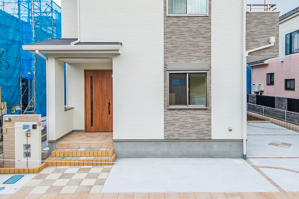 アイアンブラックの把手を配したミディアムチェリーの玄関ドアとオレンジ色のタイルがファサードのアクセントとなり、鮮やかな印象を与えます。