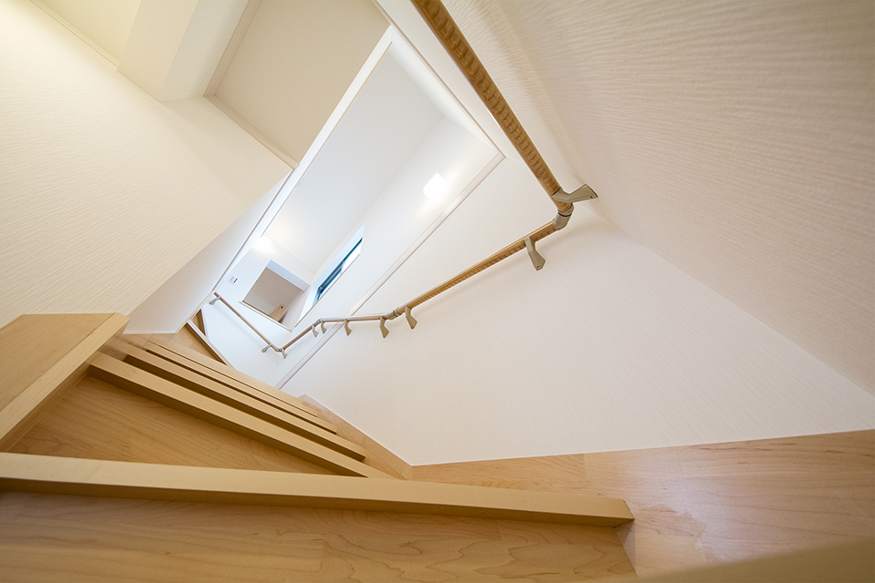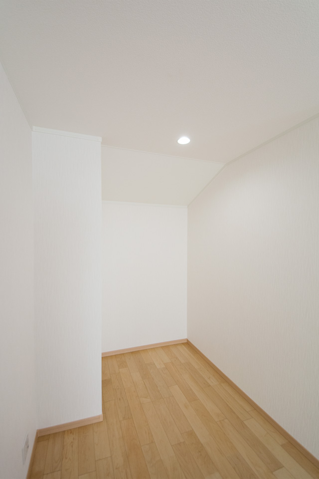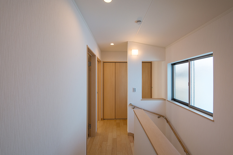 開放感ある2階廊下。奥には収納に便利な納戸を設置。