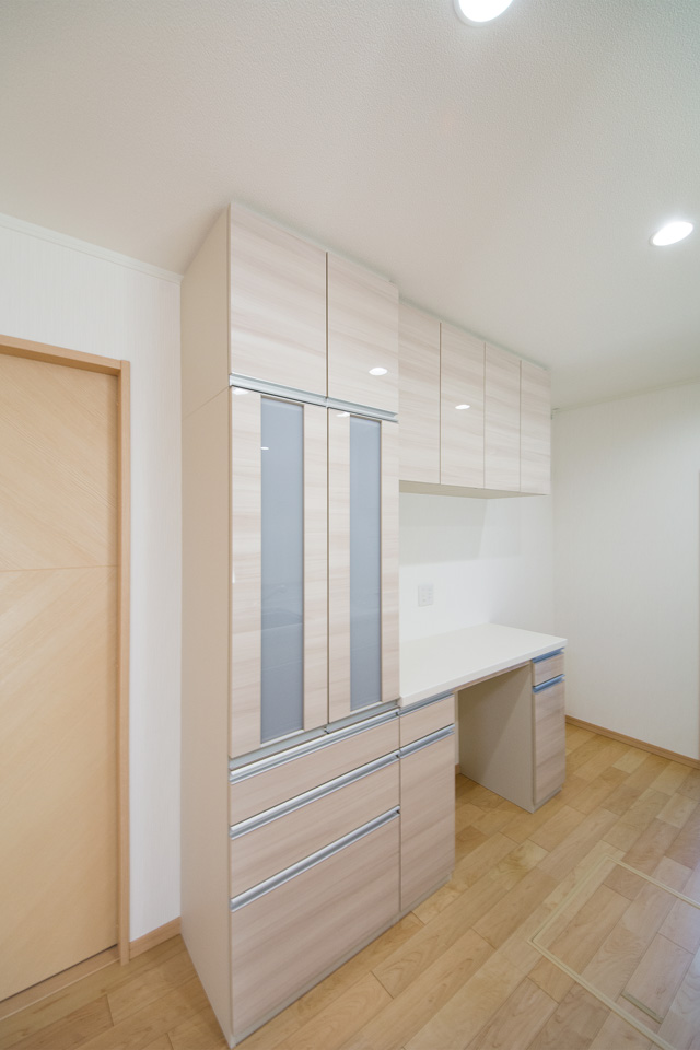 キッチン背面にはキッチンと同じ配色のカップボードを設置。