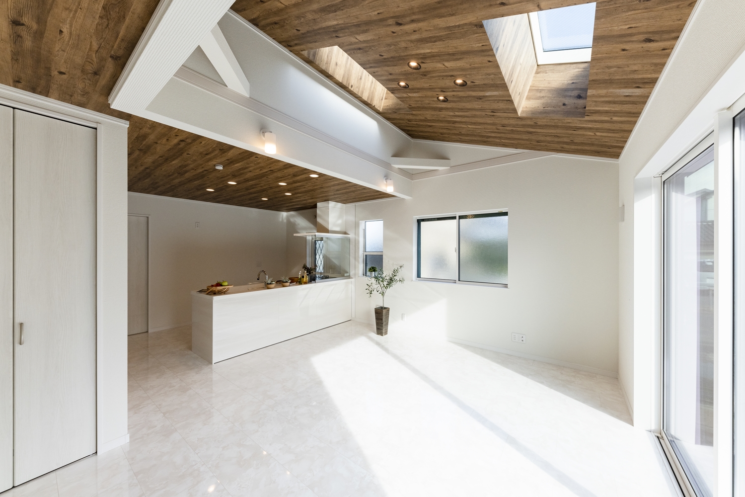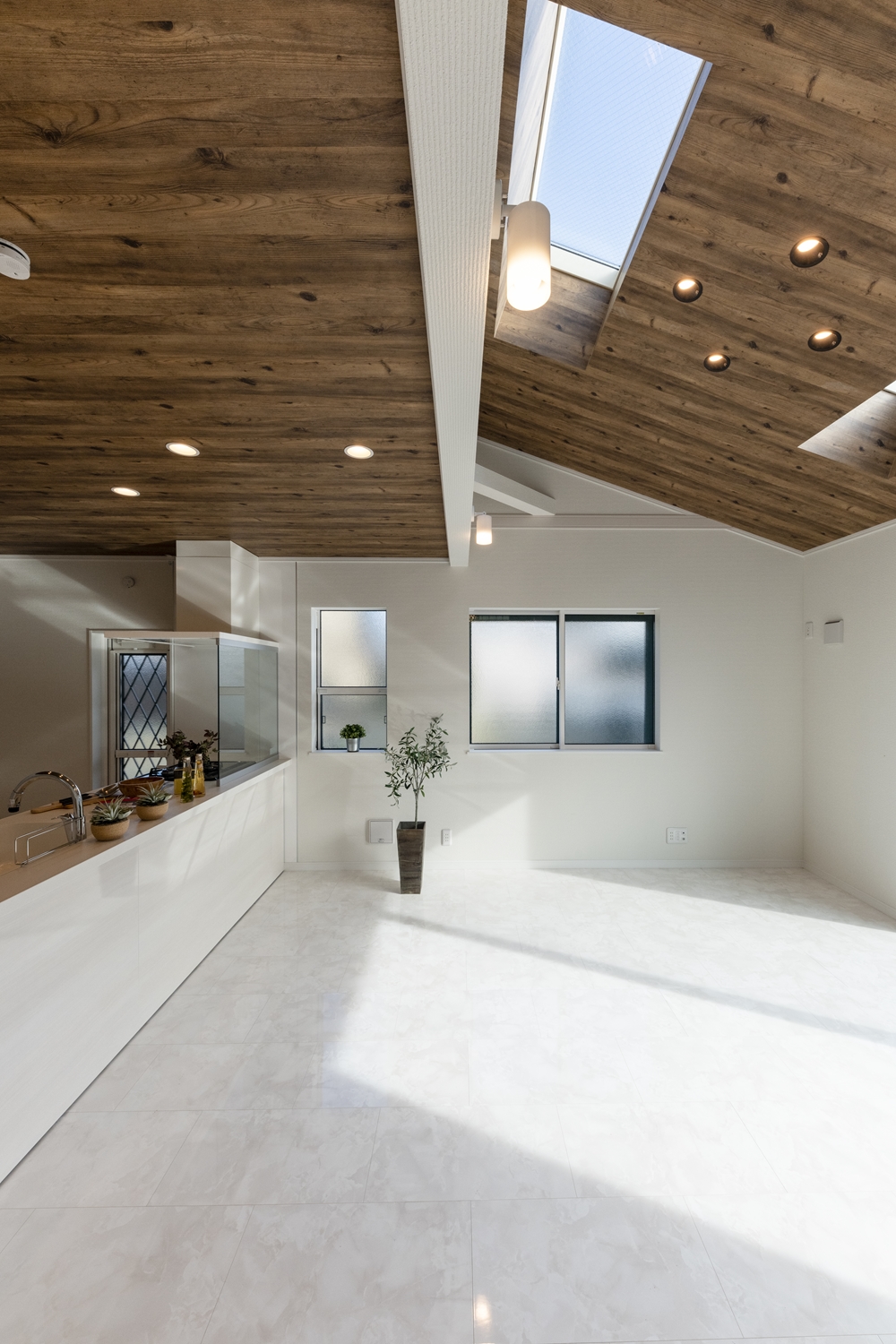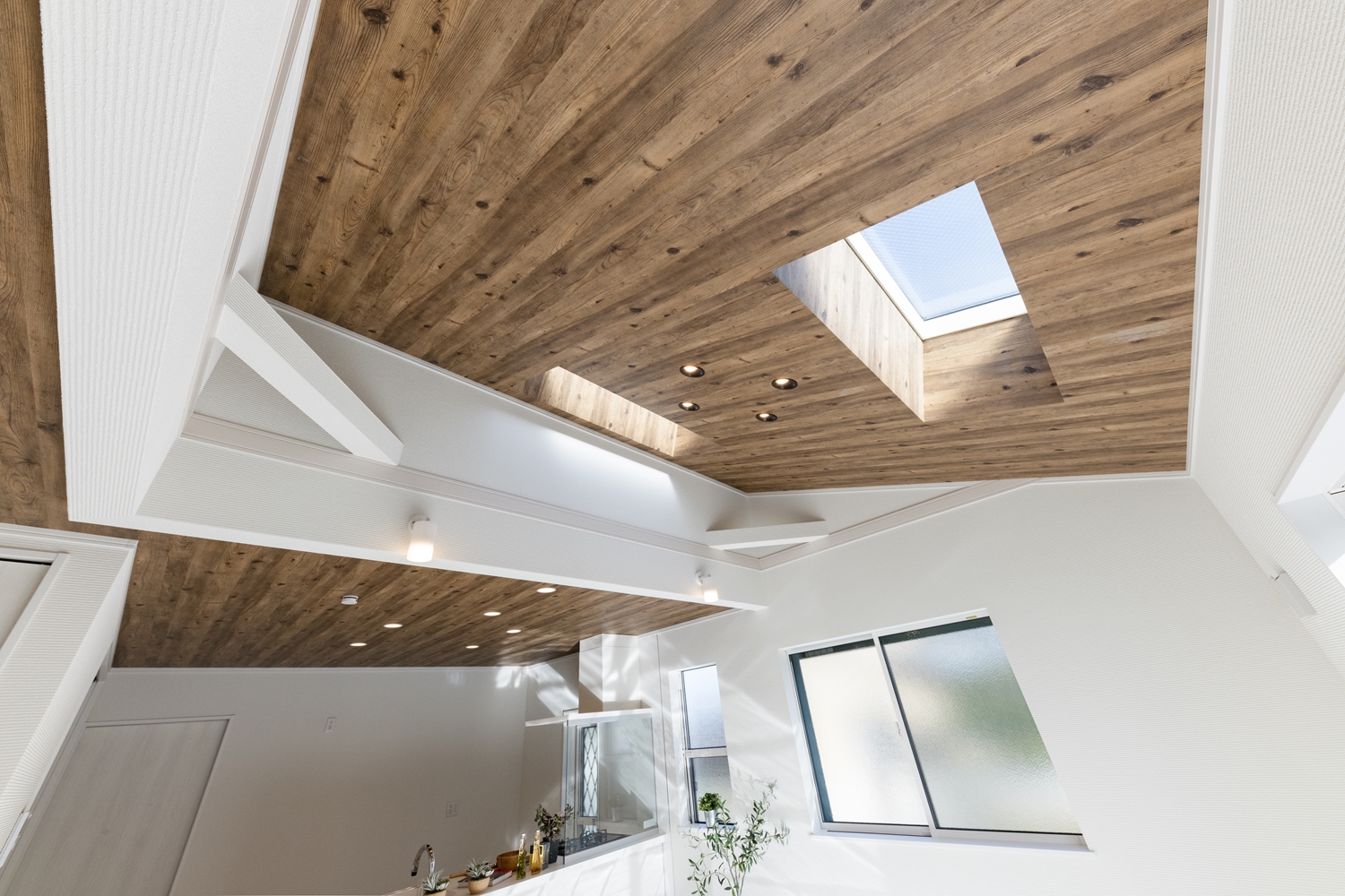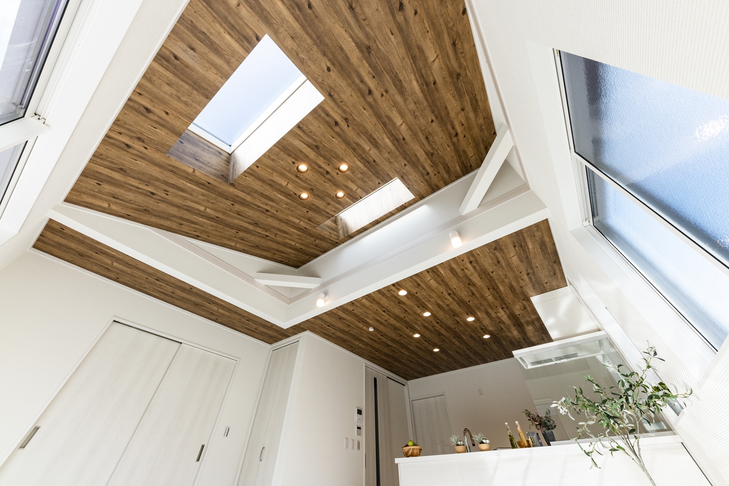 オリジナリティーあふれる外観はこだわりのライトアップで、夜にはより魅力的になります。室内はトップライトや窓からの光がお部屋全体を包み込み、夜はダウンライトやおしゃれな照明が空間を彩るラグジュアリーな空間に。快適で独創的、素敵なデザイナーズハウスが完成しました。
