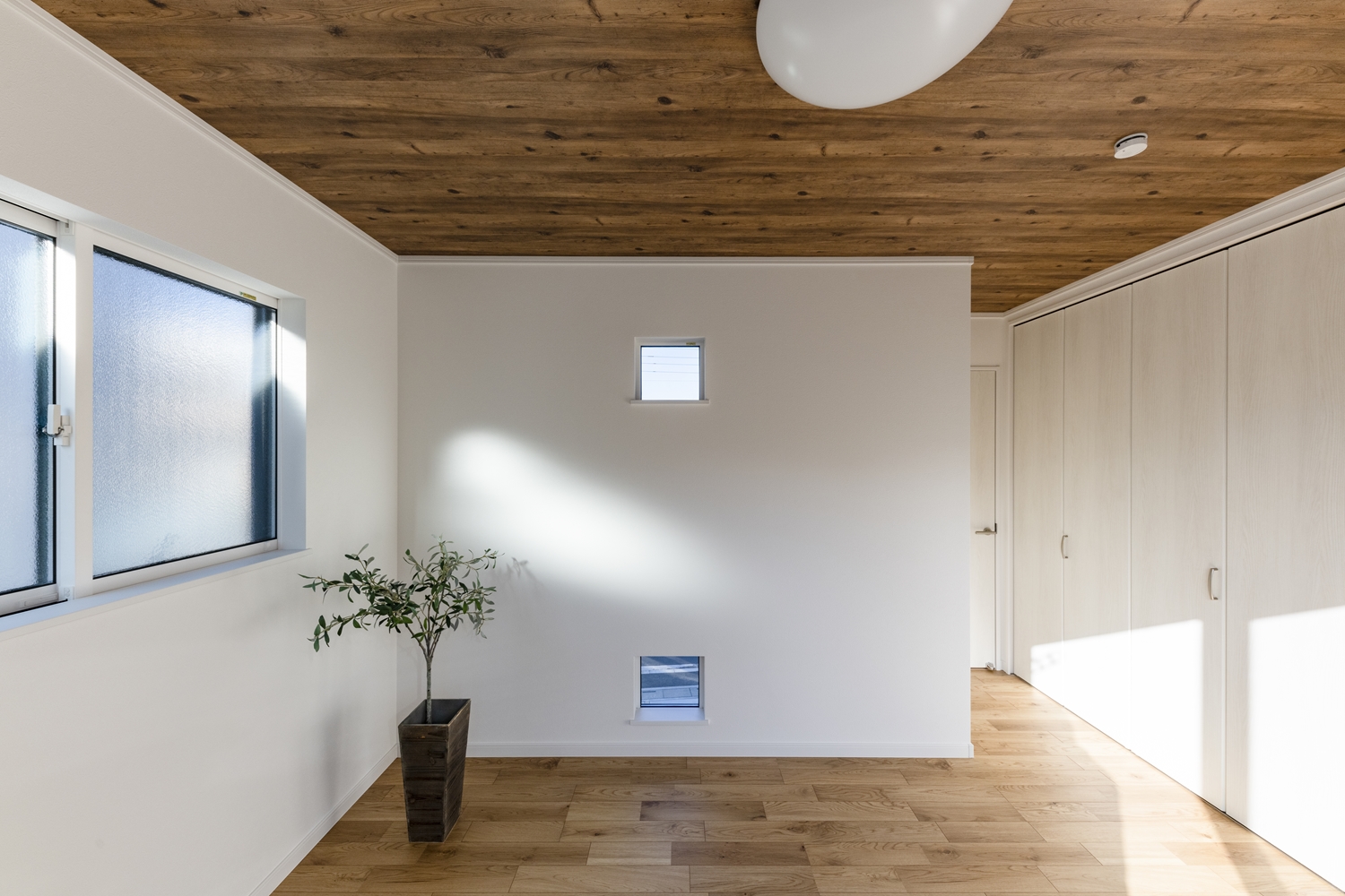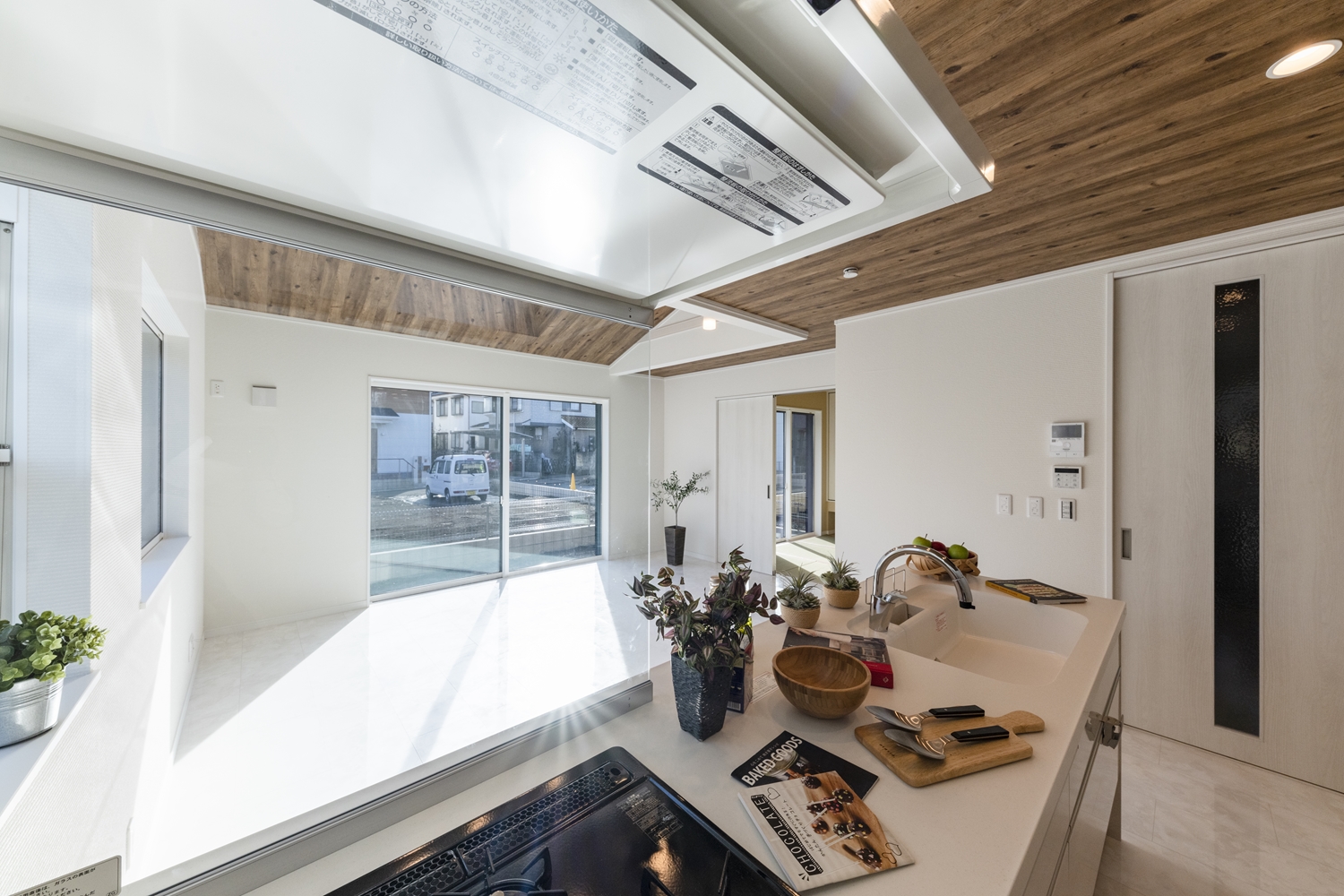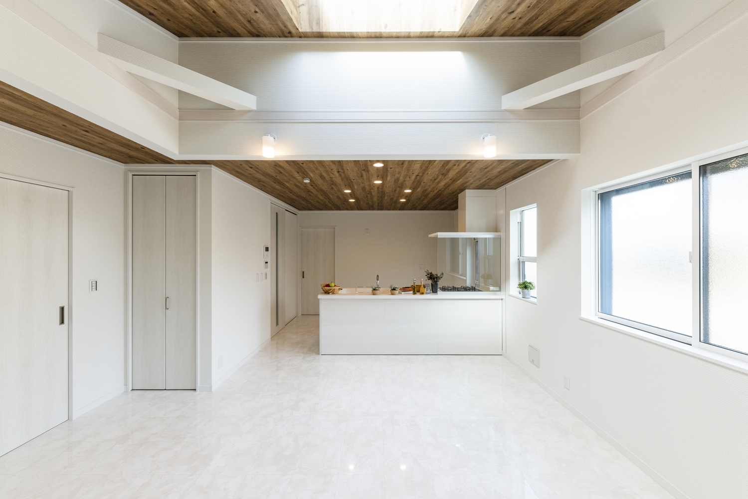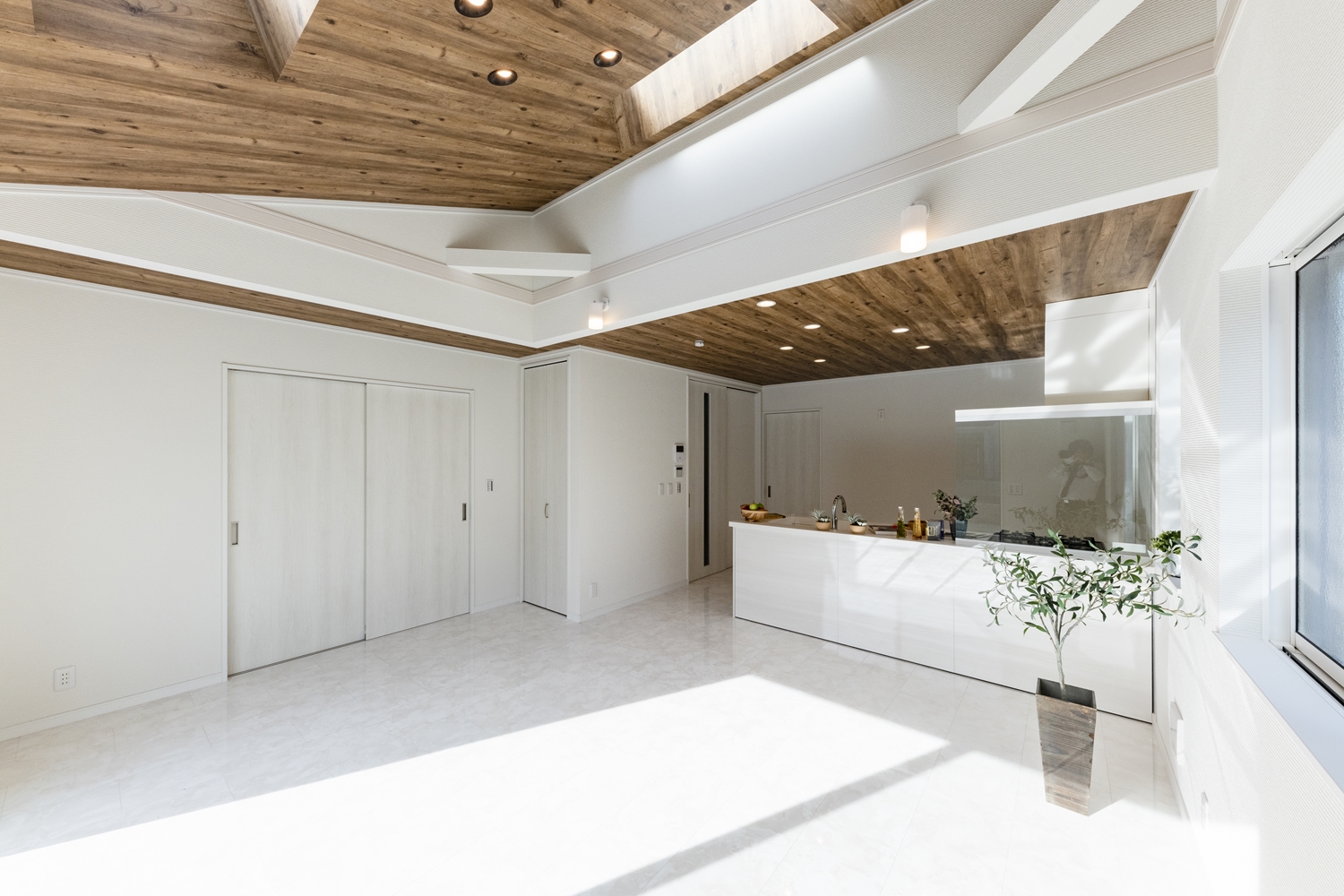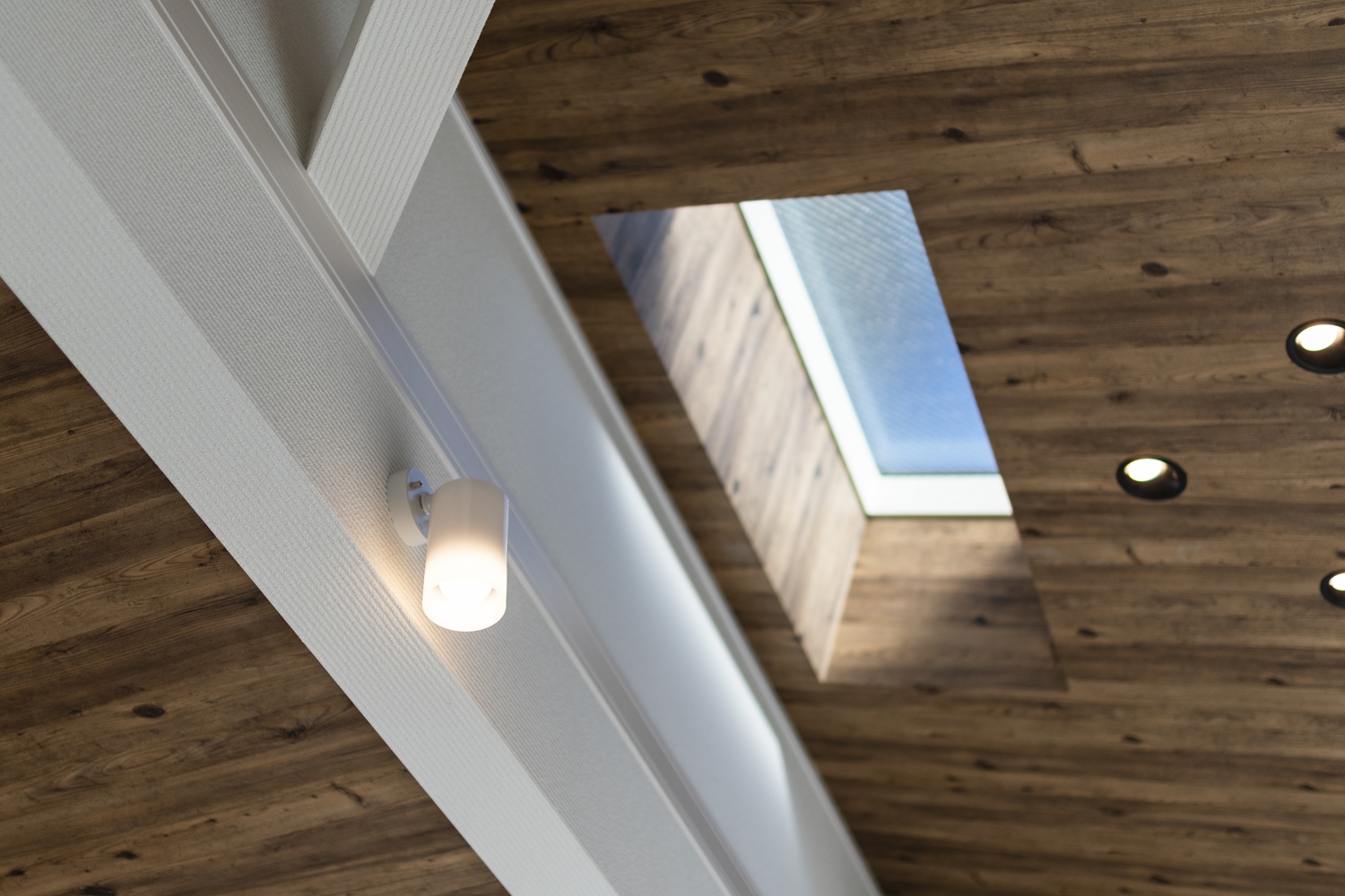 オリジナリティーあふれる外観はこだわりのライトアップで、夜にはより魅力的になります。室内はトップライトや窓からの光がお部屋全体を包み込み、夜はダウンライトやおしゃれな照明が空間を彩るラグジュアリーな空間に。快適で独創的、素敵なデザイナーズハウスが完成しました。