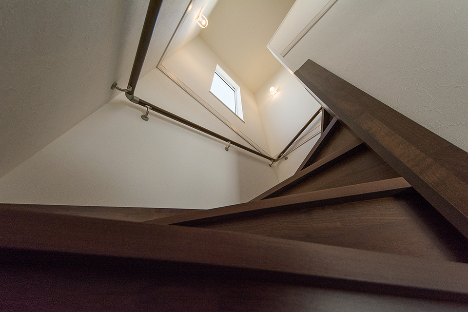 豊かな凹凸と質感、深い陰影感で多彩な表情を見せる白の外壁に、濃いブラウンハンドレールがファサードのアクセントとなり、格調ある雰囲気を醸し出しています。