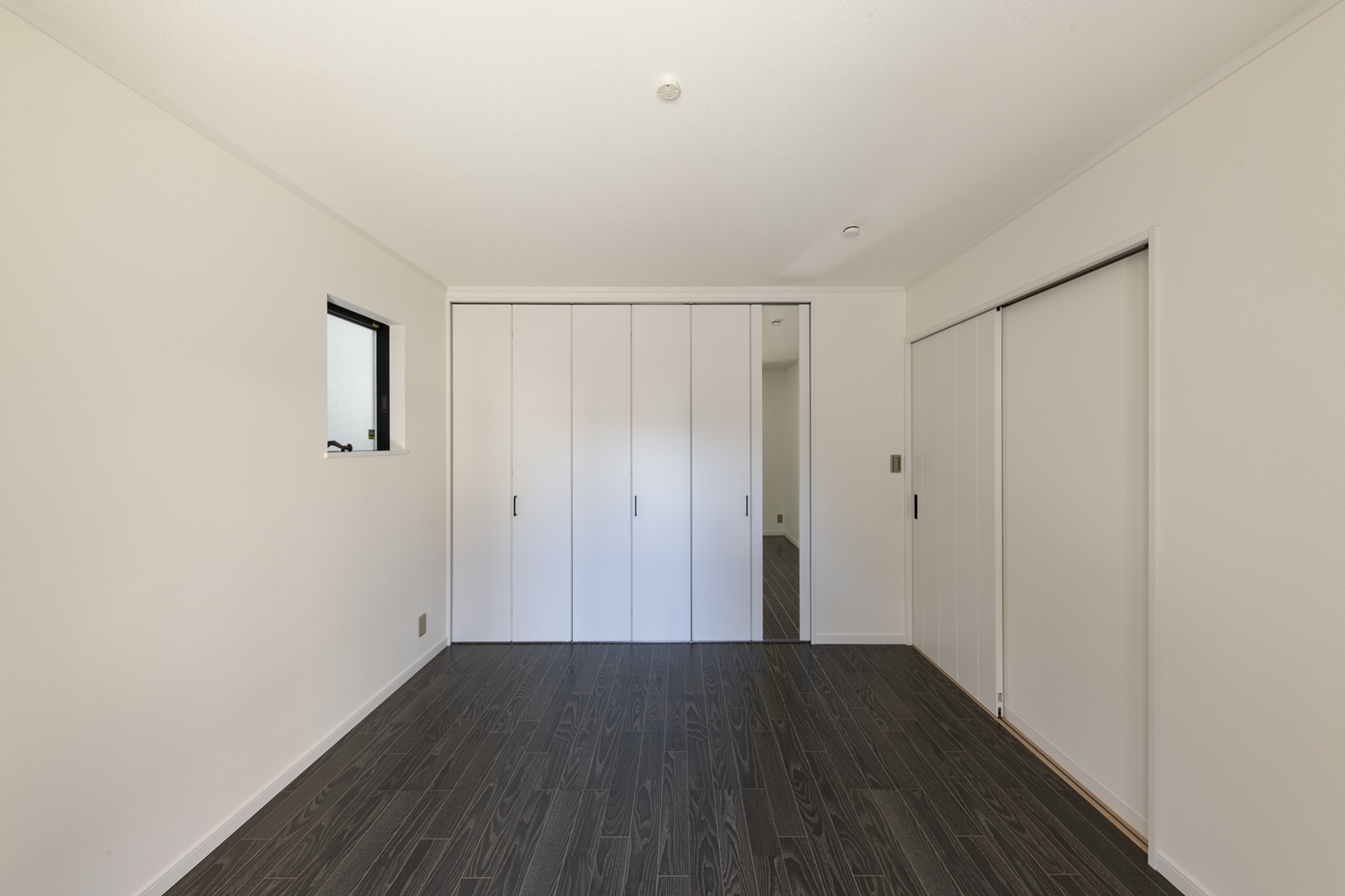 1階洋室/壁の白さとブラックウォルナットのフローリングのコントラストが印象的な清涼感のあるお部屋。