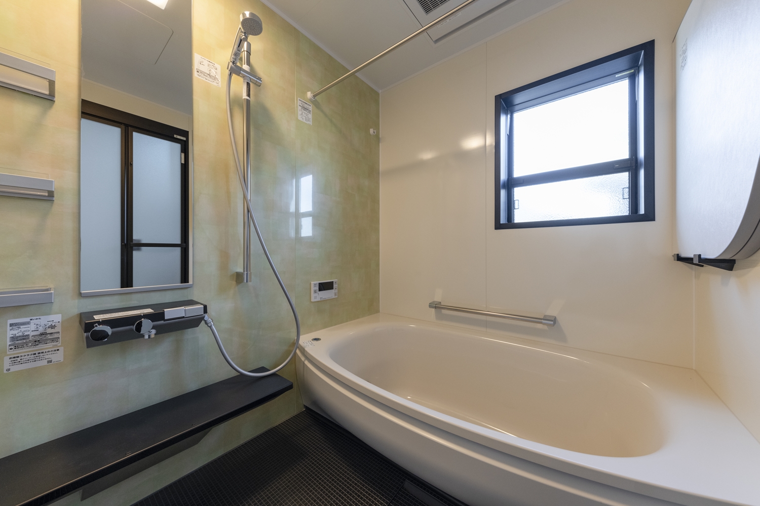 バスルーム/色の重ねやにじみの技法を使い透明感を表現したアクセントパネルが、やさしく和やかな空間を演出。