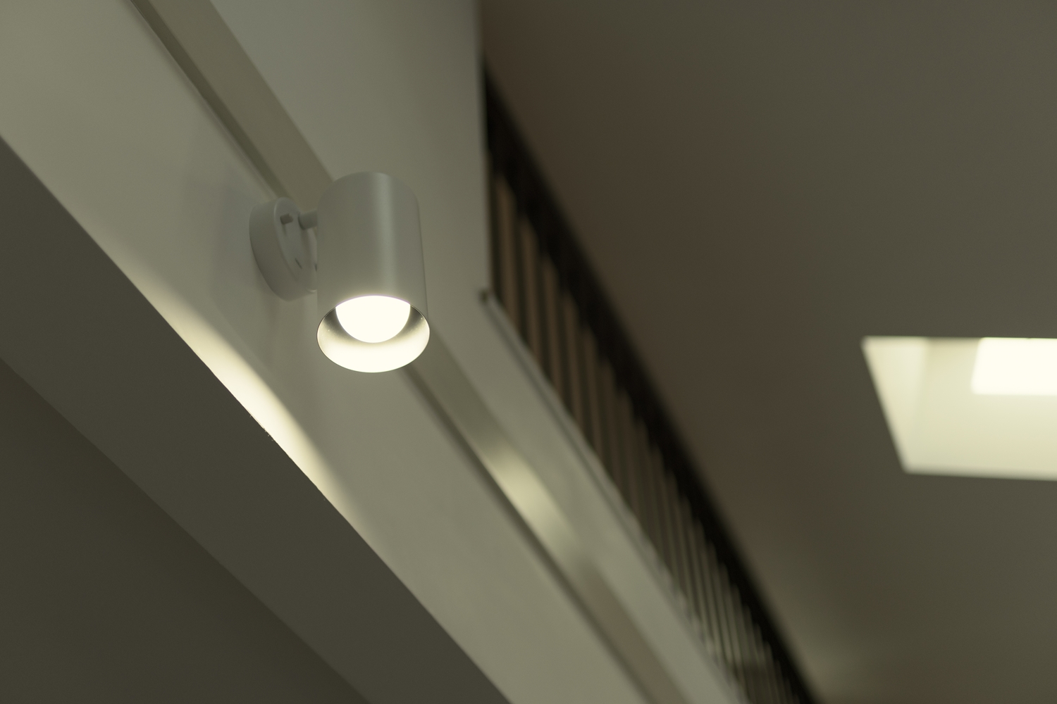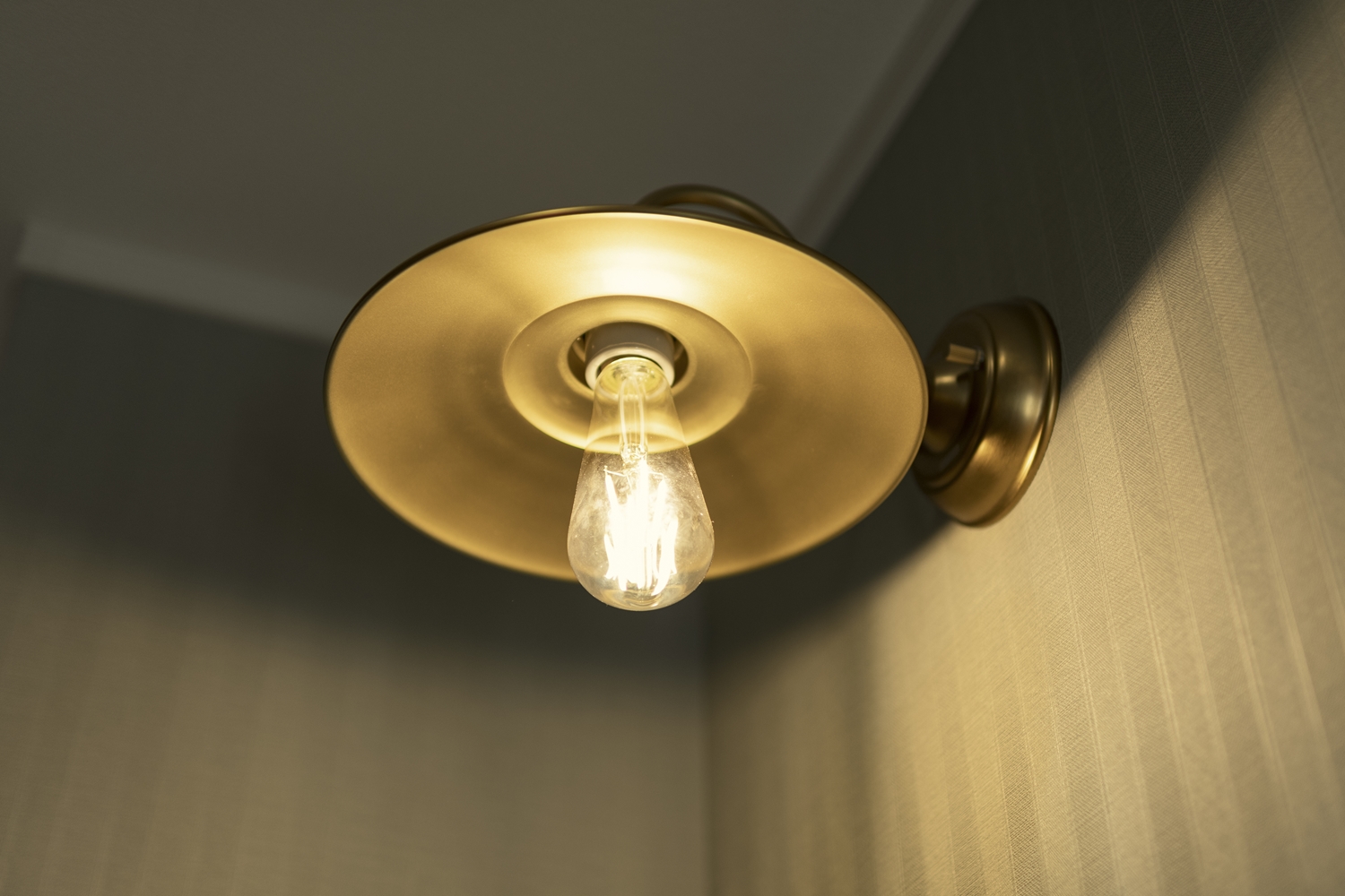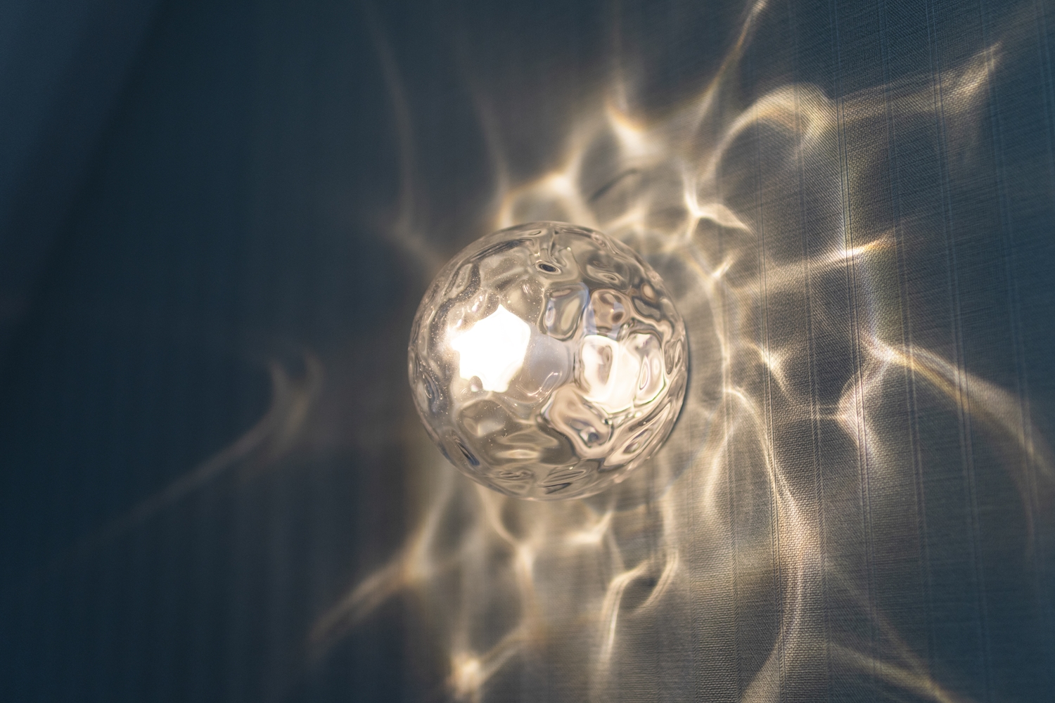階段/ゆらめく水面をイメージしたブラケットライトが、温かみのある光とキラキラとした陰影が幻想的な空間を演出。